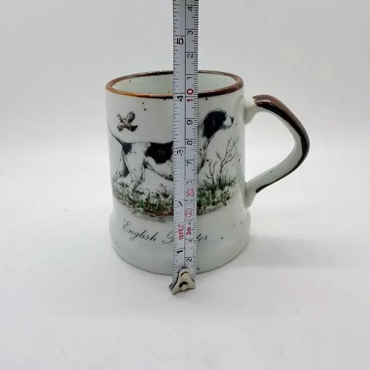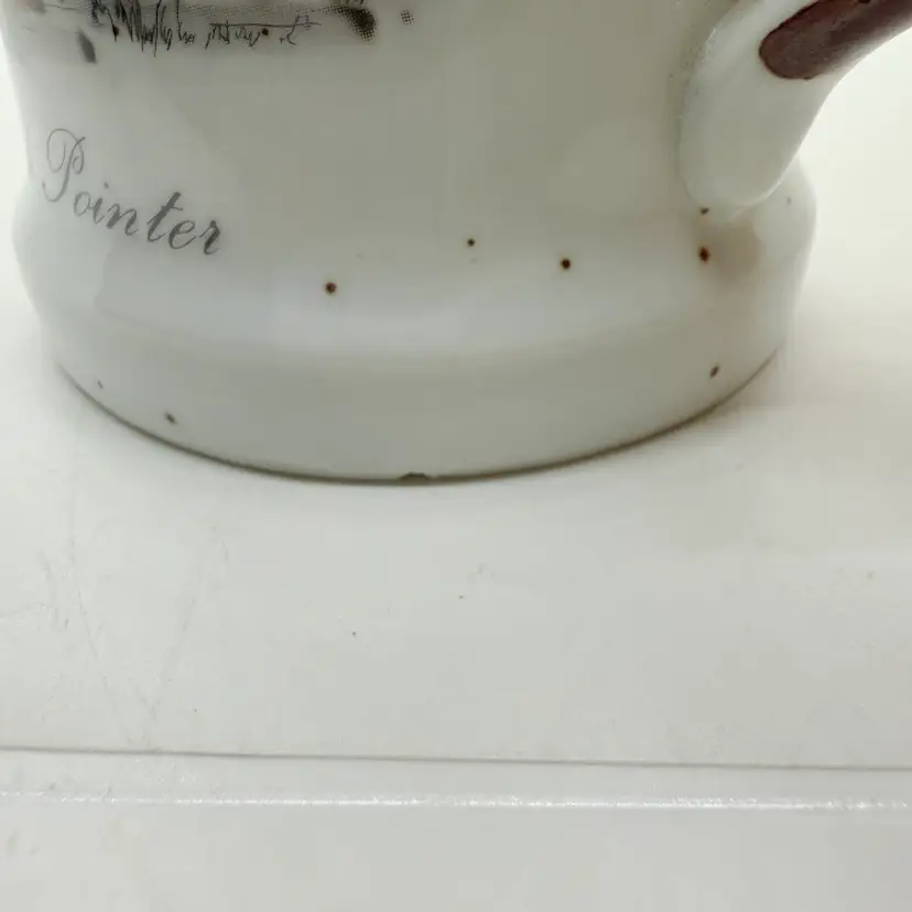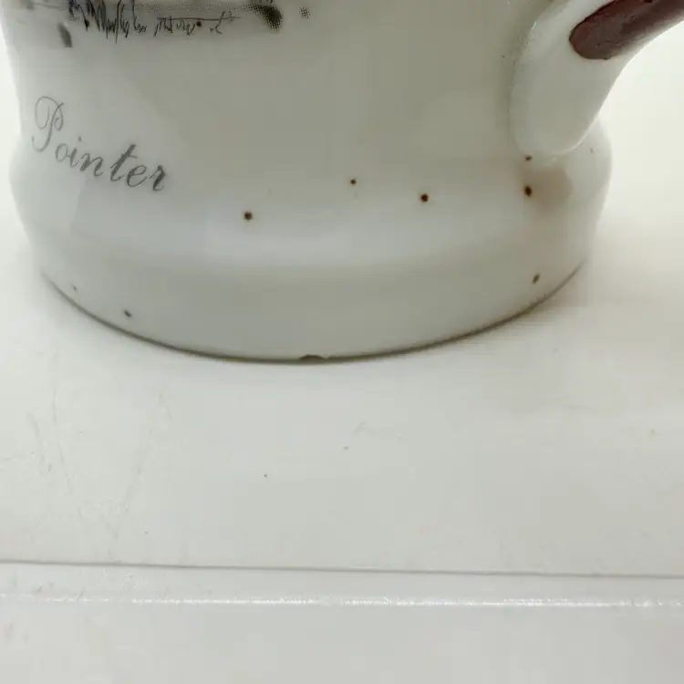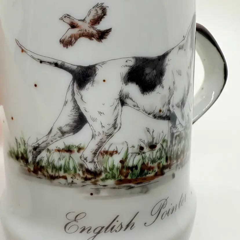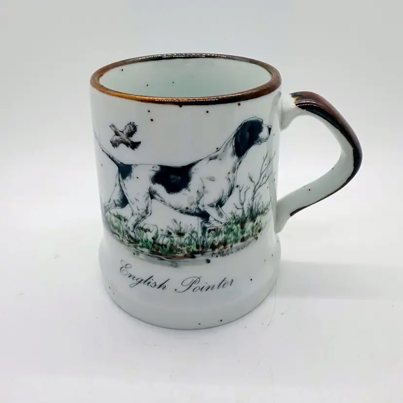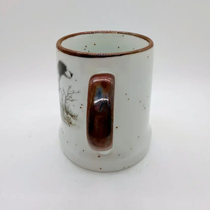 Vintage Speckled Beige & Brown Stoneware Mug English Pointer Hunting Dog. Signs of wear and use. There are two small chips on the bottom edge. Light scratching and scuffing. Please see pictures. Sold as is.