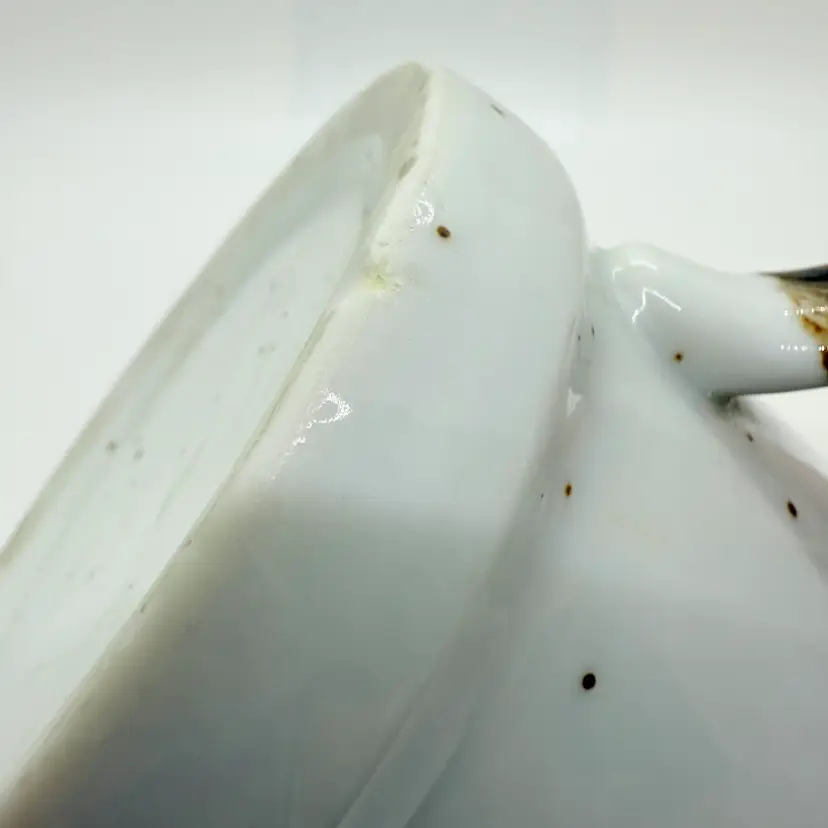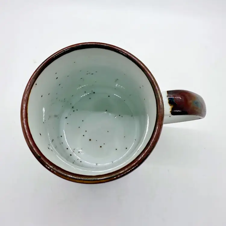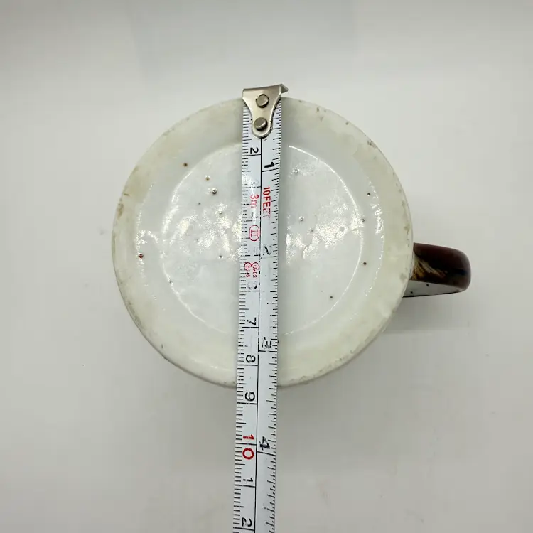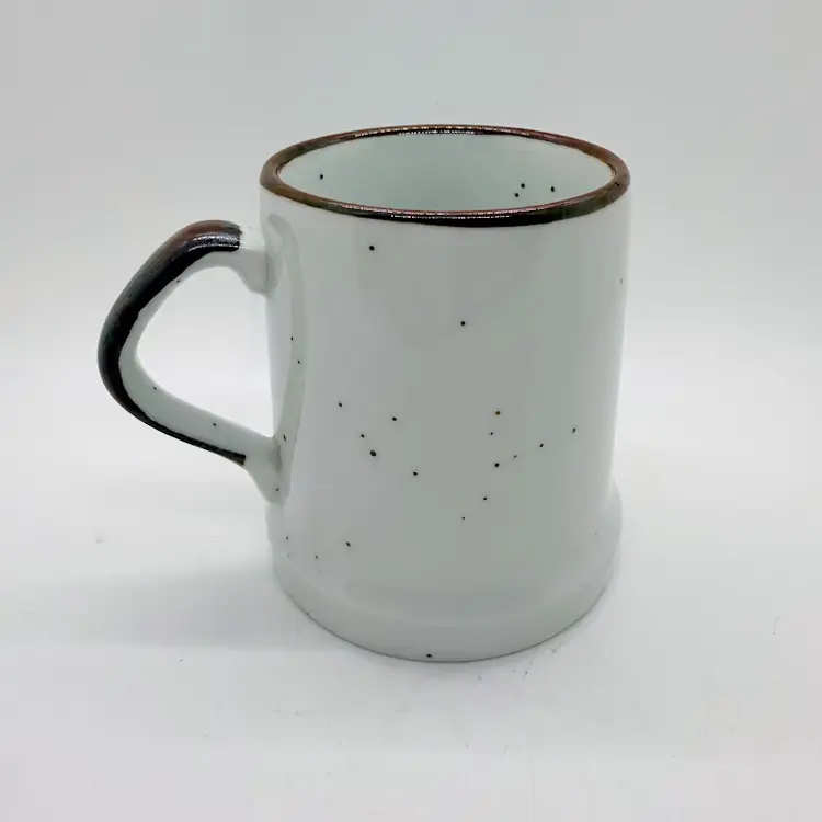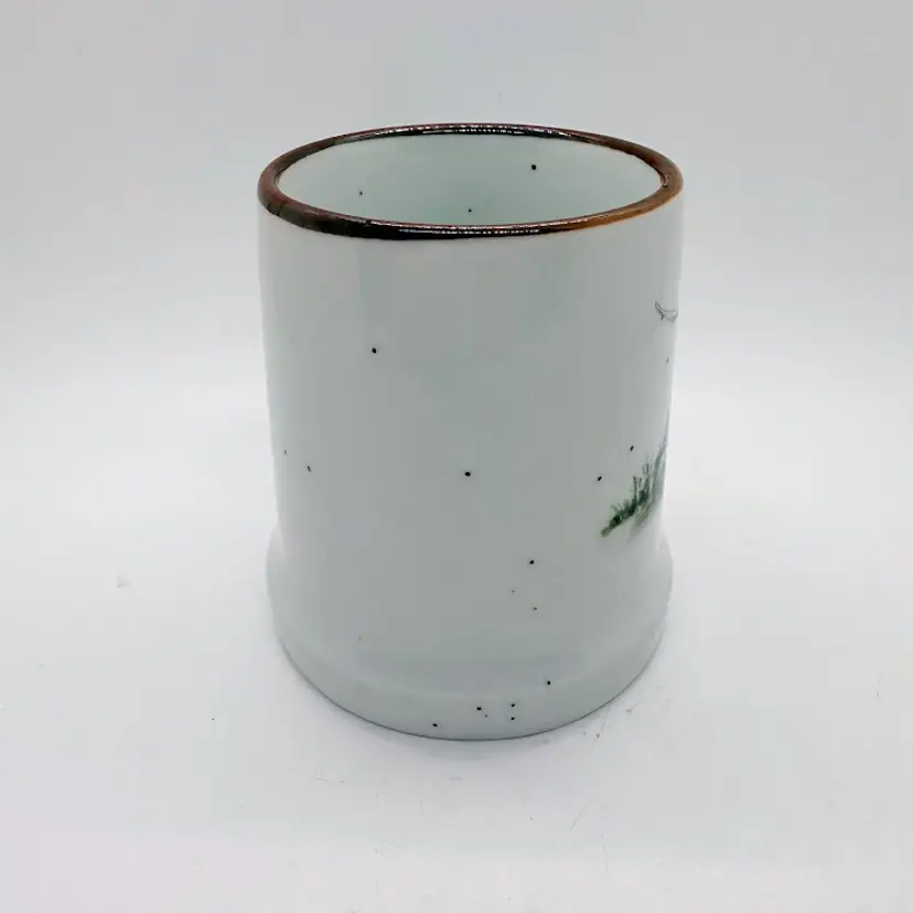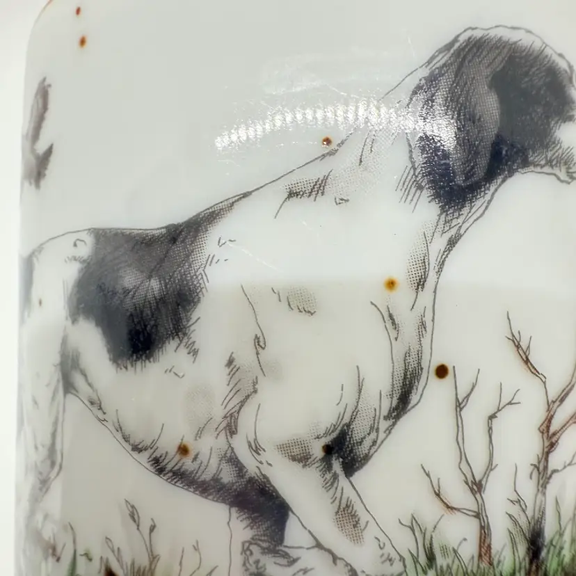 Vintage Speckled Beige & Brown Stoneware Mug English Pointer Hunting Dog. Signs of wear and use. There are two small chips on the bottom edge. Light scratching and scuffing. Please see pictures. Sold as is.