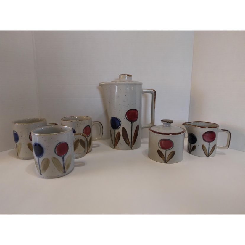 Vintage Speckled Stoneware Hand Painted Tea Pot Mugs Sugar Creamer Set Japan. This is a grand little set! The tea pot with lid is approx. 8 inches tall and 3.5 inches in diameter at the base. The 3 mugs are approx. 3.5 inches tall and 3 inches tall at the rim and they hold approx. 8 ounces. The sugar with lid is approx. 3 3/4 inches tall and 3 1/3 inches in diameter. The creamer is approx. 3 inches tall and 2 3/4 inches in diameter. No chips, cracks or crazing. Please see photos. I am a careful and experienced shipper.