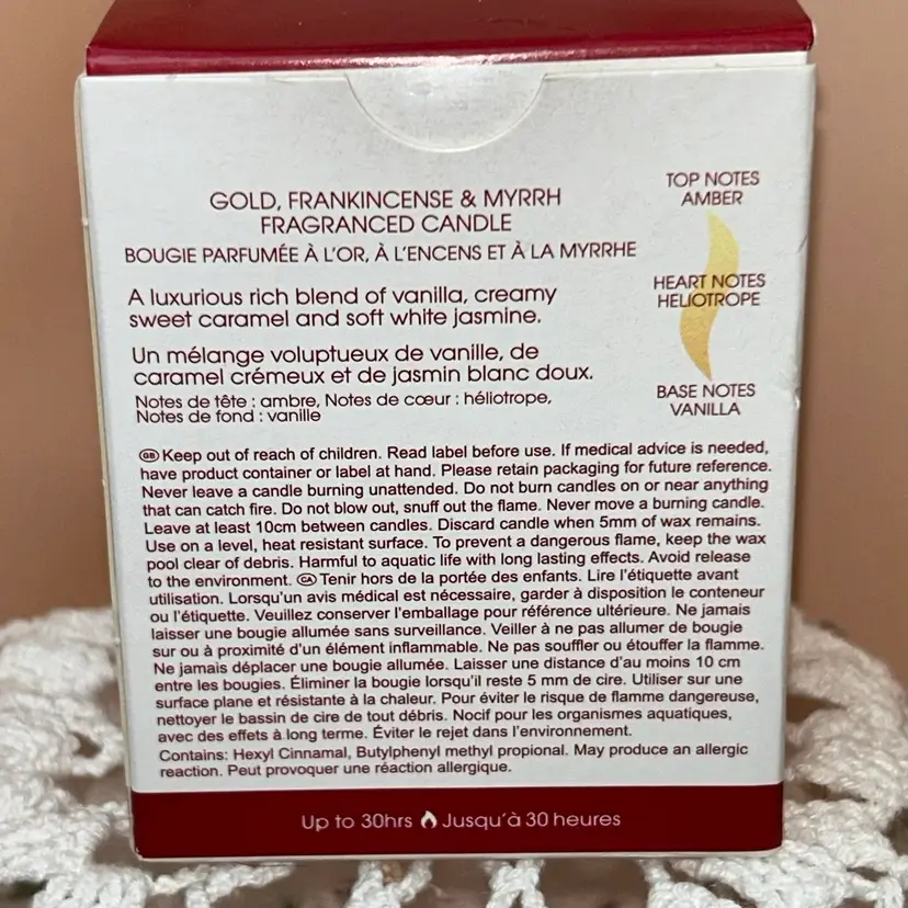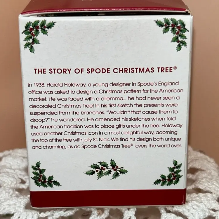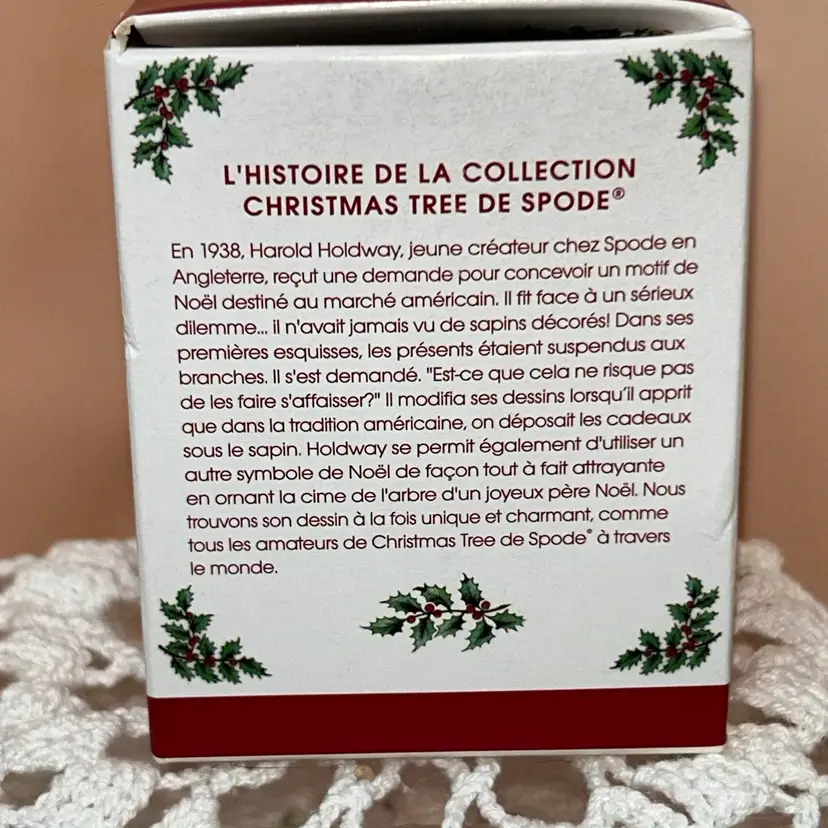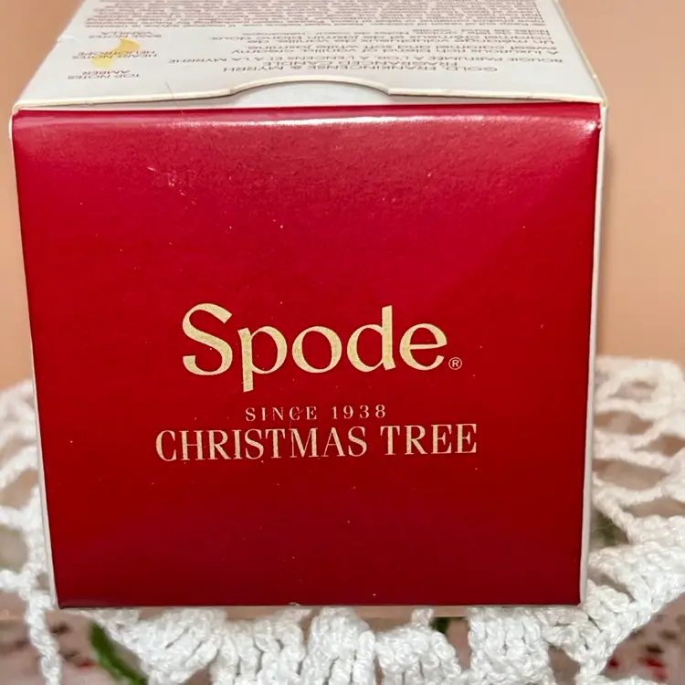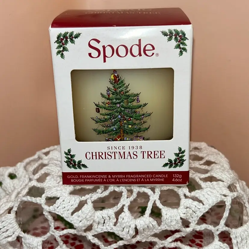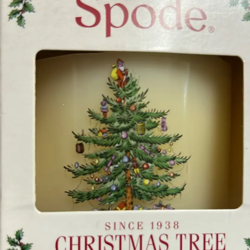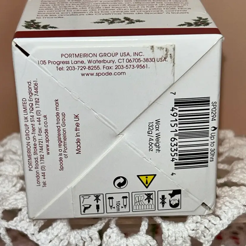 4.6 ounces of candle. Made in the UK. Approximately 3 5/8” tall and 2.5” diameter. New. Never burned. The story of the Spode Christmas Tree is printed on the box.
