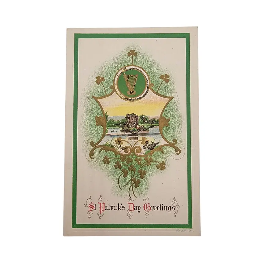 This charming postcard captures the spirit of St. Patrick's Day with its vibrant green and gold hues. Its embossed design evokes a sense of nostalgia, while the handwritten note on the back whispers stories of a bygone era. A delightful piece of history, perfect for collectors or those cherishing festive traditions.