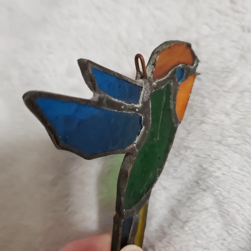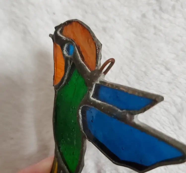 Vintage handmade stained glass suncatcher signed "Dalkin 80,". This is in good vintage pre-owned condition. It does seem like it was made by a novice or hobbyist so it is a bit primitive with bubbles in the glass and some roughness to the metal trim, but personally I think that adds to the charm. I originally thought the beak was broken, but now I think it was made that way (see photos).