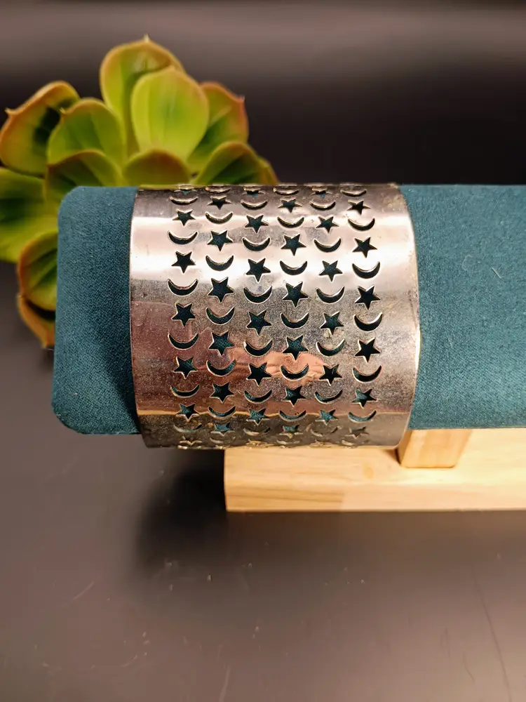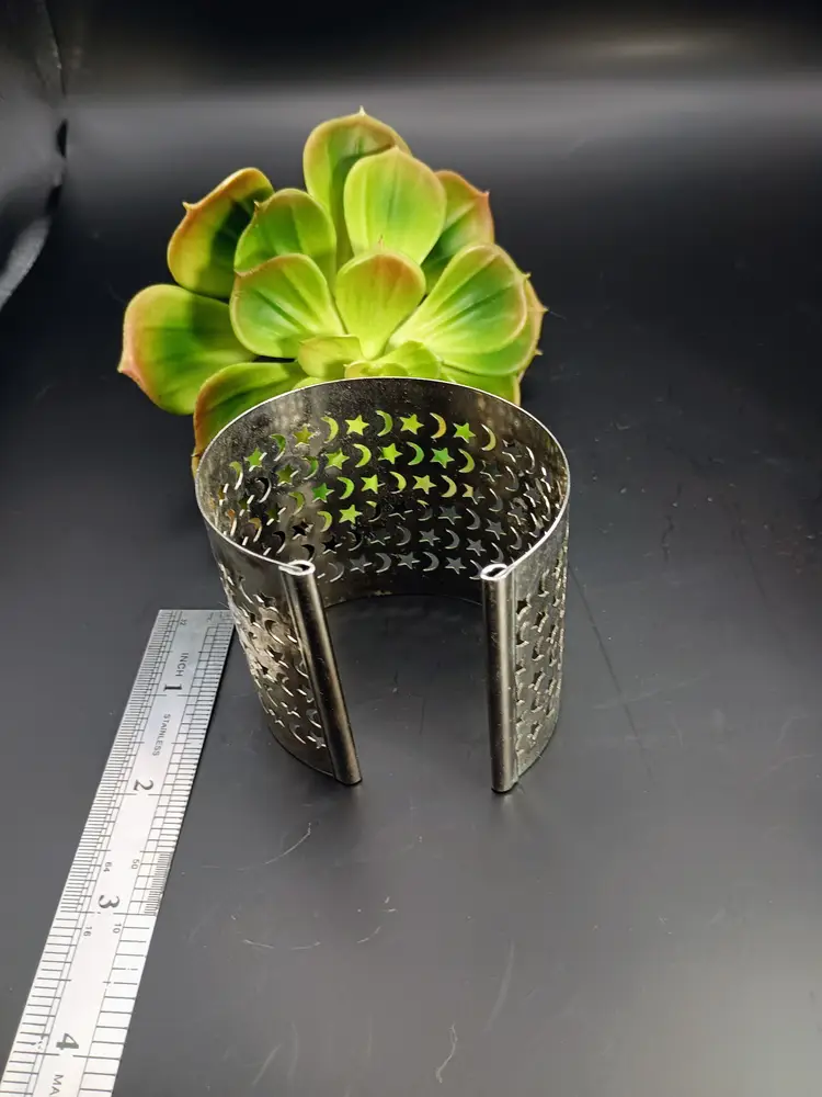 In this lot you will receive one vintage steel cuff bracelet. This piece was made in the 1950s. The diameter is about 3 inches. Please let me know if you have any questions.