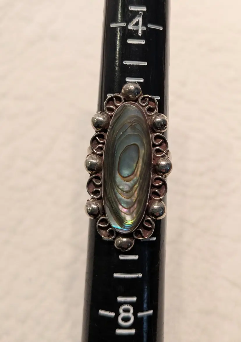 The front face of this ring is 1-5/8" long. Marked with an artist stamp and initials and Taxco Mexico.