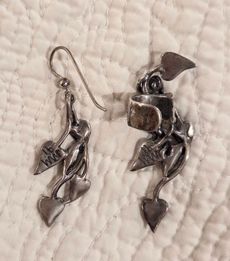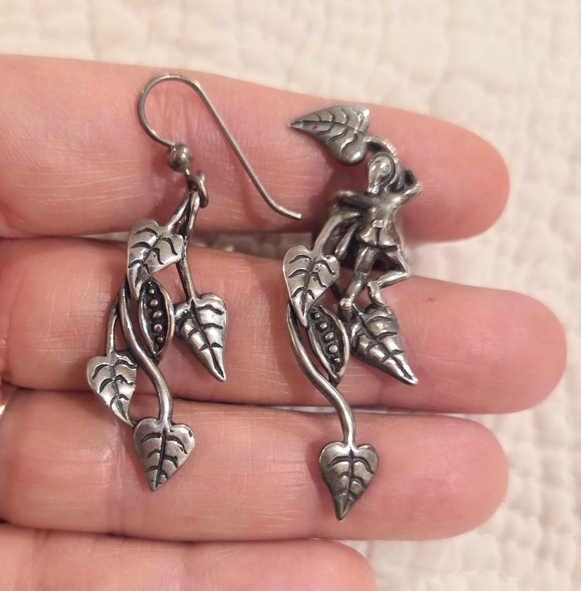 Absolutely whimsical. Check out the tiny climbing Jack with his little cap and skinny legs and the stalks with bean pods. Jack is a cuff and measures 2" long while the leaves on earring wire are just shy of 2" long. Signed MM 91. These earrings acid test as positive for Sterling silver.
