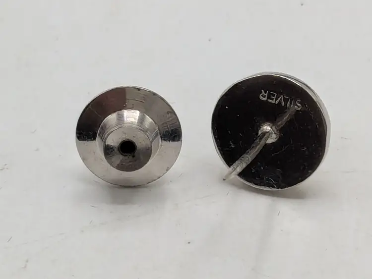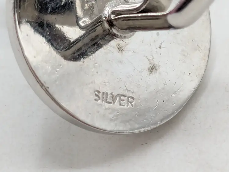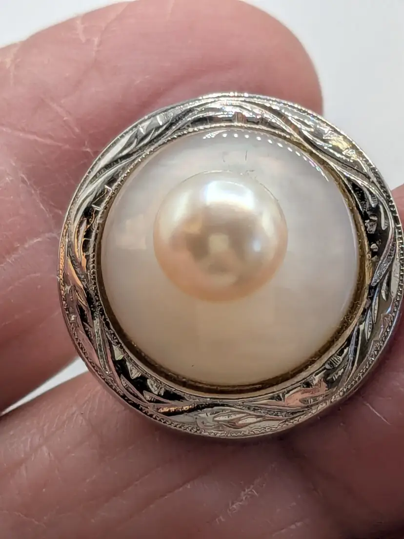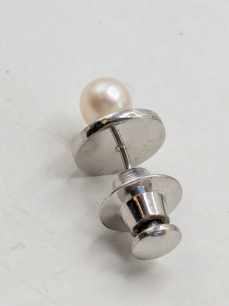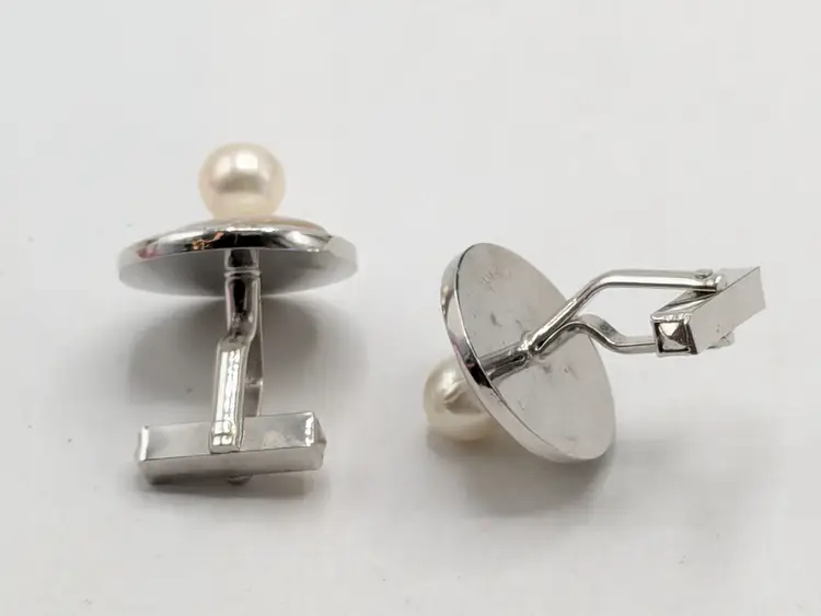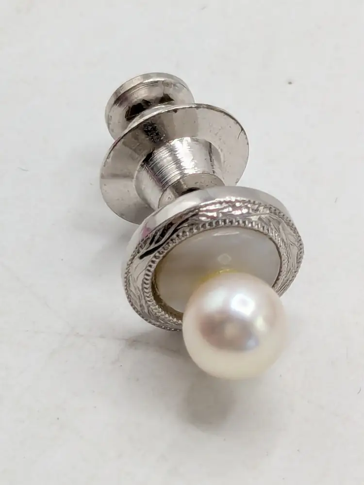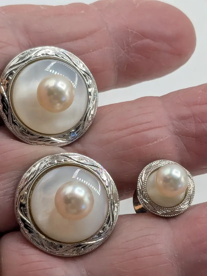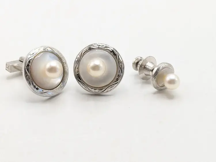 Good condition. All three pieces are marked Silver. Rhodium plated. Features mother of pearl with pearl center. Set of cufflinks and matching tie tack. Cufflinks measure 3/4" in diameter and tie tack is 1/2". wen