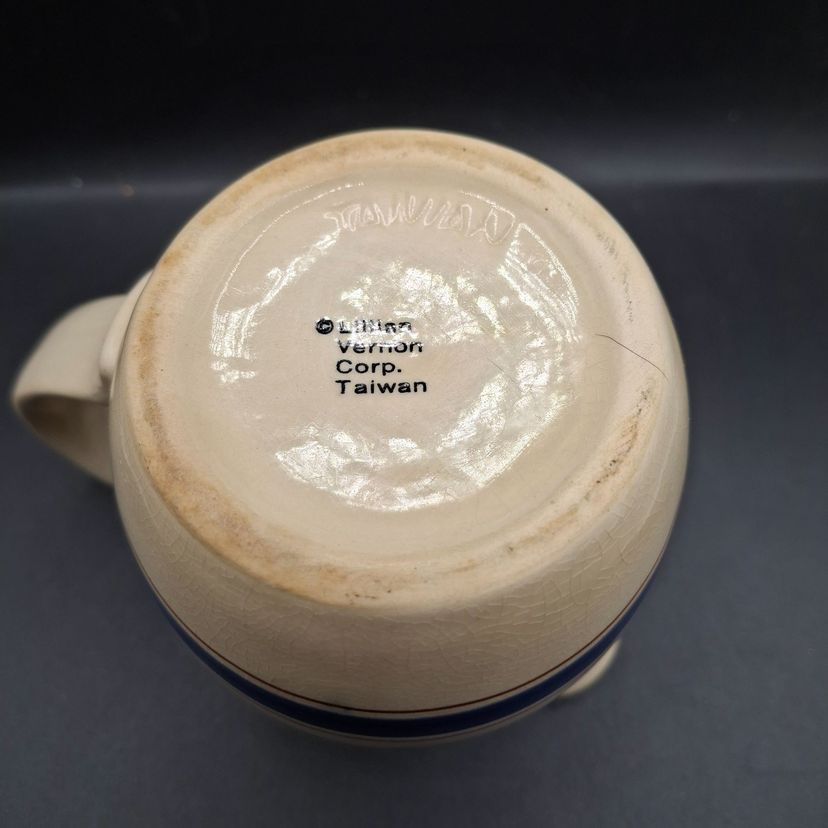 In the heart of a cozy kitchen, a vintage stoneware pitcher finds its place. Crafted by Vernon Corp. in Taiwan, its elegant blue stripe evokes a sense of nostalgia. A timeless piece, it whispers stories of countless gatherings and cherished moments, waiting to infuse your space with warmth and character.