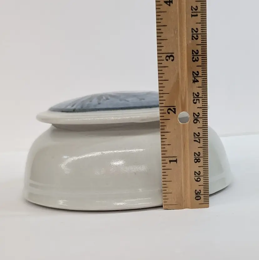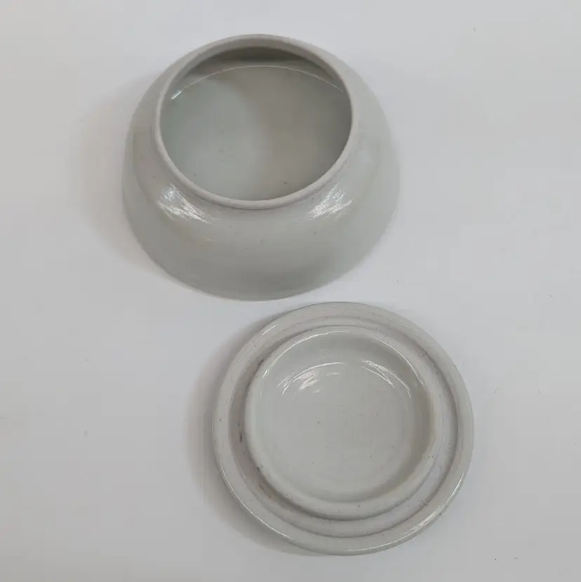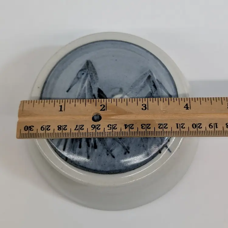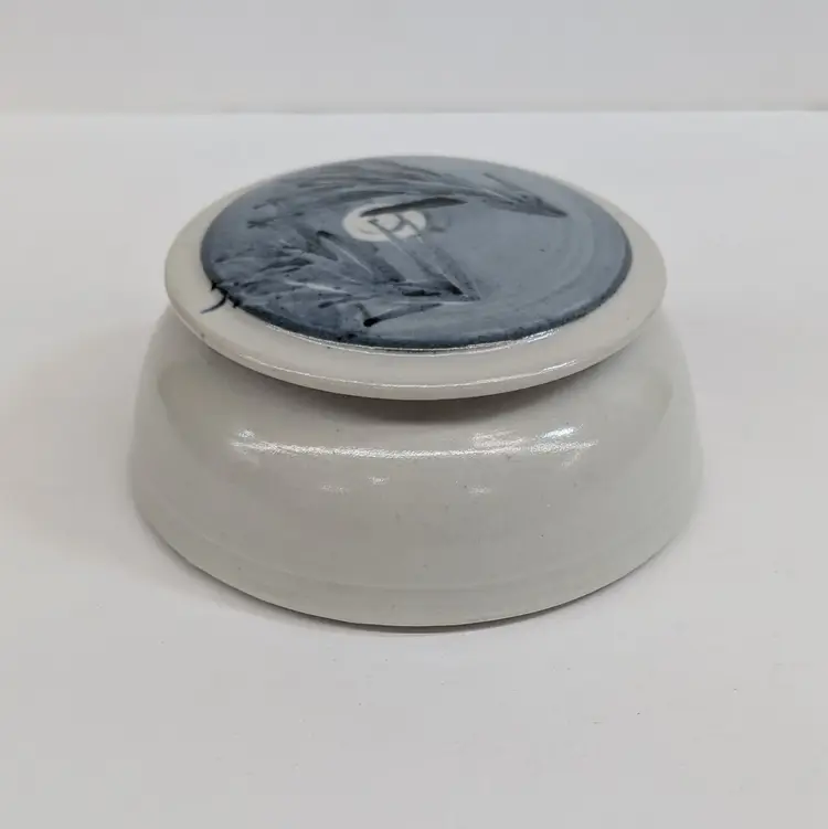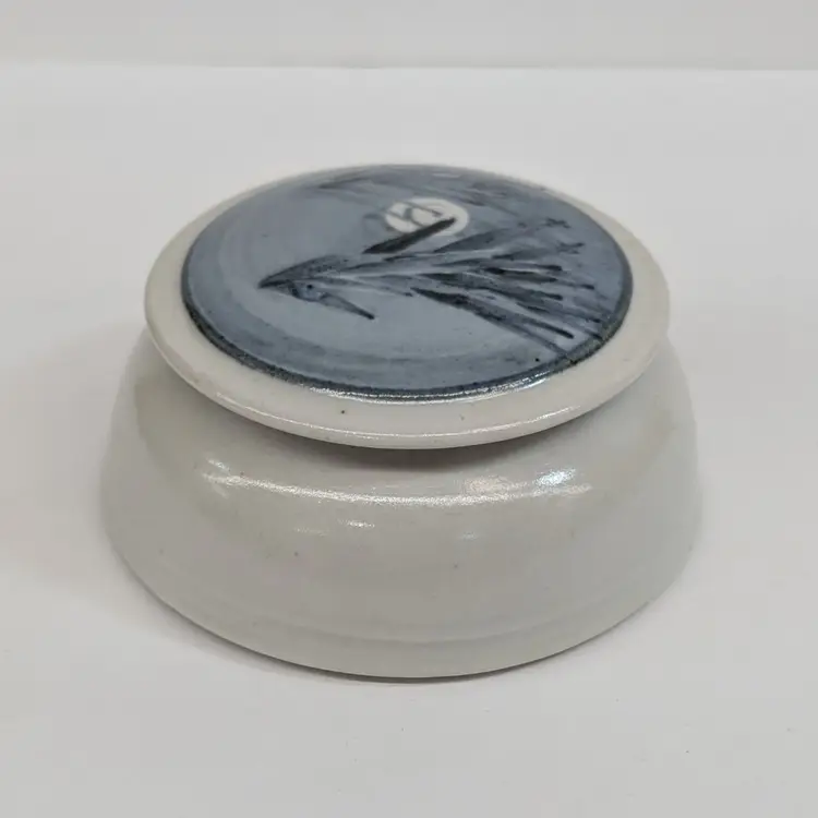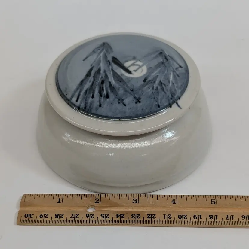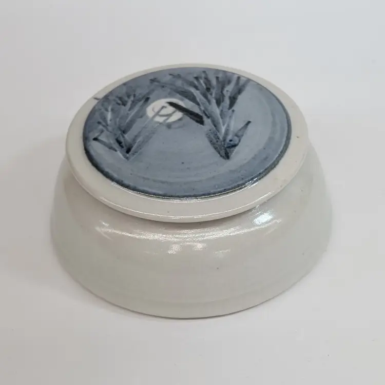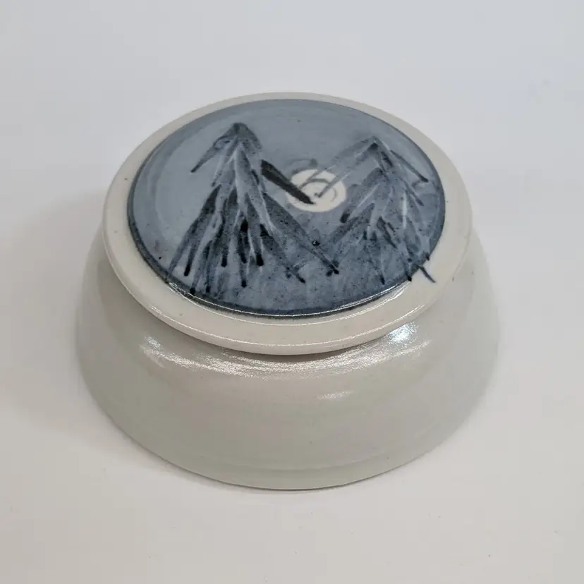 Lovely, pottery vessel with a lid that features trees with a moon. Could be used as a trinket box, sugar bowl or for whatever you'd like to store. Nicely shaped and glazed. It is signed on the bottom but I could not figure out the maker. In nice, used condition. Measurements ~ 5 x 2.25"