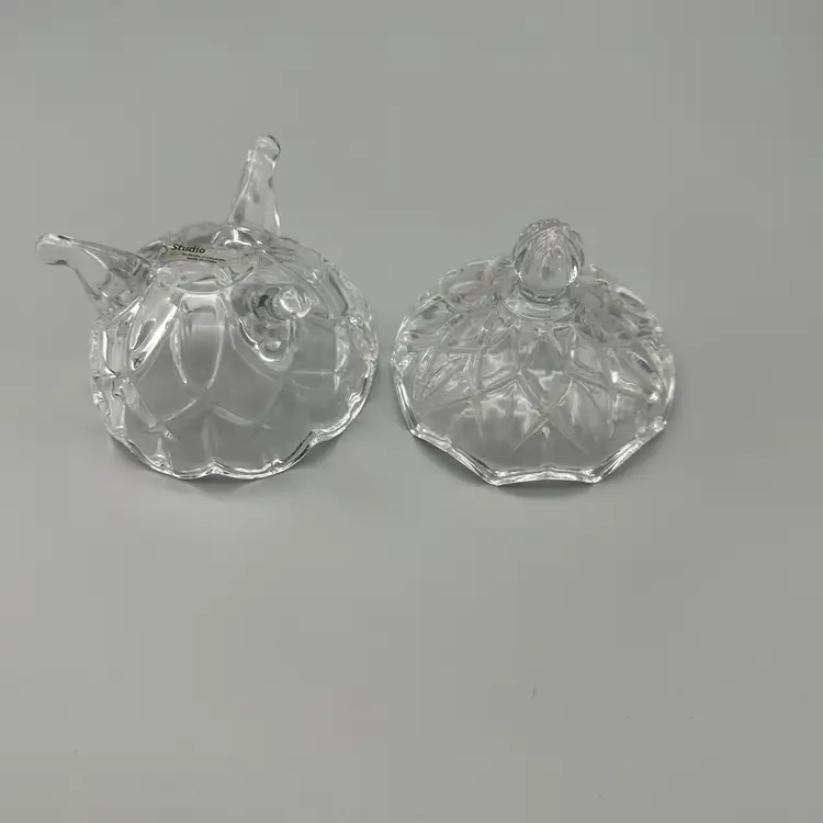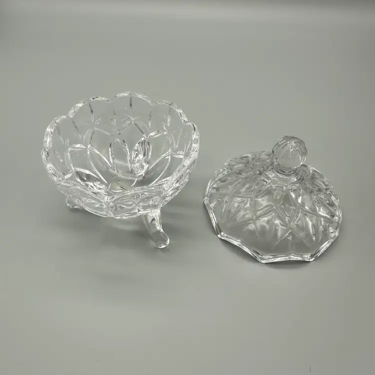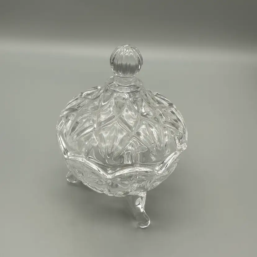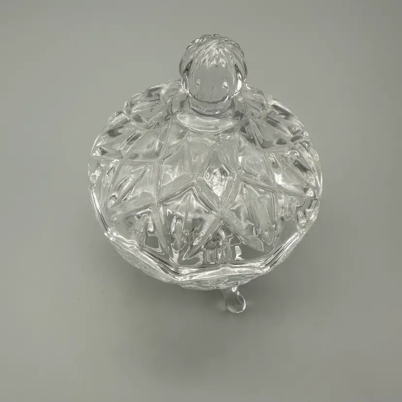 Very pretty crystal trinket box with lid three footed two piece clear peace. Measures approximately 5 1/4 inches high by 4 inches in diameter. Elegant crystal.