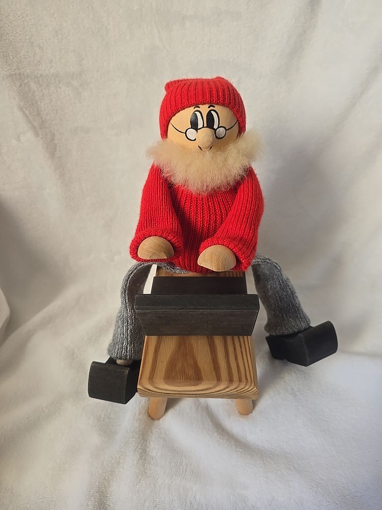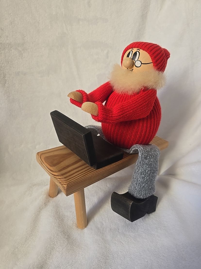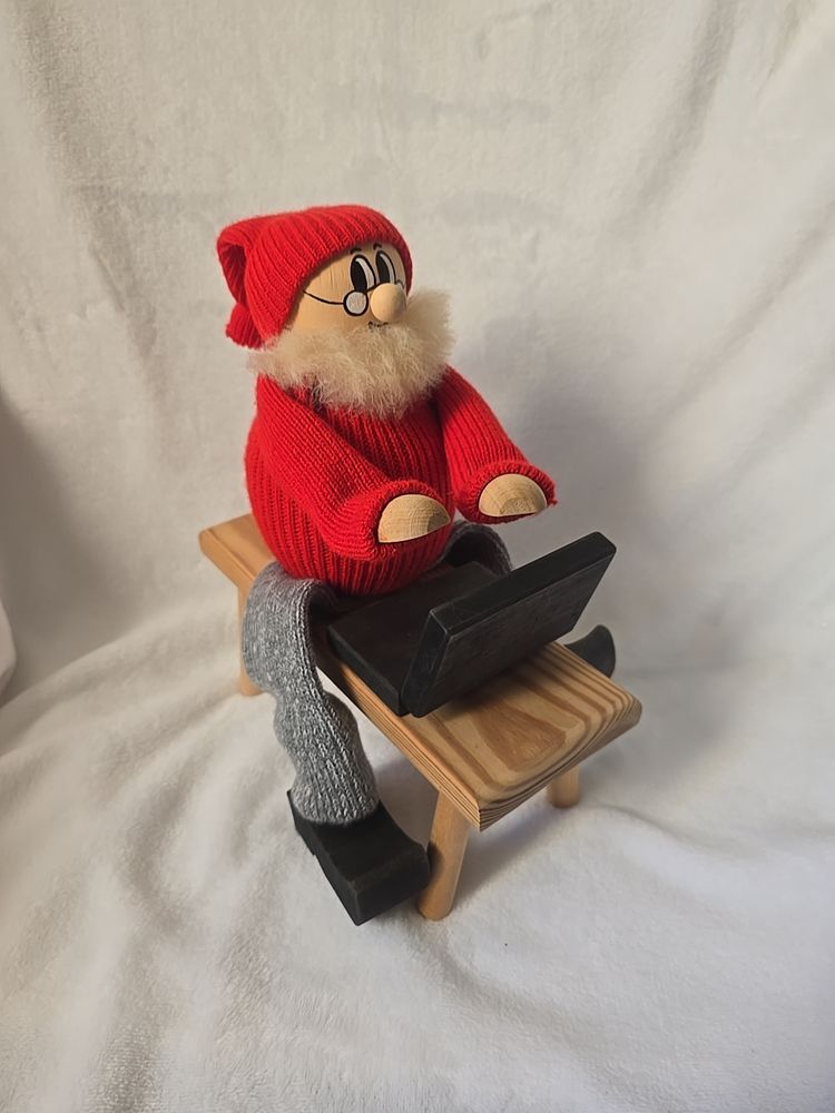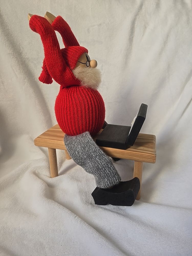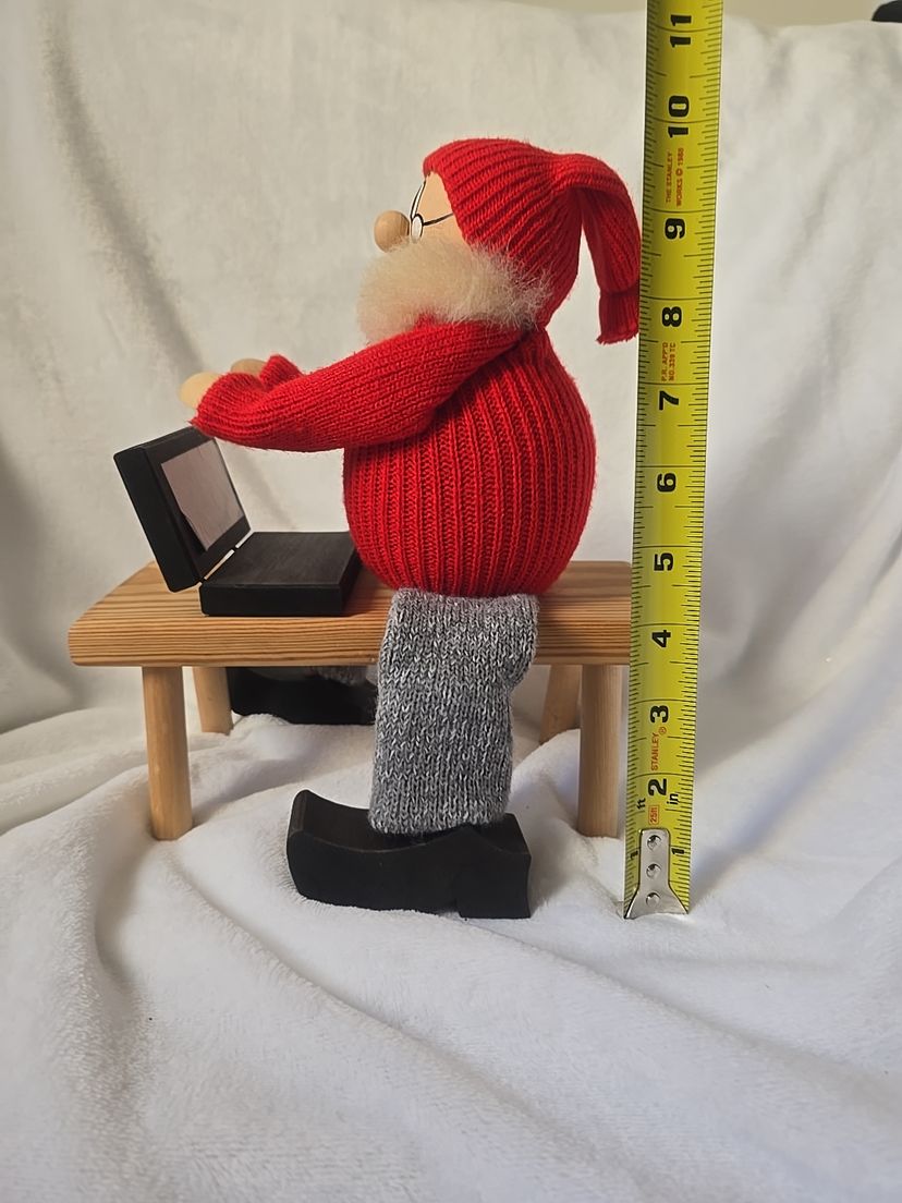A delightful vintage Swedish Tomte (Santa Claus gnome) by Ljungströms, handcrafted in Sweden. This collectible figure shows Santa in a red knit sweater and cap, gray stockings, and wooden clogs, seated at a bench with a laptop. His arms are movable, so you can slightly adjust his pose at the keyboard.