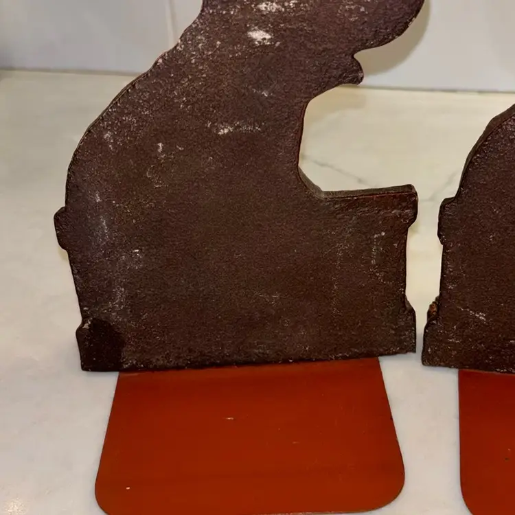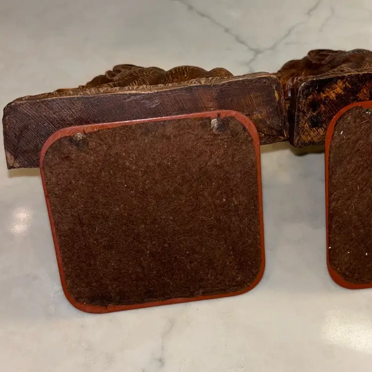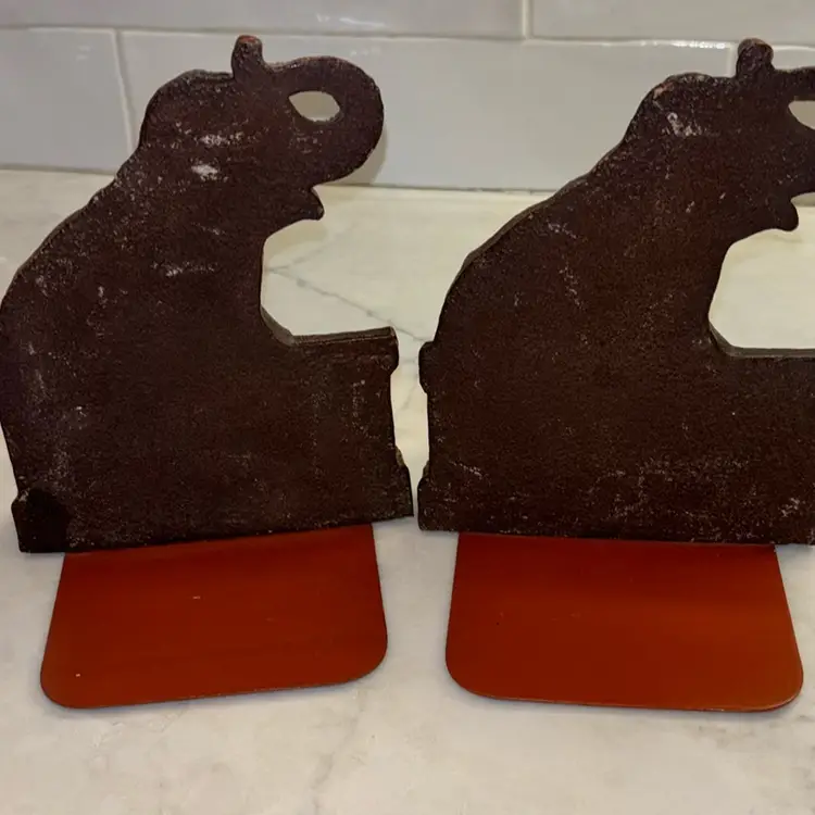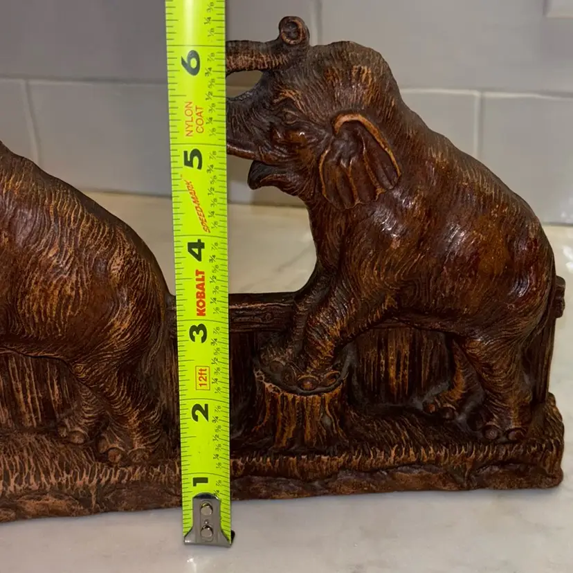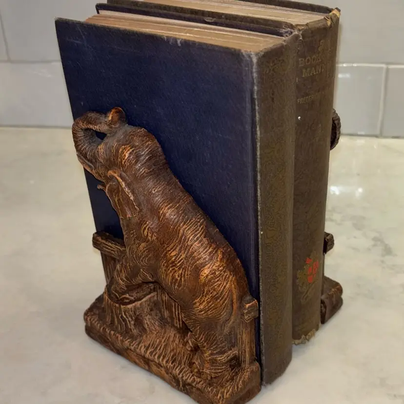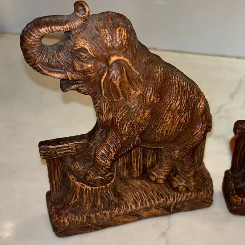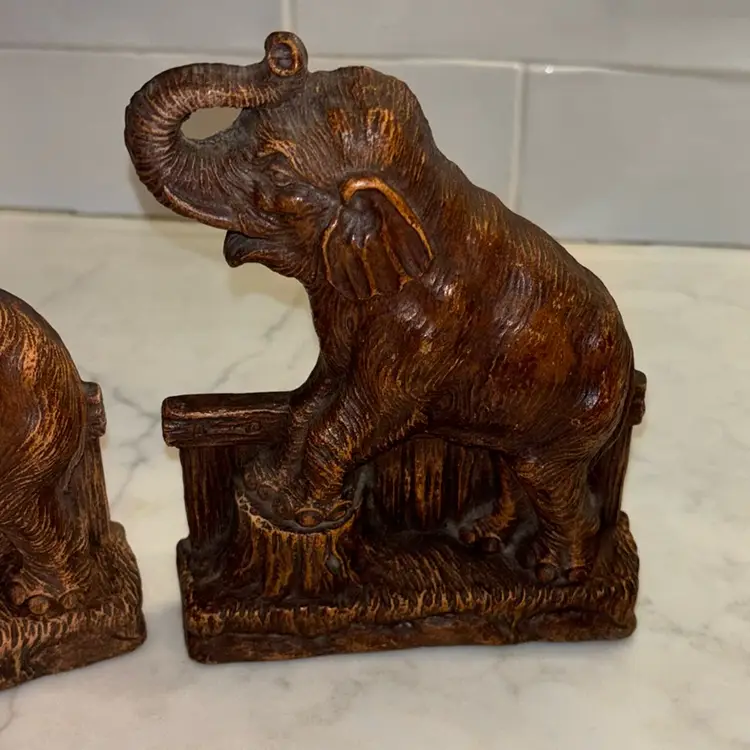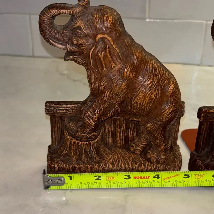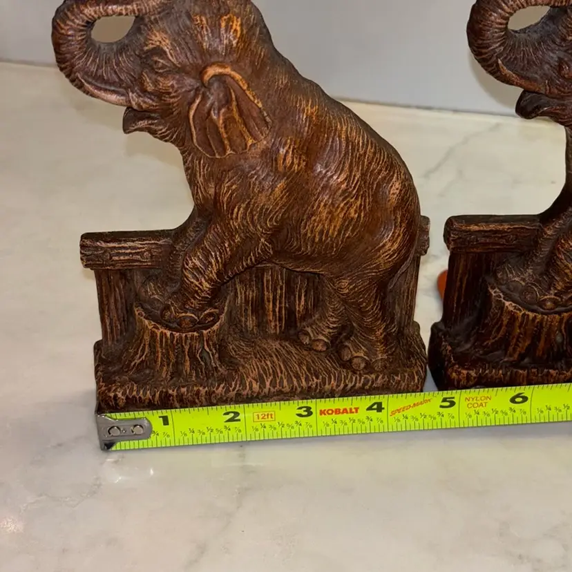 This is a pair of vintage Syroco wood elephant book ends molded wood pulp composite material trunk up good luck