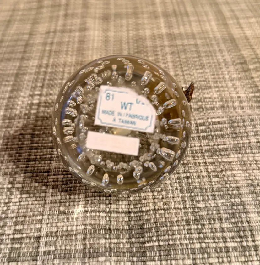 Vintage (early 1980's) clear art glass apple paperweight with controlled bubbles and a brass stem and leaf. The brass is in excellent condition and the apple has no scratches or other signs of wear. This would make a sweet teacher's gift or be an excellent addition to your home decor.