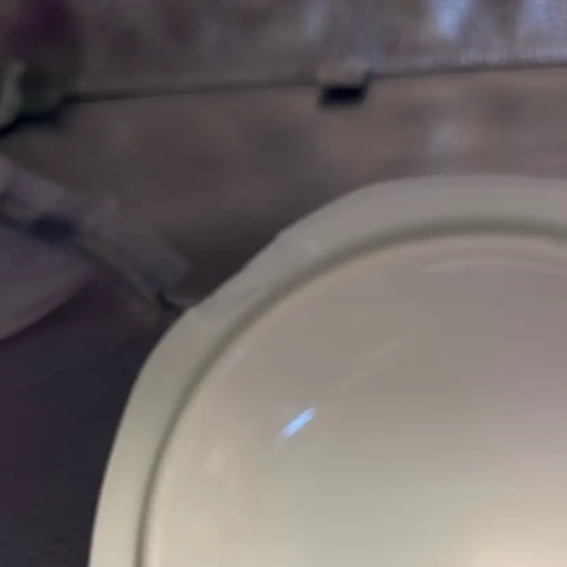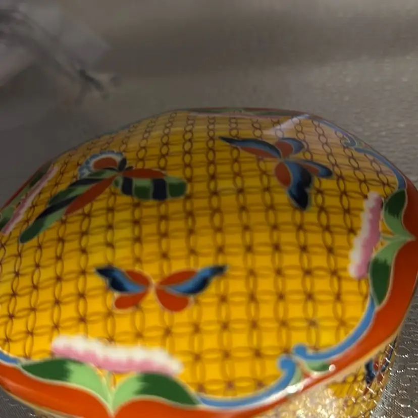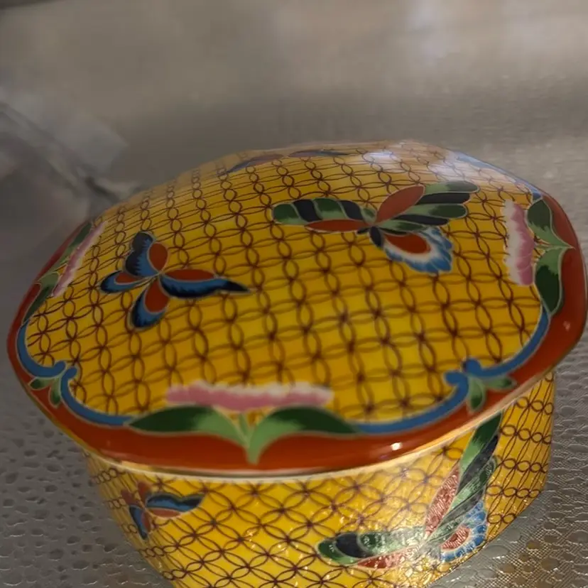 This has a chip on the inside of the lid and is shown in the picture. It’s hand decorated porcelain. It’s beautiful. It can still be used as a trinket. It’s so pretty. I noticed another chip so we are marking down. No landfills!!!