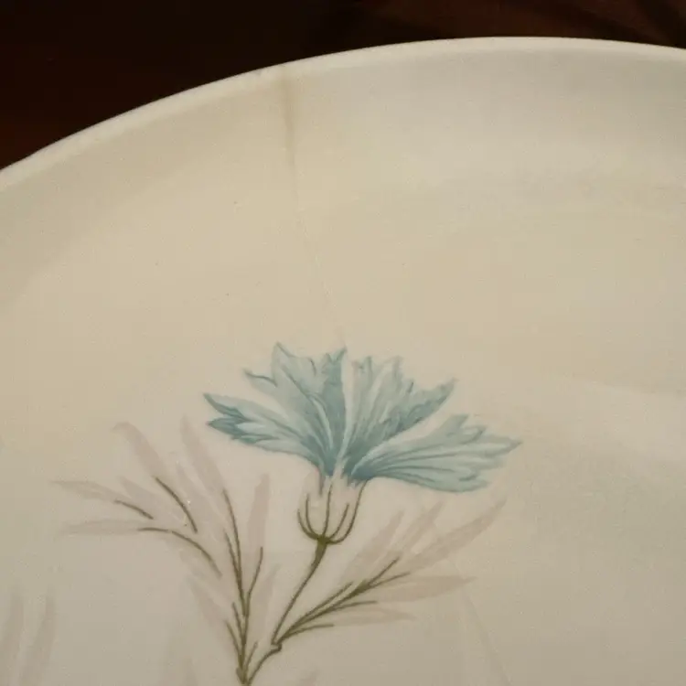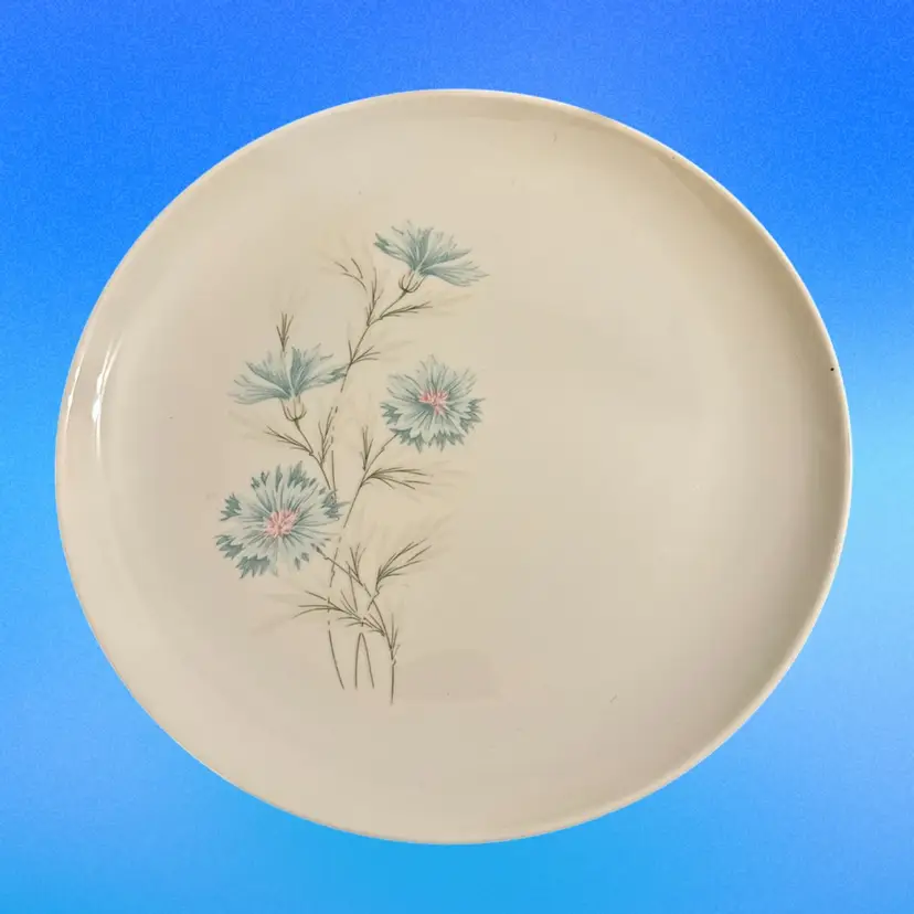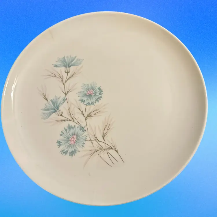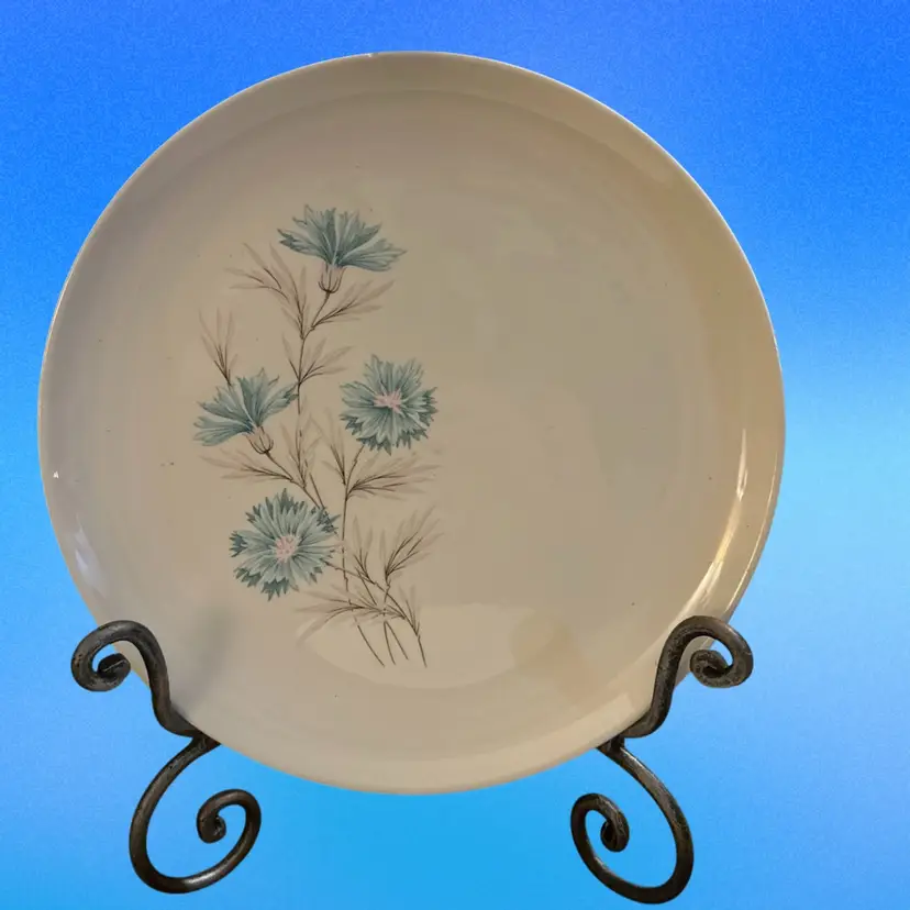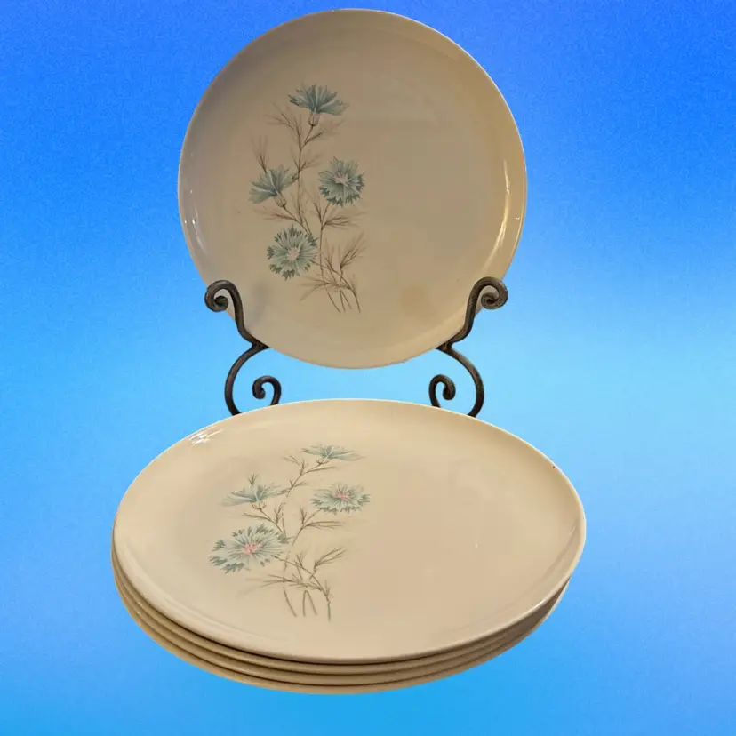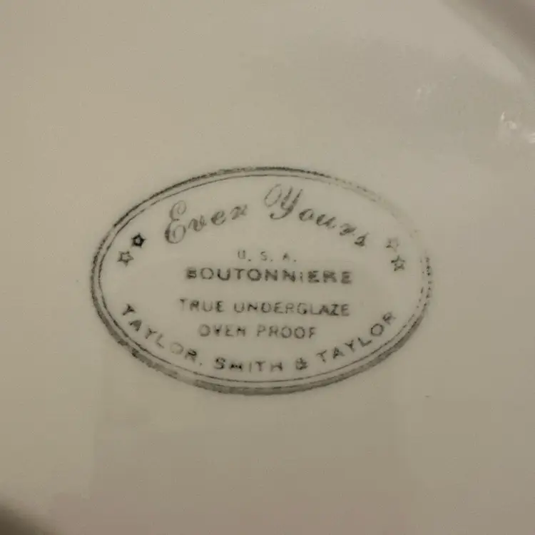 This vintage Taylor Smith and Taylor Ever Yours boutonniere dinner plates set of 5 is a charming addition to any table setting. Made in America in the mid-20th century, the multicolor ceramic plates feature a vintage pattern with a mid-century modern style. The 10-inch diameter plates are stackable and have a glossy finish, making them both practical and decorative for all occasions. Hand wash only to preserve the printed backstamp and unique design of this collectible set. Excellent condition! Appear to have never been used. No silverware marks. 1 plate has a very small crack* see last picture*