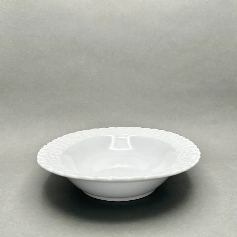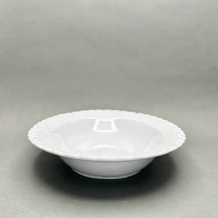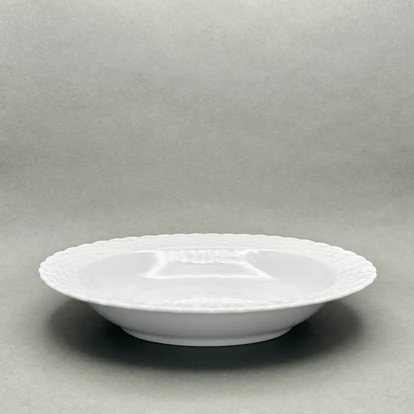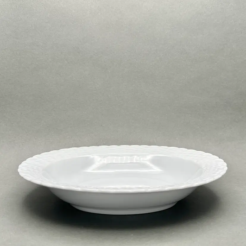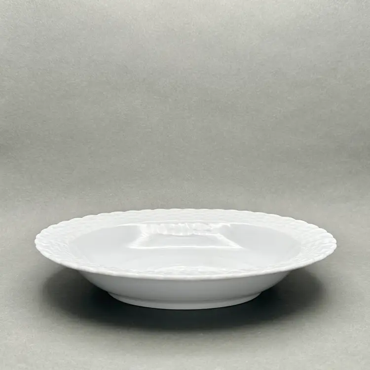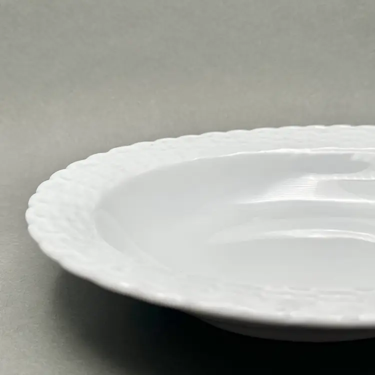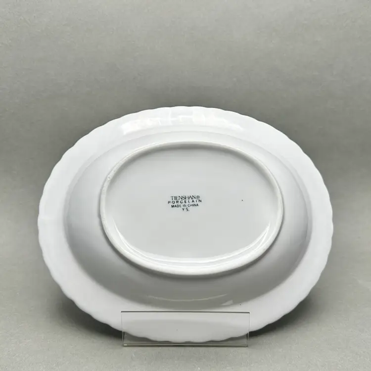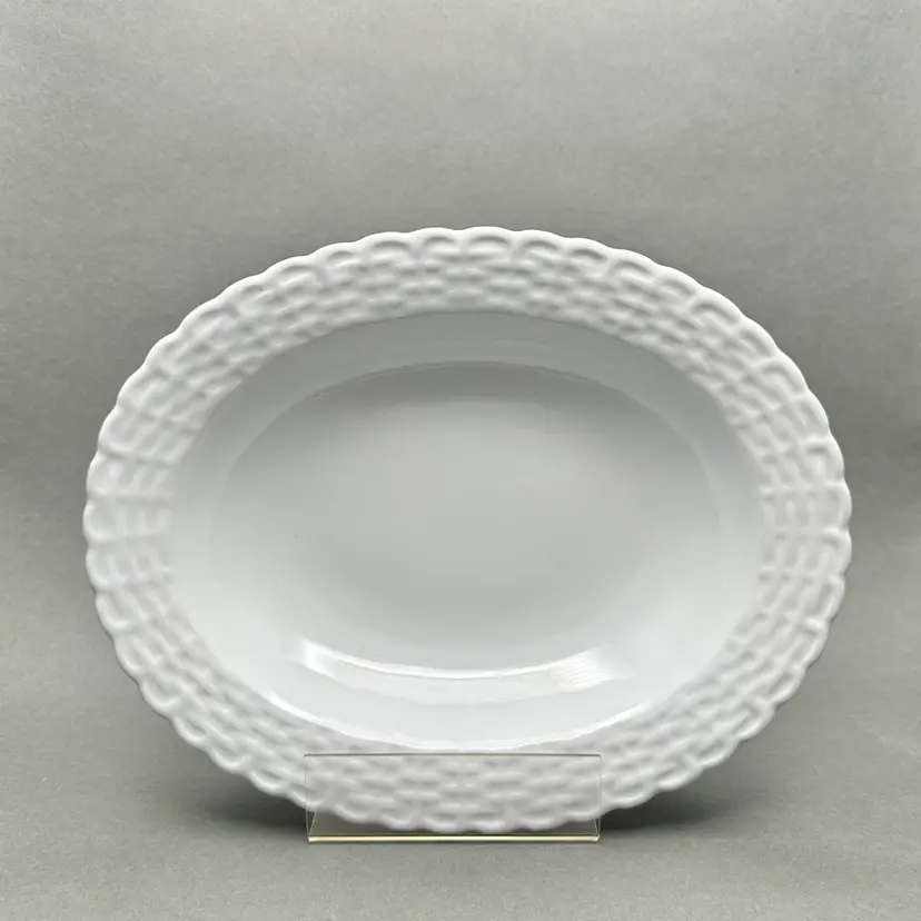 Vintage Tienshan white porcelain vegetable serving bowl. It has an oval form with a basket weave border. Made in China.