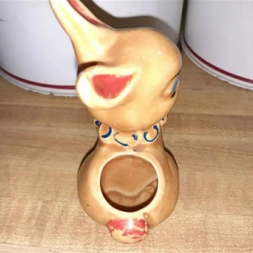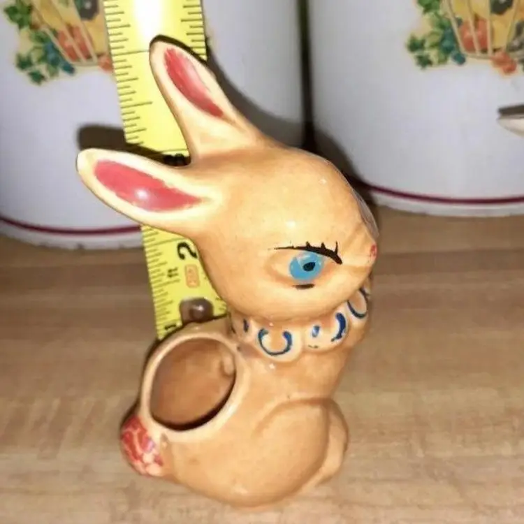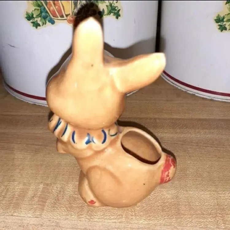 Vintage tiny bunny planter / vase / toothpick holder. Cute little blue-eyed bunny with red nose tail and inside of ears. He looks really grumpy which is awesome! Measures just shy of 4 in tall would be adorable with toothpicks or a tiny succulent in it. No makers marks. Does have extensive crazing which is consistent of its Age. No chips cracks Part of the cold paint red has worn off but he still displays wonderfully. Please see all pictures as they're the best description all items from a smoke-free home with Pet's experienced fragile Shipper. Slightly reminiscent of a Pendleton bunny does have some slight McCoy Shawnee vibes