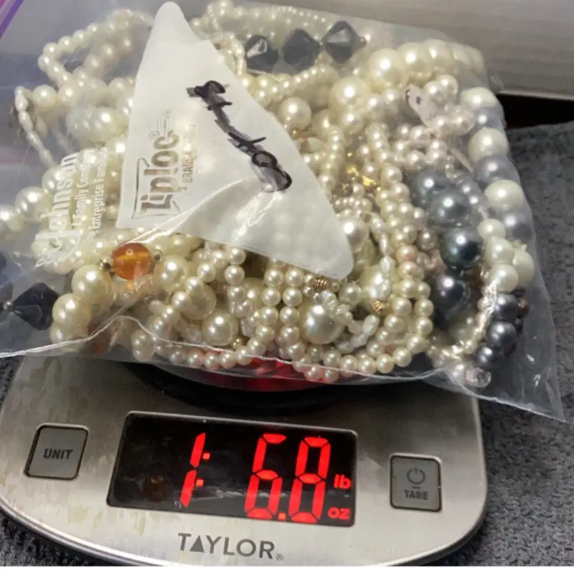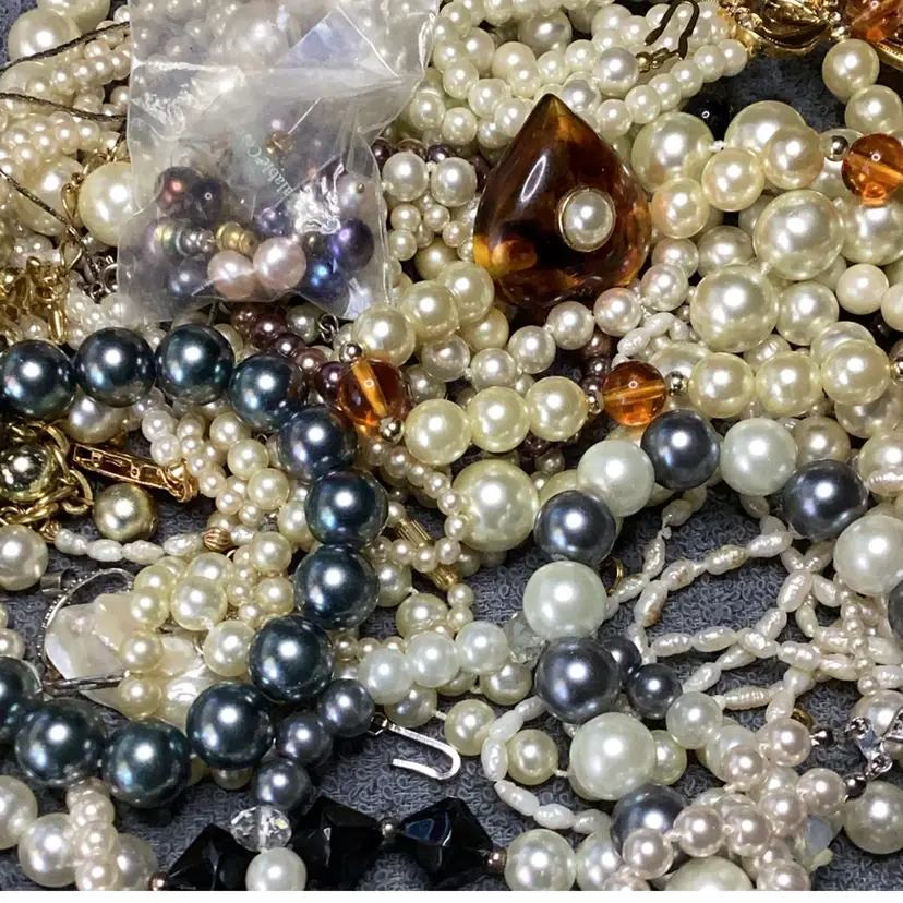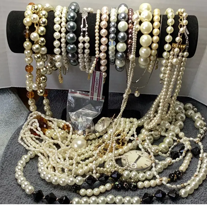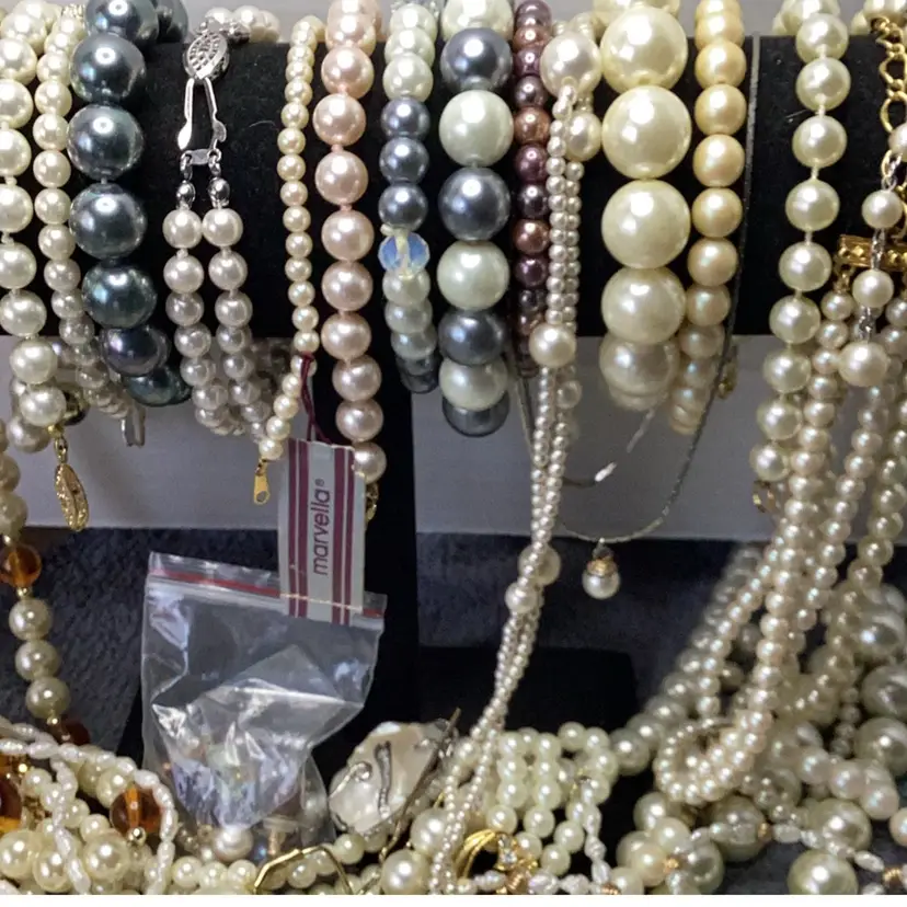 1.6 lbs jewelry lot faux pearls and a couple of fresh water pearls necklaces. Total of 38 pieces all wearable. Some pieces are signed Marvella, Traifary. Bracelets, necklaces and earrings.