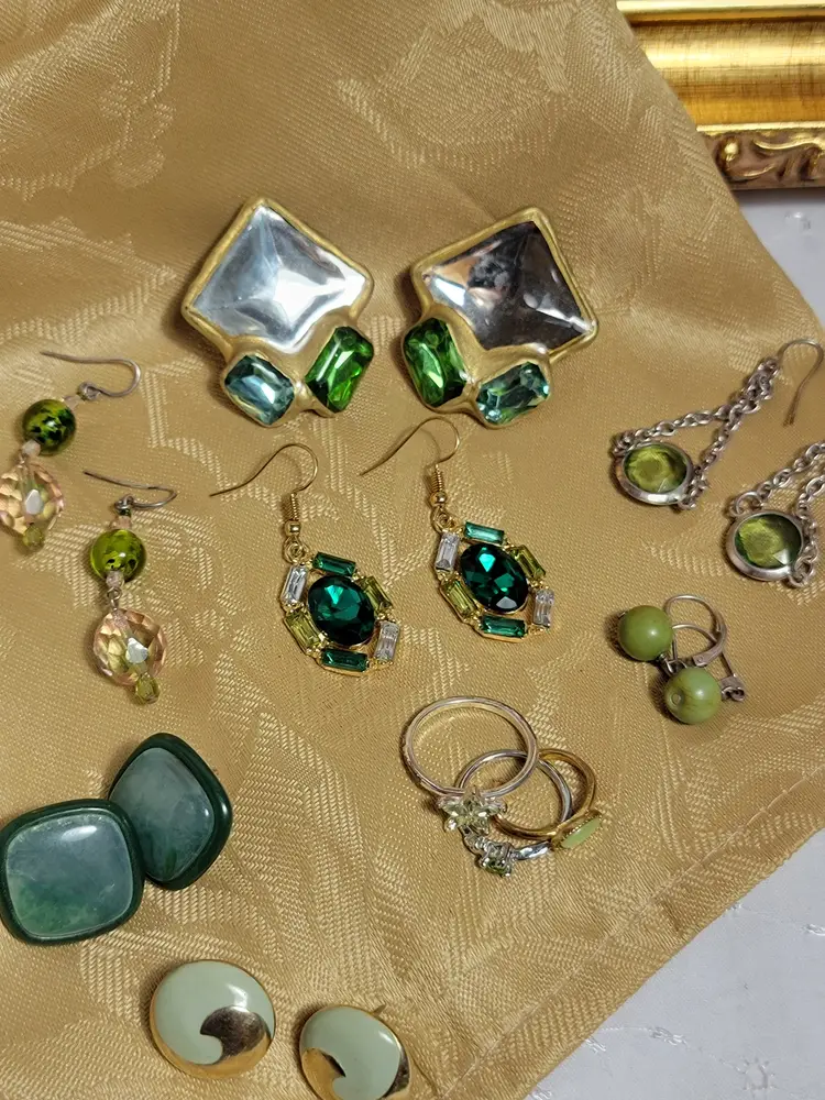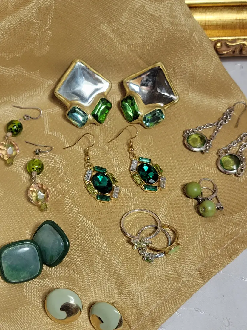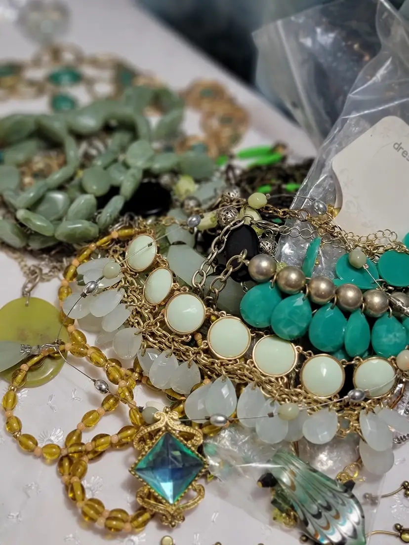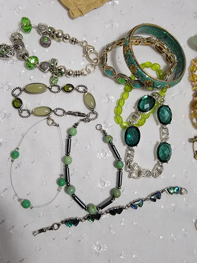 *Lots of Necklaces some are Maker marked, Handmade bracelets with semi precious gemstones also rings, earrings and brooches 2 1/2 lbs of gorgeous green! All kinds of goodies to enjoy And free shipping!!