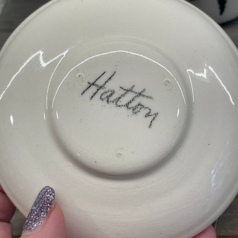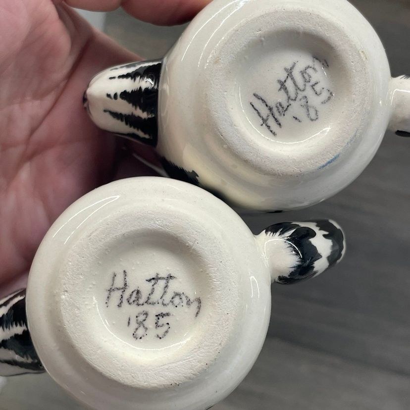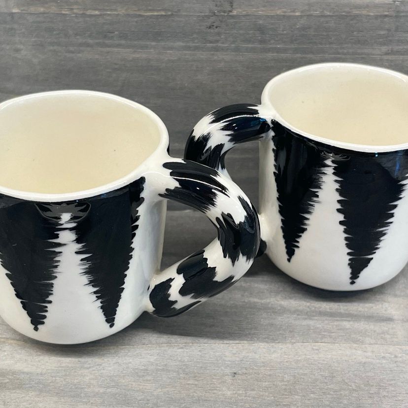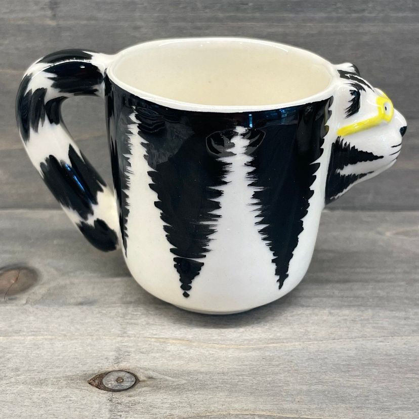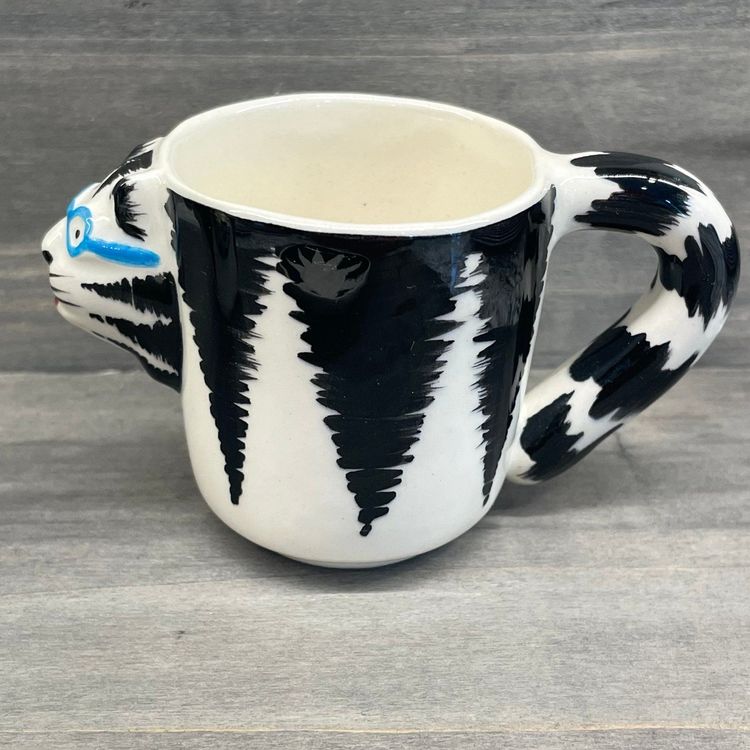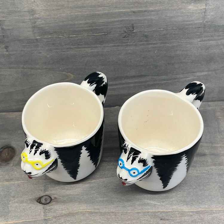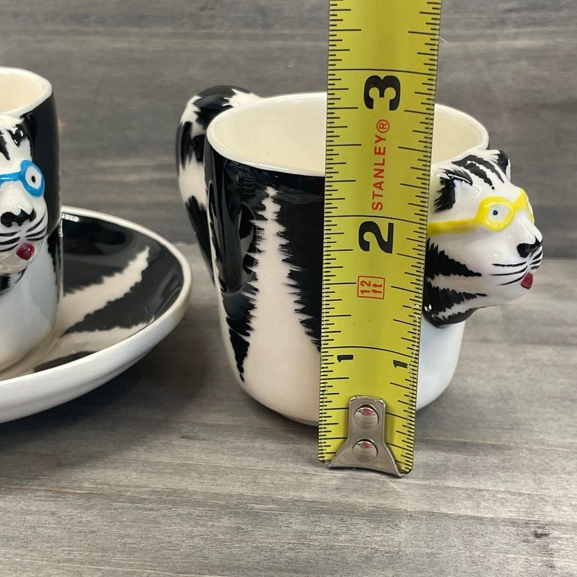 Black & white striped cat mugs with blue/yellow glasses. One saucer broke, so just one left to mix and match. Good preowned condition. See all images for full details. 38