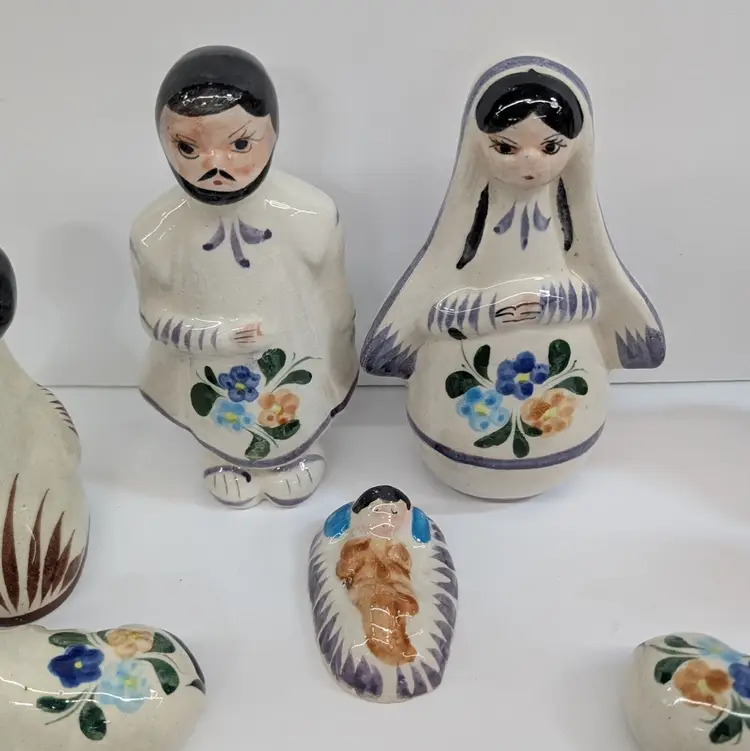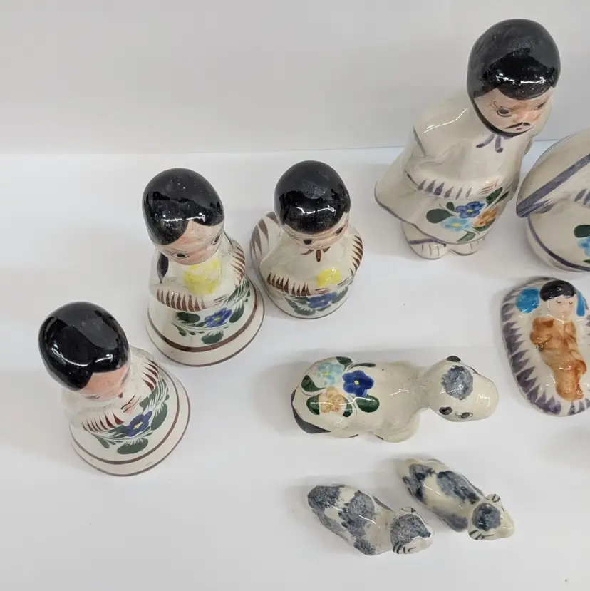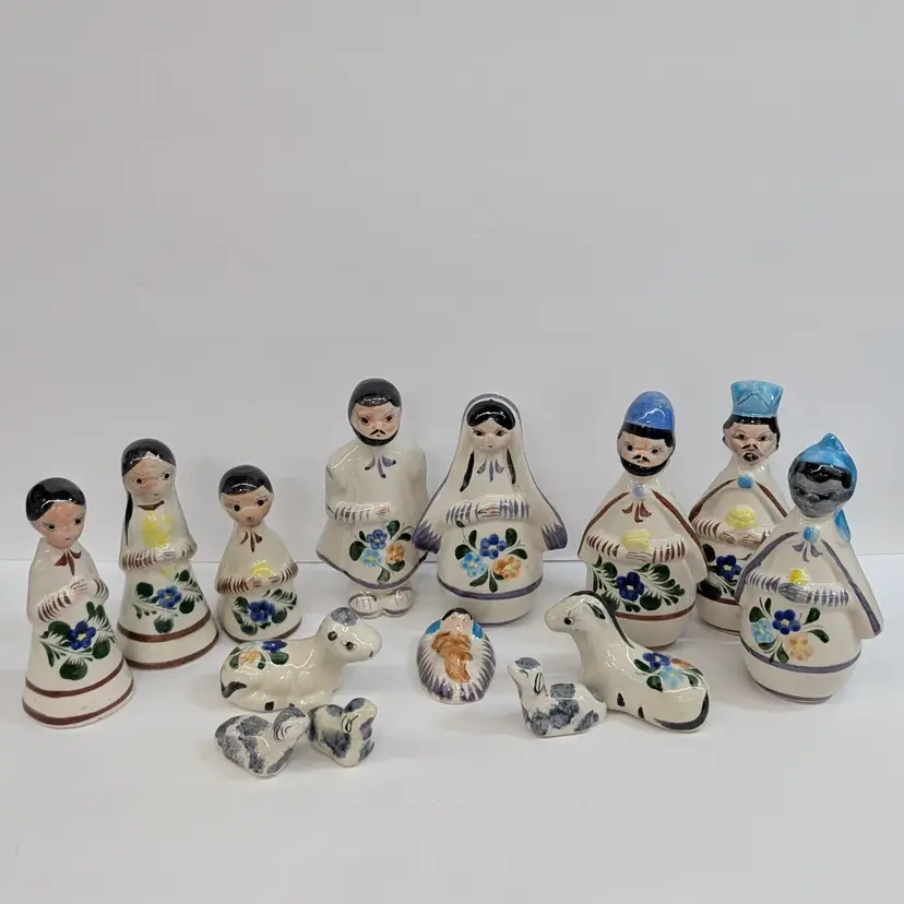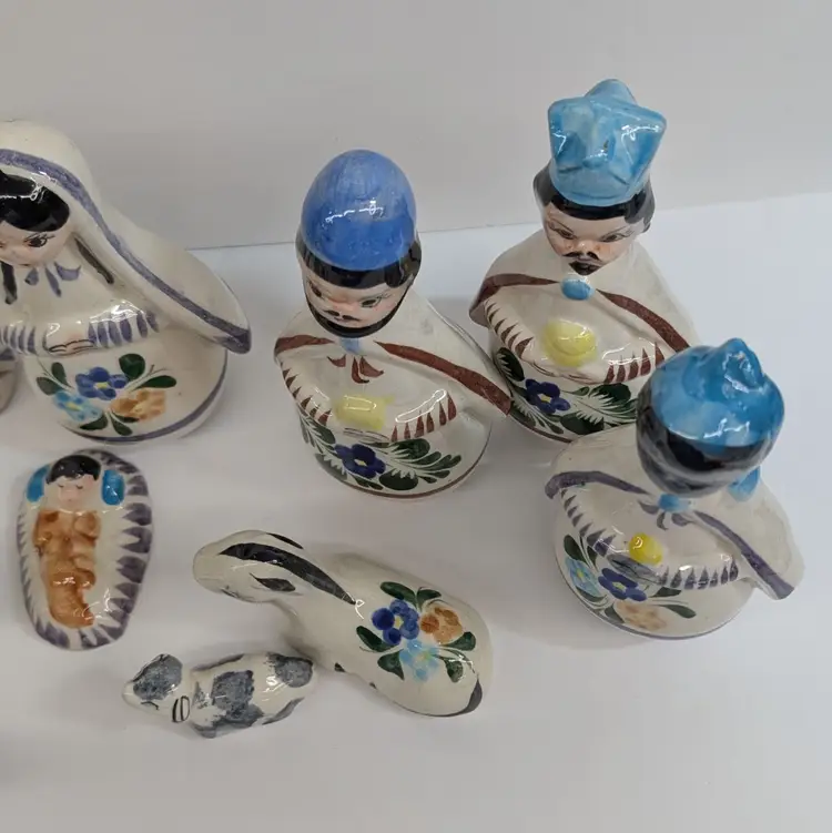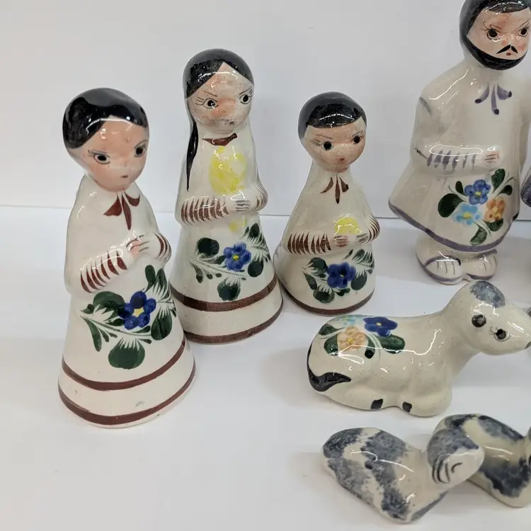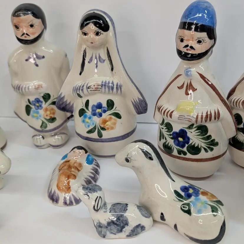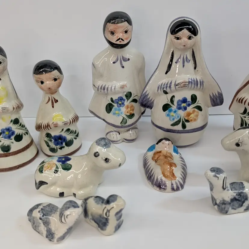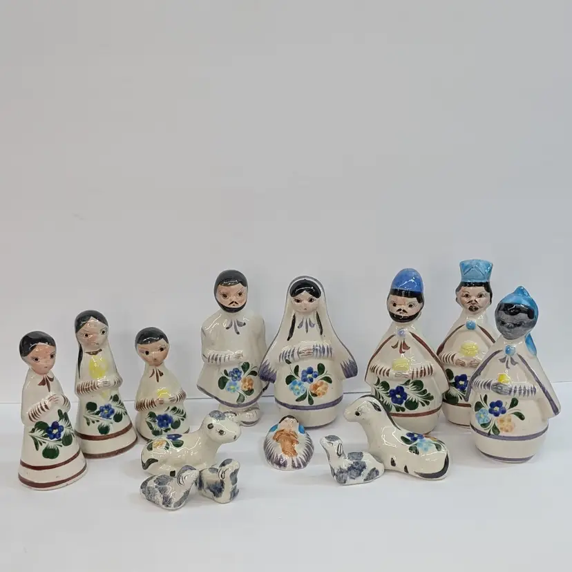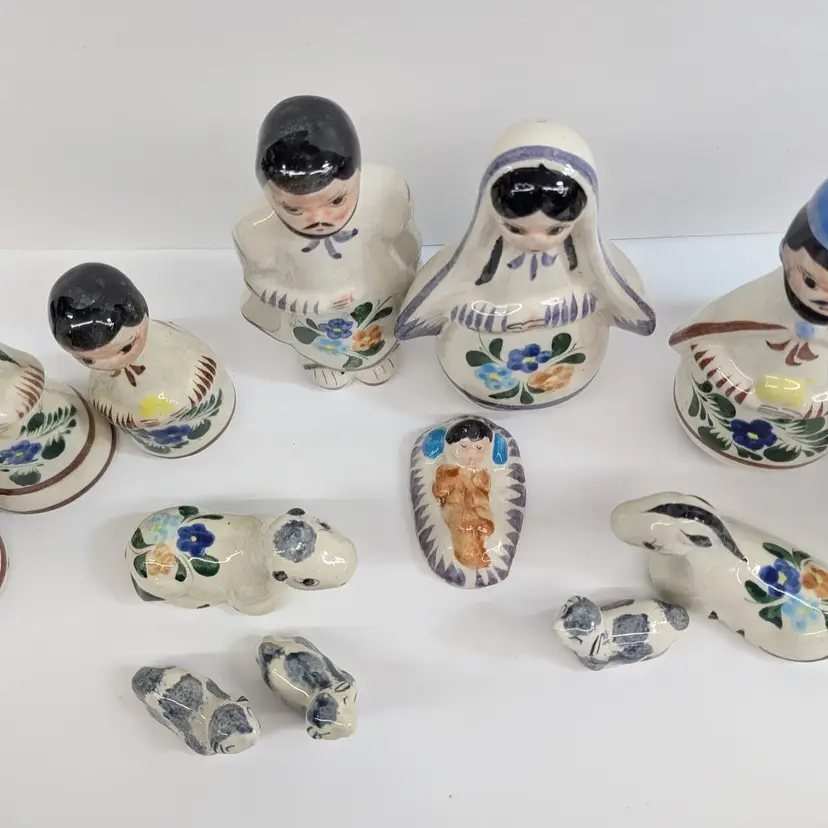 Large nativity set from Mexico with a lovely, hand painted floral design. There are 14 pieces: Mary, Joseph, Baby Jesus, 3 Wise Men, Angel, 2 children or shepherds, cow, donkey and 3 sheep. In nice condition for their age with some crazing, some glaze imperfections and one small chip on the base of the angel (see pictures). To give some scale, the smallest sheep is 2.25 x 1.25 and Mary is 4" wide and Joseph is 6.5" tall