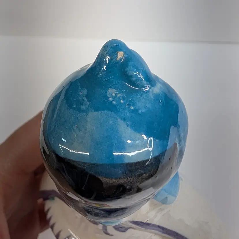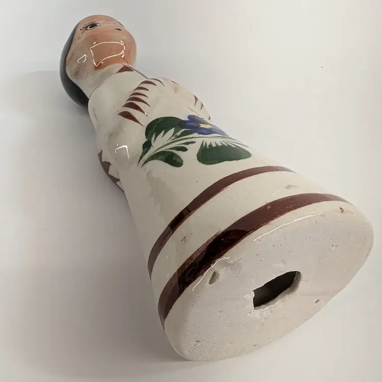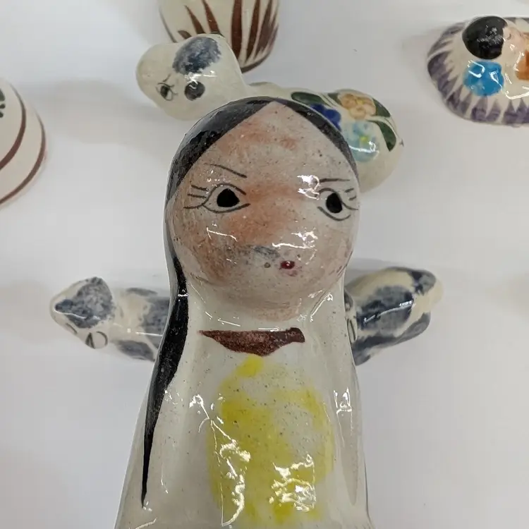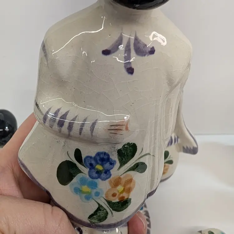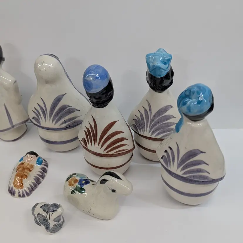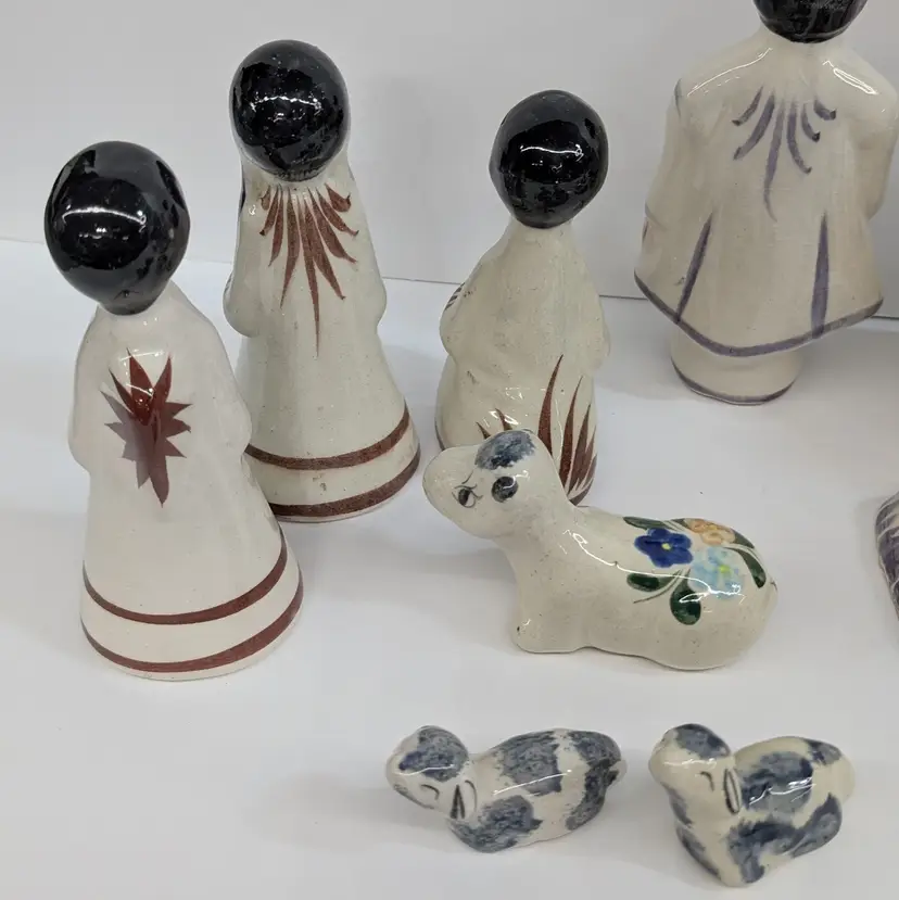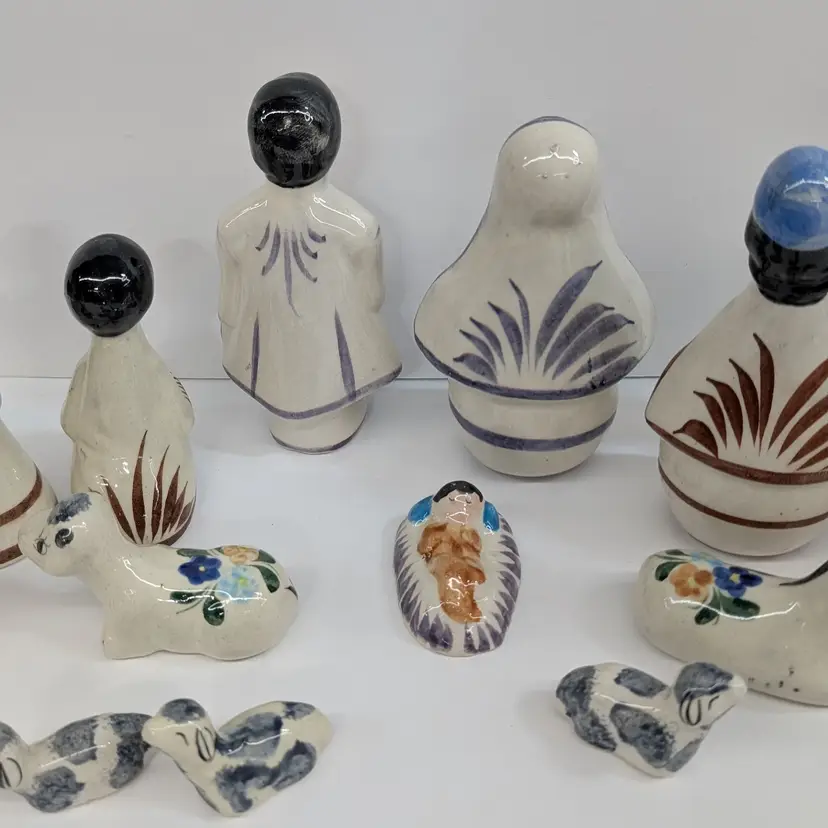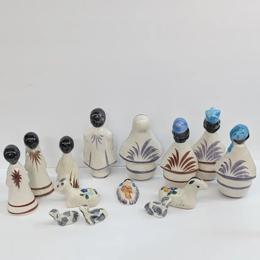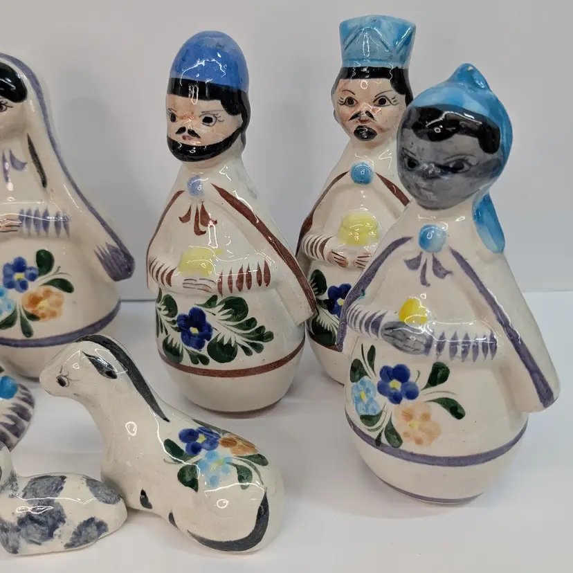 Large nativity set from Mexico with a lovely, hand painted floral design. There are 14 pieces: Mary, Joseph, Baby Jesus, 3 Wise Men, Angel, 2 children or shepherds, cow, donkey and 3 sheep. In nice condition for their age with some crazing, some glaze imperfections and one small chip on the base of the angel (see pictures). To give some scale, the smallest sheep is 2.25 x 1.25 and Mary is 4" wide and Joseph is 6.5" tall