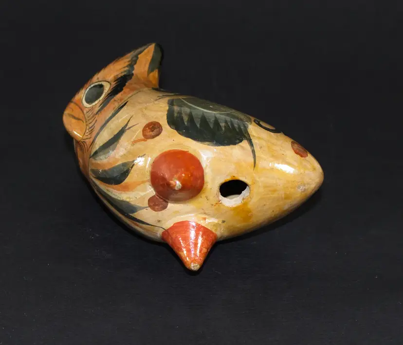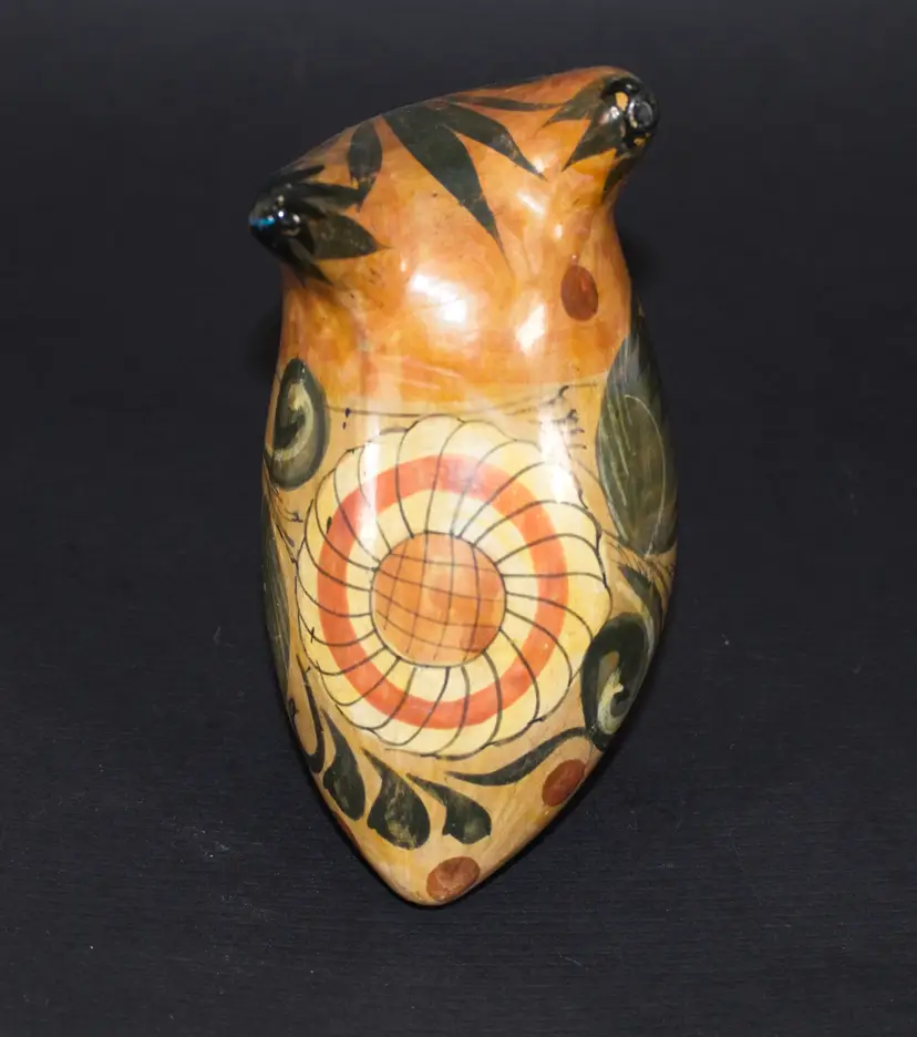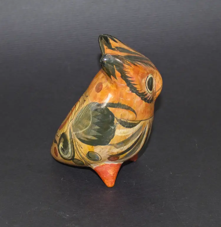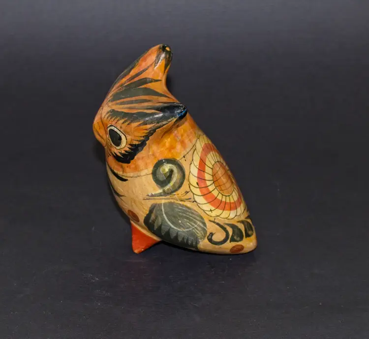 Vintage Tonala Pottery Owl Bird Hand Painted Mexico 5" Tall. There is a small amount of paint missing on the bottom of the feet. Can not be seen when owl is upright. Otherwise in good condition. 3" wide x 5" long x 5" tall