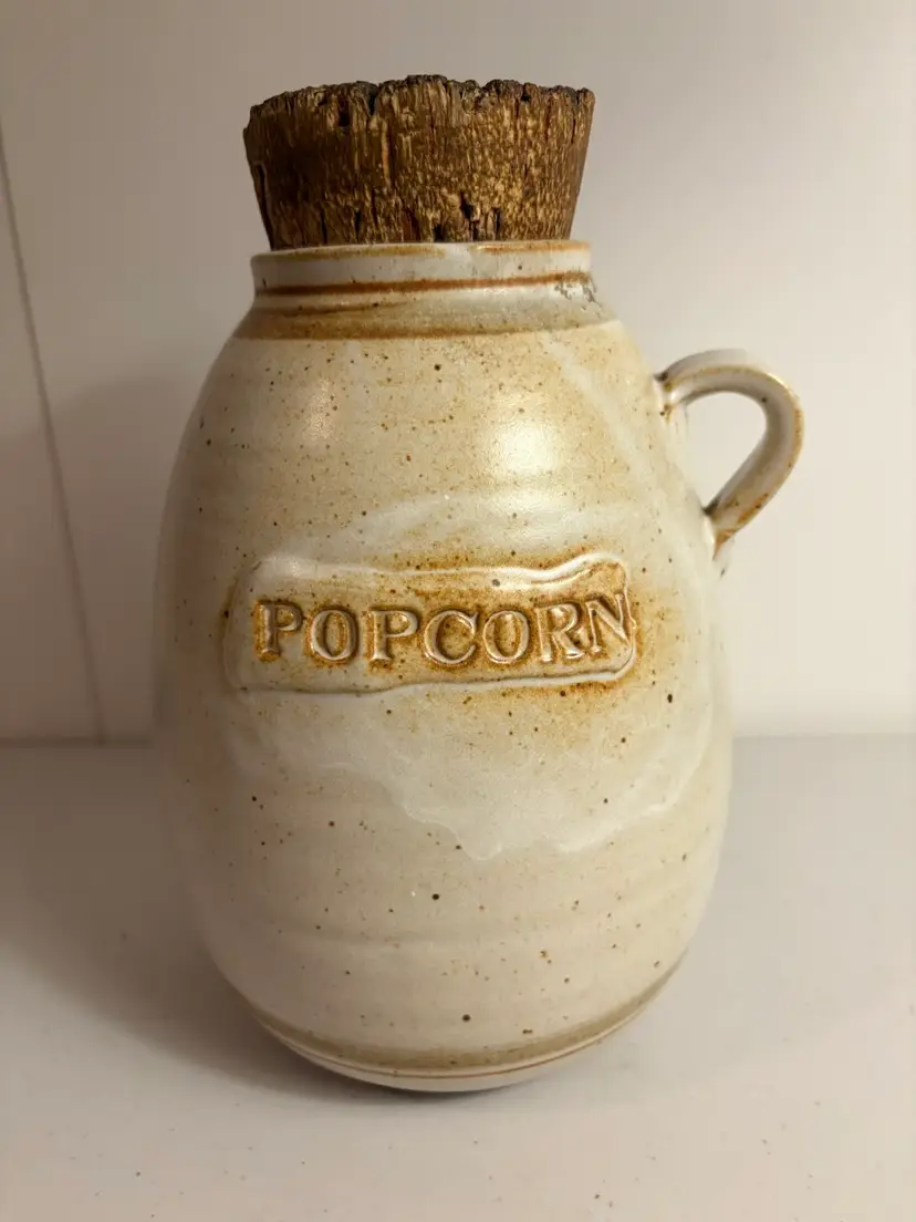 The jar has a cream/tan glaze with speckles and the word "POPCORN" embossed on the front.