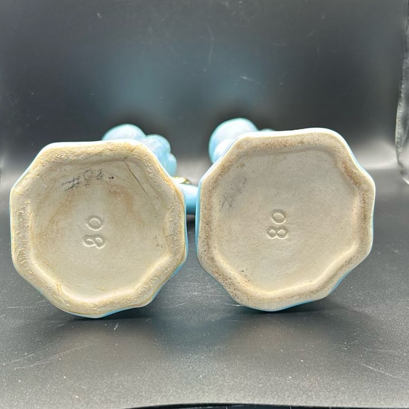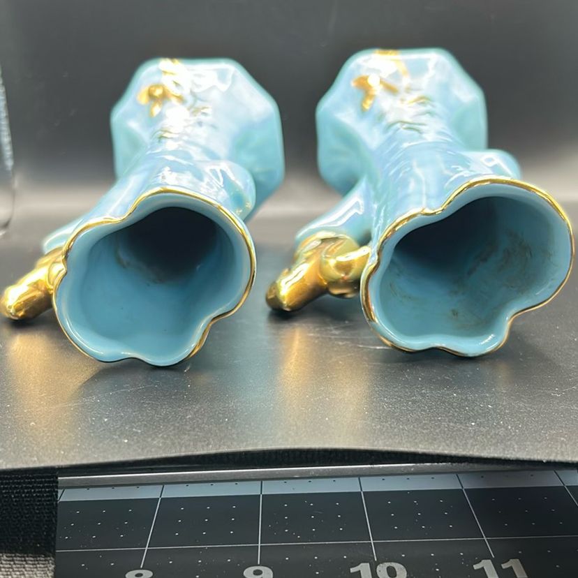 This piece is a vintage green ceramic vase shaped like a tree trunk with a squirrel attached. It has a light blue color with gold colored accents. It is from the mid 20th century. each candlestick stands 8 inches tall and approximately 4 inches wide, including the squirrel. these pieces are in excellent condition. They have no chips or cracks.