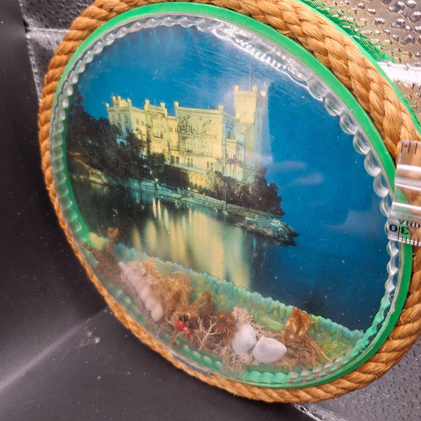 In a time long before the digital age, travelers sought keepsakes that captured the essence of their journeys. This charming wall art piece, with its enchanting imagery of a castle against the backdrop of Trieste’s waters, adorned with delicate seashells and marine elements, tells a story of exploration and nostalgia.