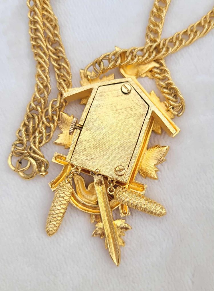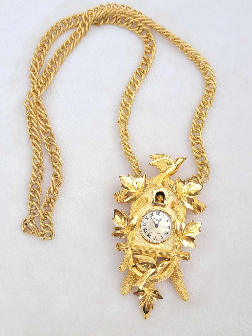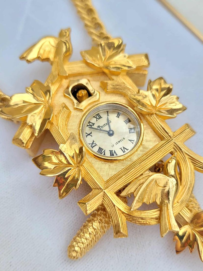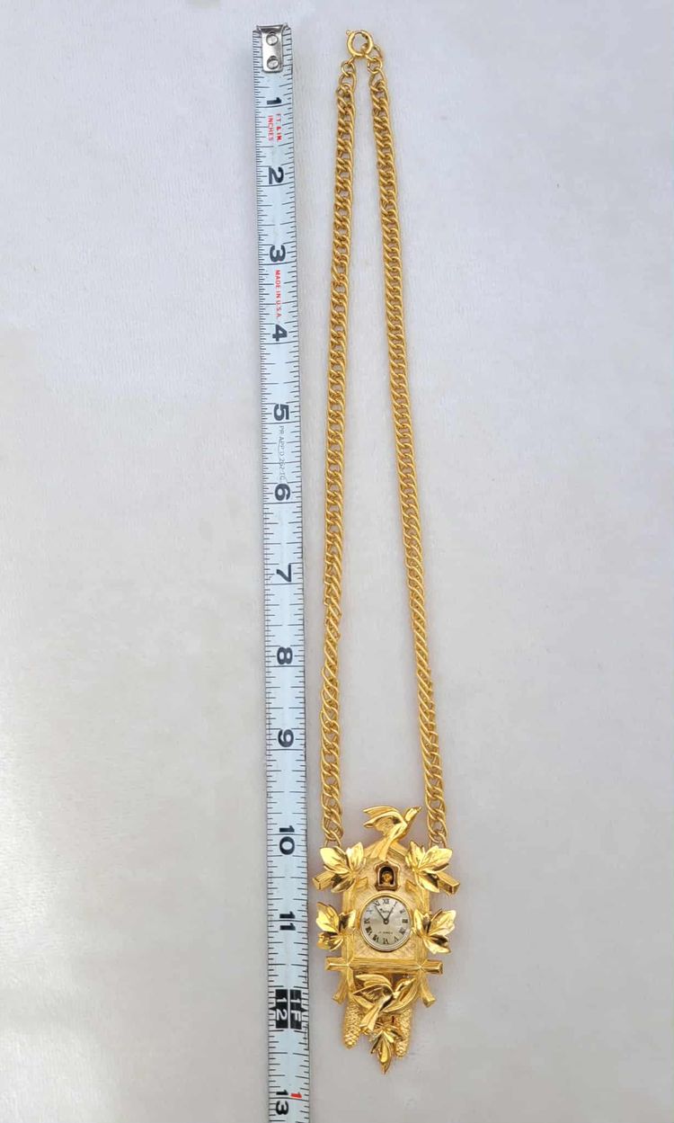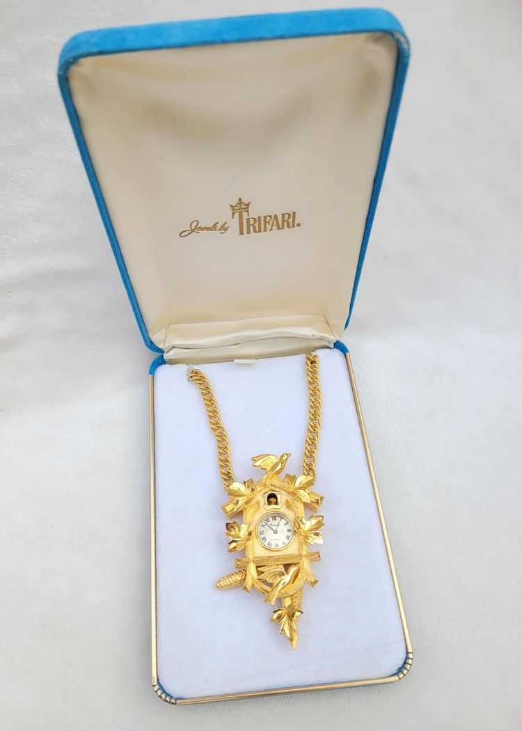 Whimsical signed Trifari mechanical 17 jewel watch necklace, in the original box! It has been tested and works well, in very good condition. Please see pictures for details and measurements.