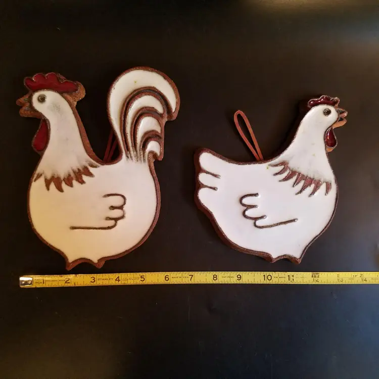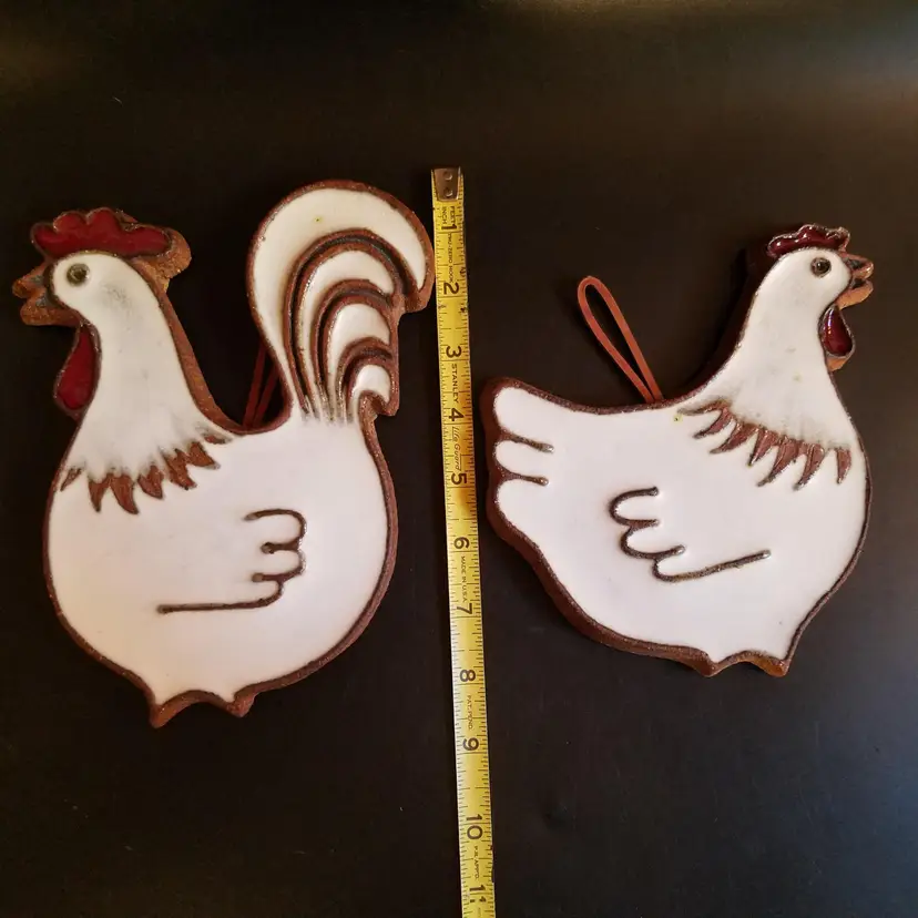 Excellent condition, no damage. The rooster is 9" x 6.5", the hen is 7" x 6". The bottoms are corked. No damage Hand Painted no cracks or chips.