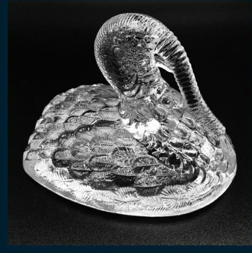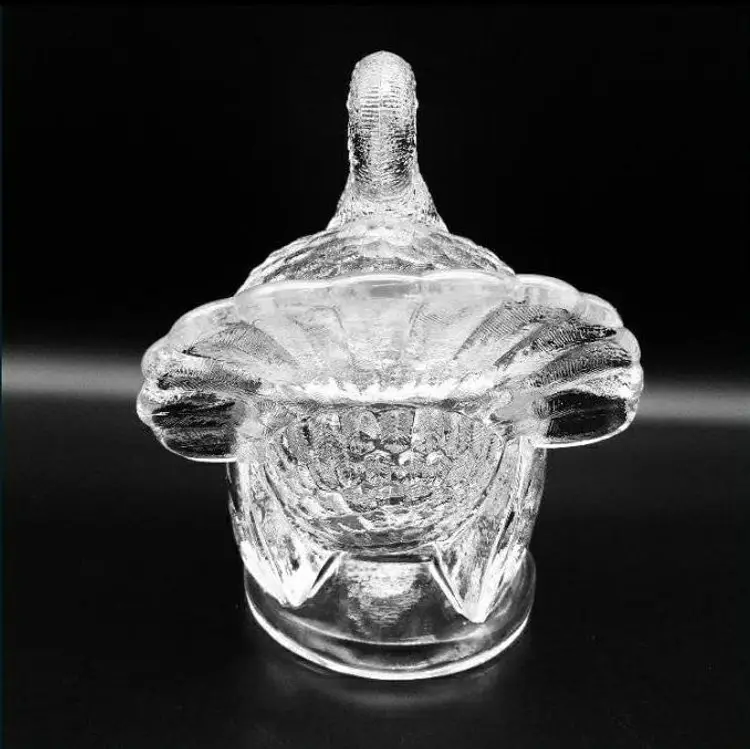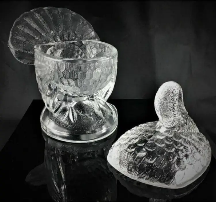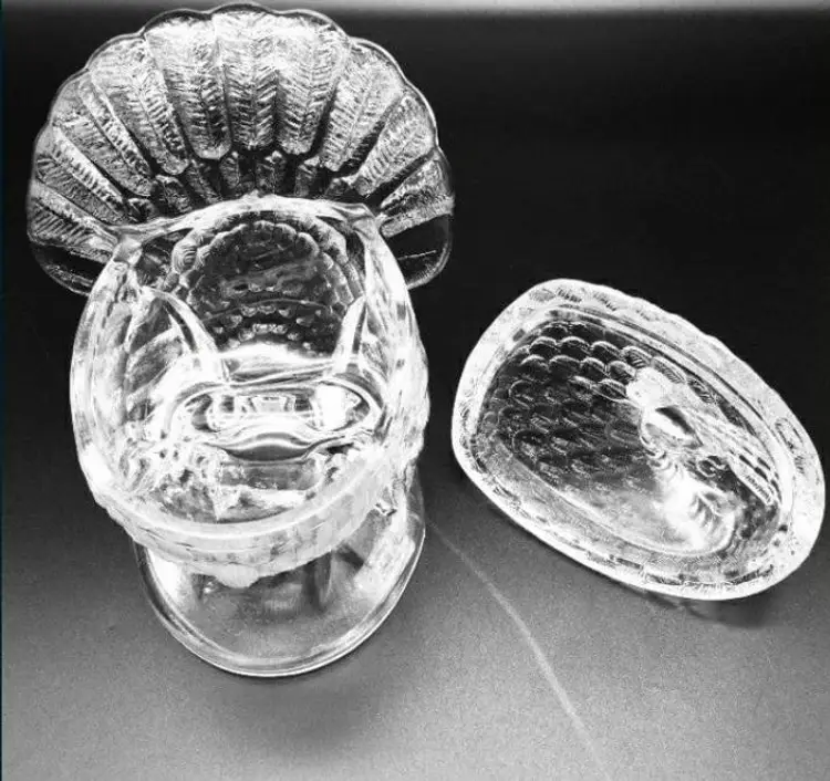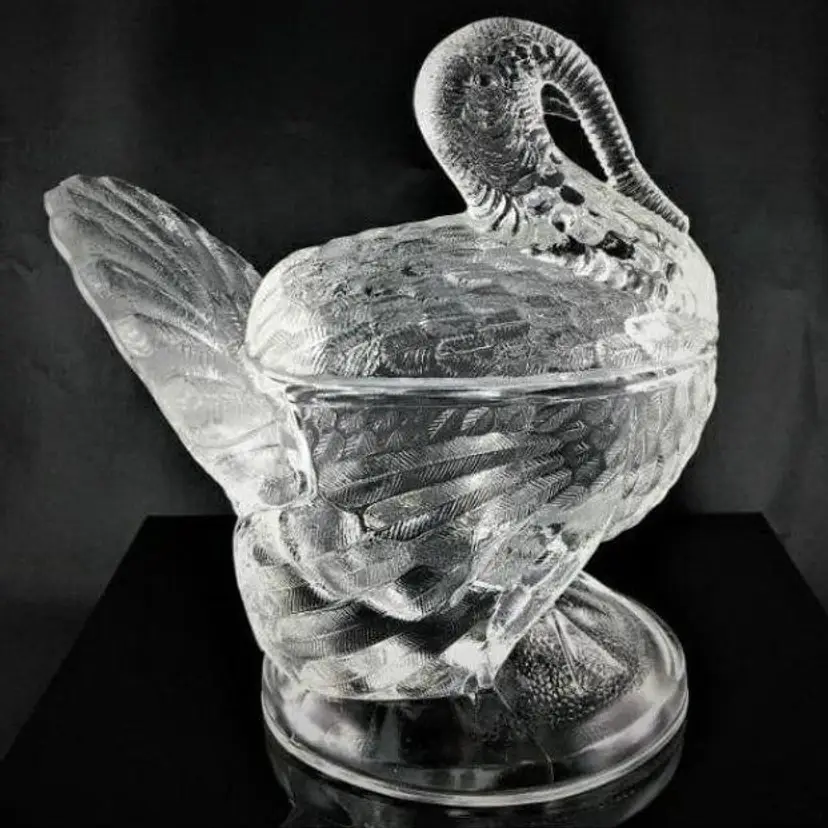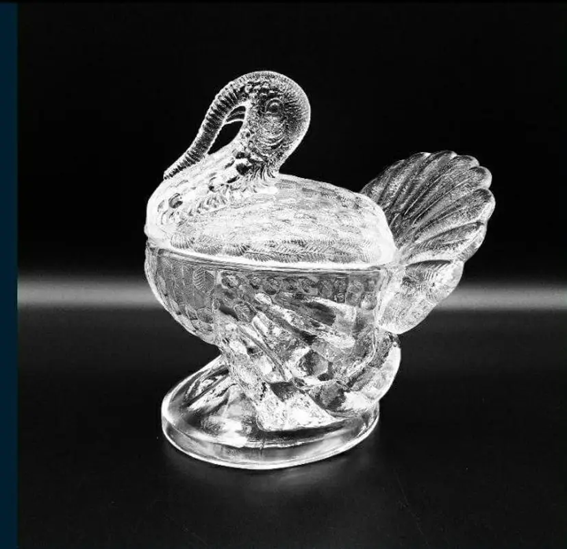 Vintage L.E. Smith Glass Turkey Candy Dish. Pressed / molded clear glass lidded candy / trinket dish. Beautiful glass turkey is very detailed with feathers on body with a feather fan tail. Circa 1940s Both pieces are in excellent condition with no chips, cracks or cloudiness. Measures approx. 7" tall x 6" wide x 3 1/2" deep. Will be awesome on your Thanksgiving table with some candy corn or cranberry relish in it all items from a smoke-free home with pets experienced fragile shipper