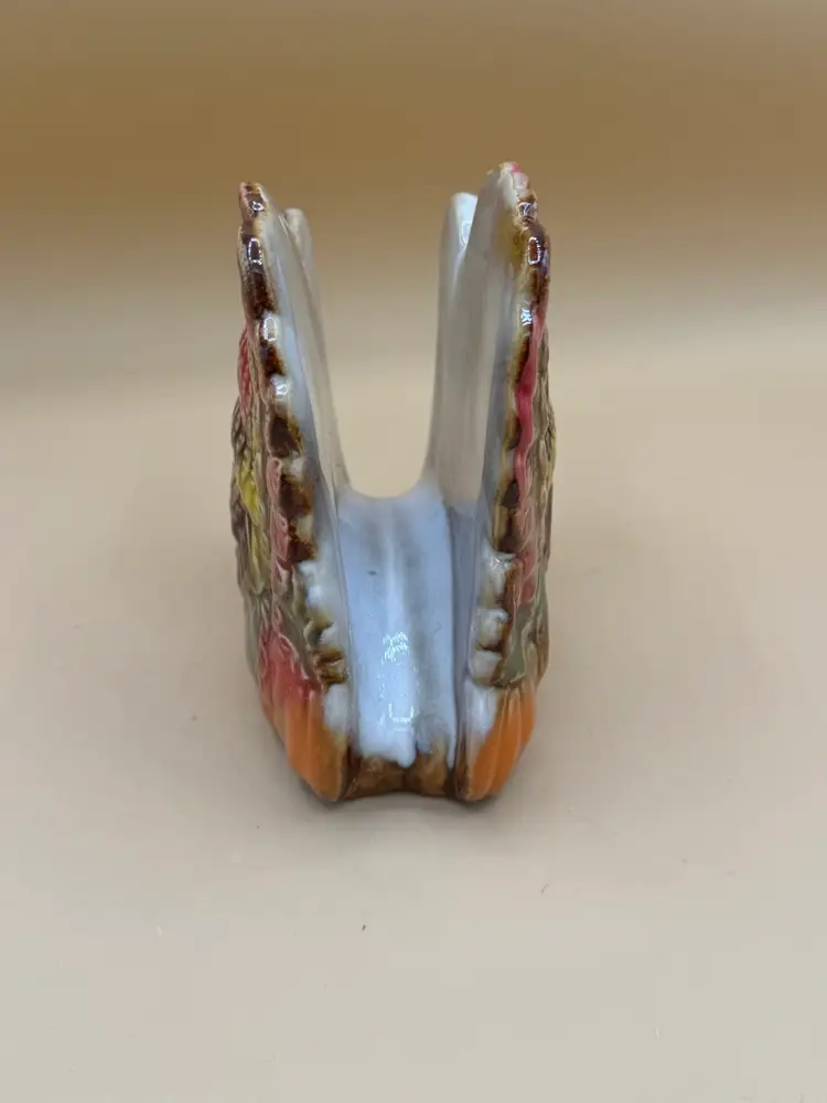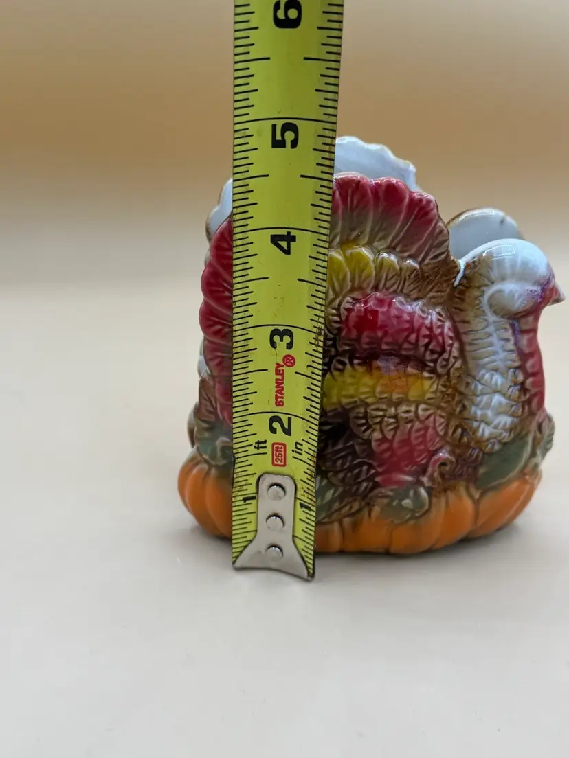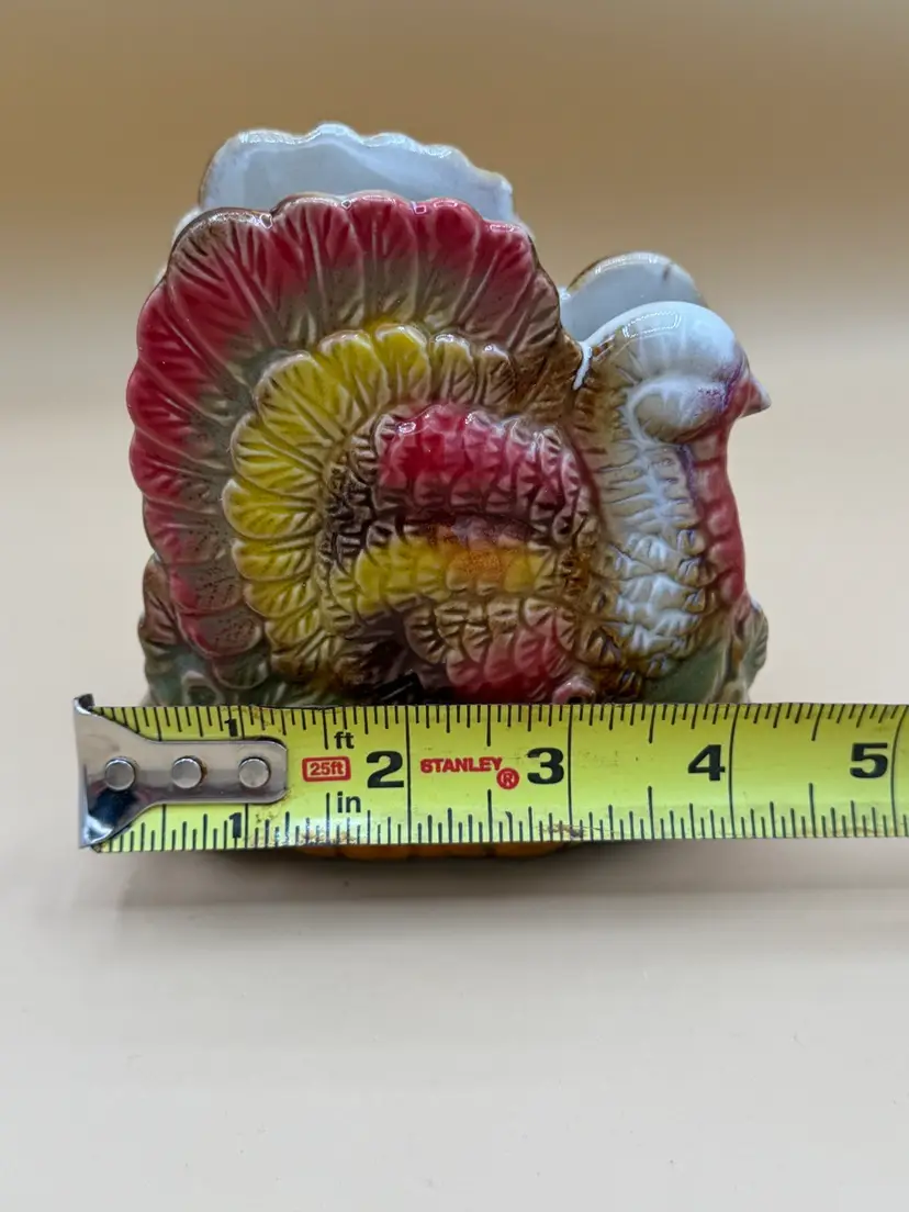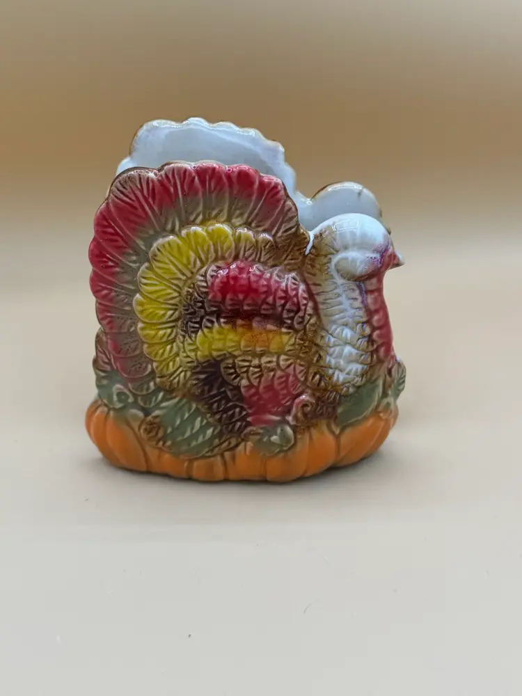 This ceramic turkey napkin holder has all the fall colors! He measures 4 1/2” tall and 4” wide. Good vintage condition with no chips or cracks noted.