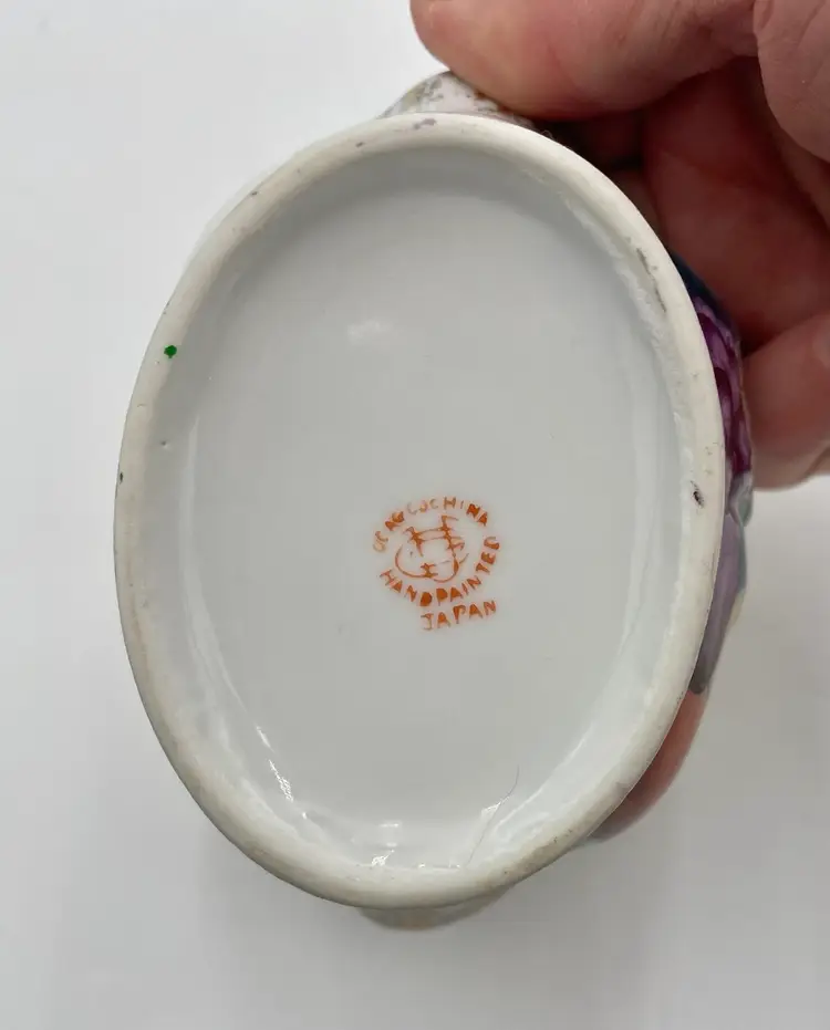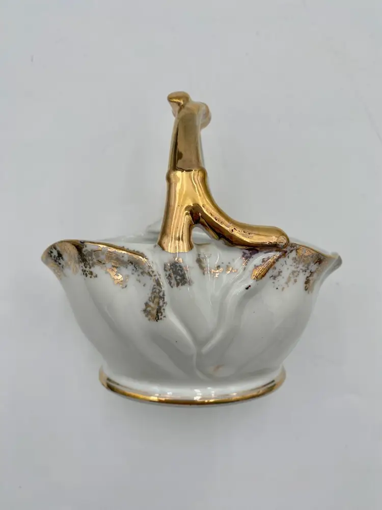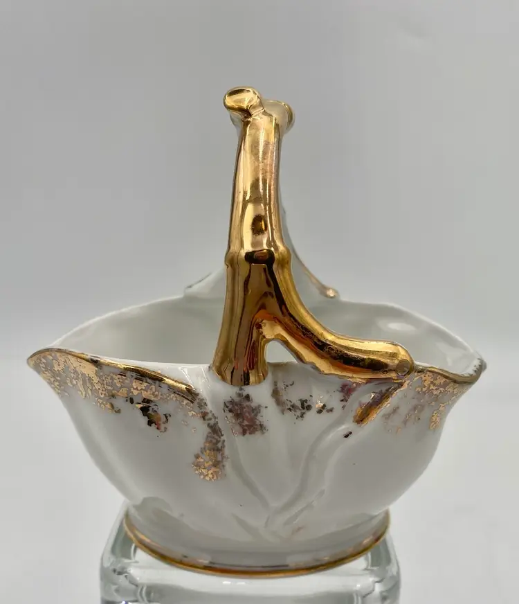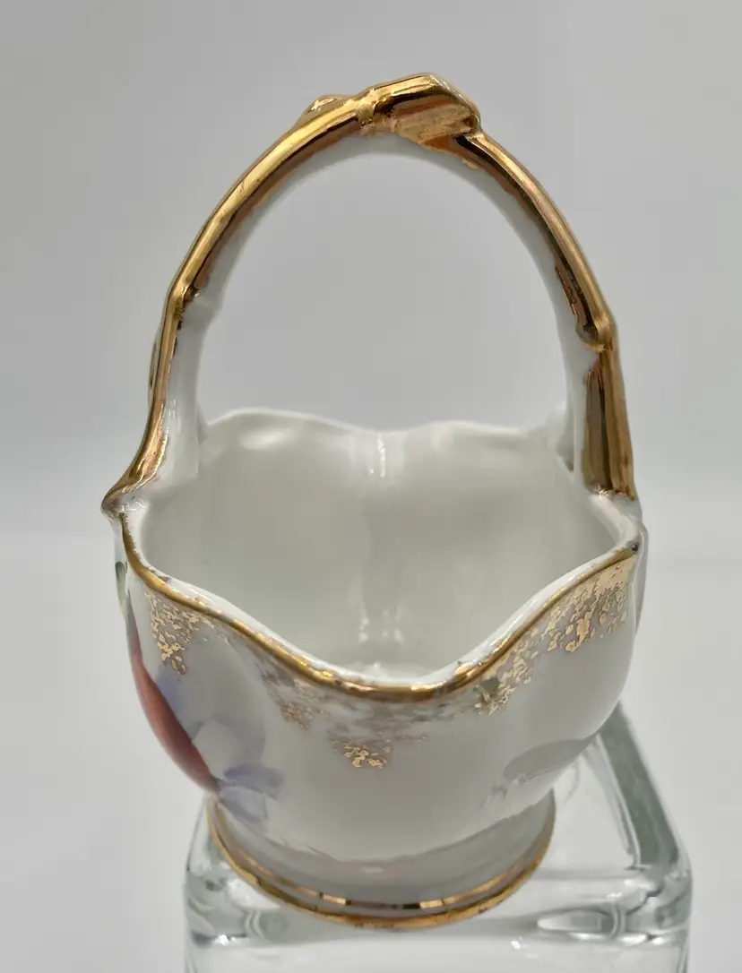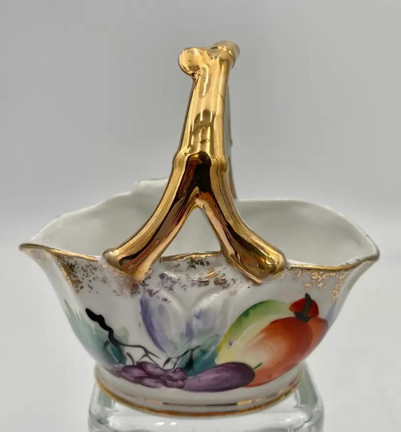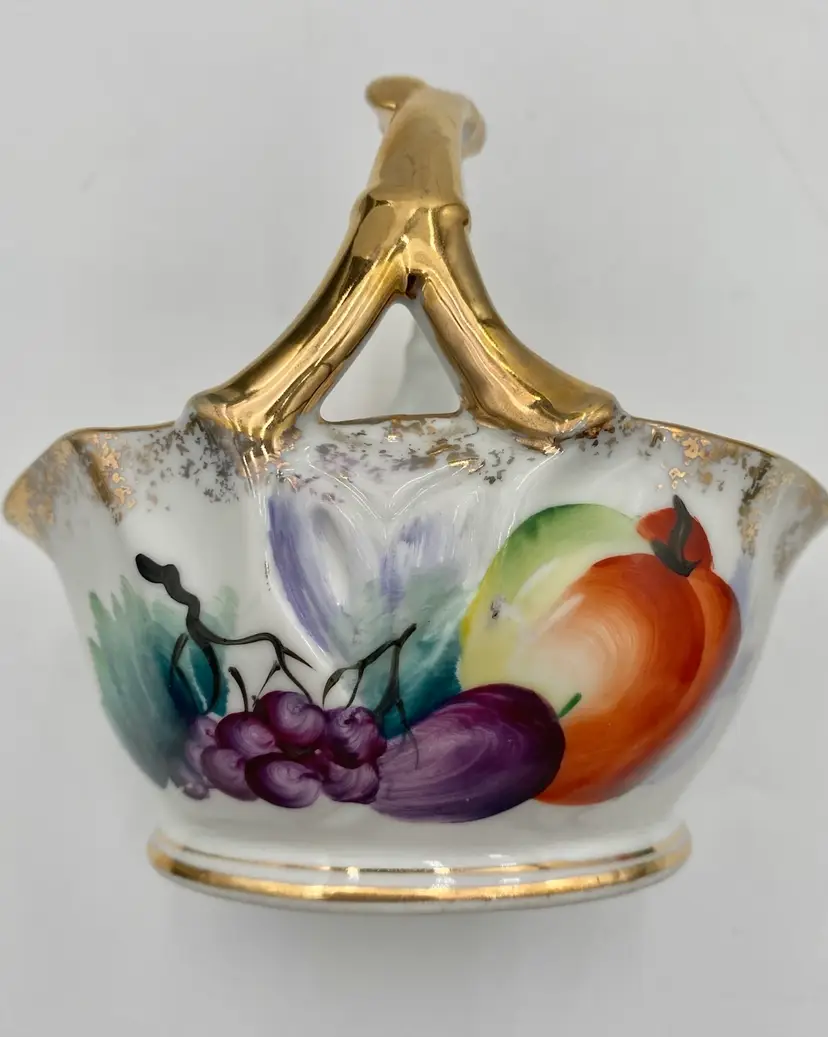 The vintage Ucagco Porcelain Basket with Hand-Painted Fruit and Gold Gilt is a decorative piece from the 1950s. The basket measures 4.7 inches in length and 4.5 inches in height. The handle is made to look like a fruit stem. The handle is painted with gold gilt and there is gold gilt spongeware design around the rim and a lines around the base.