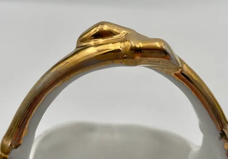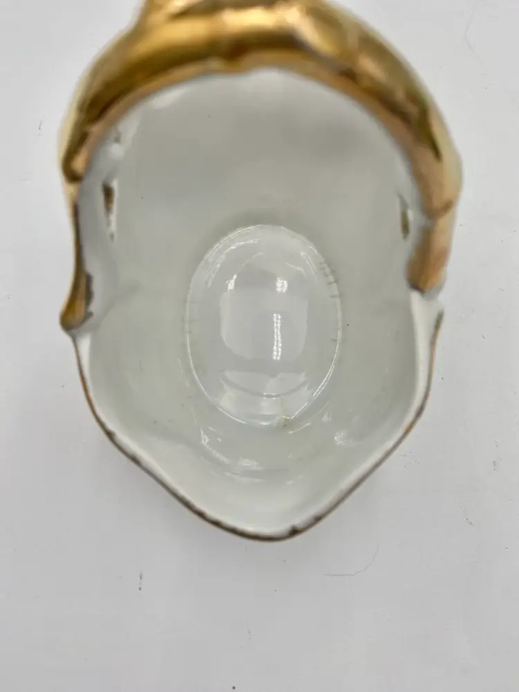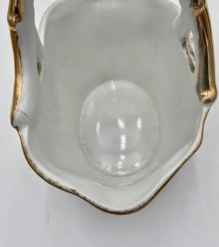 The basket is in very good condition. There are no chips or cracks. There is a little bit of gold gilt wear on the handle and some crazing along the inner edge of the base (see last two pictures).