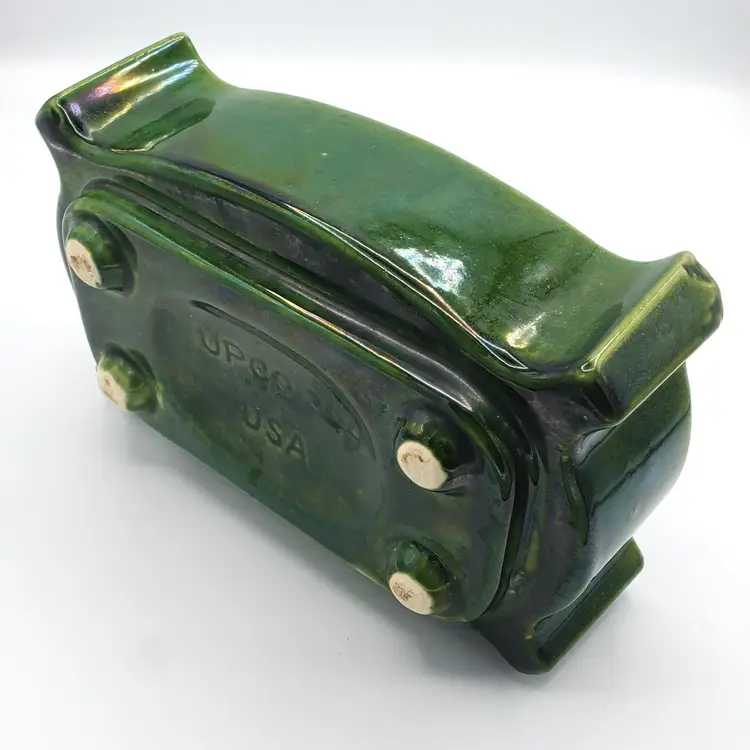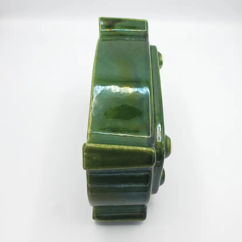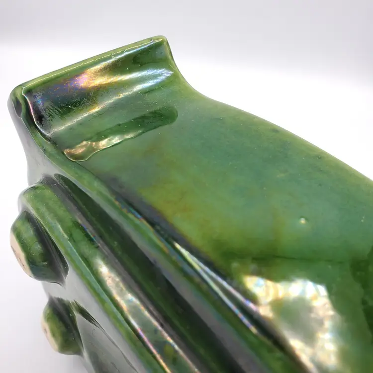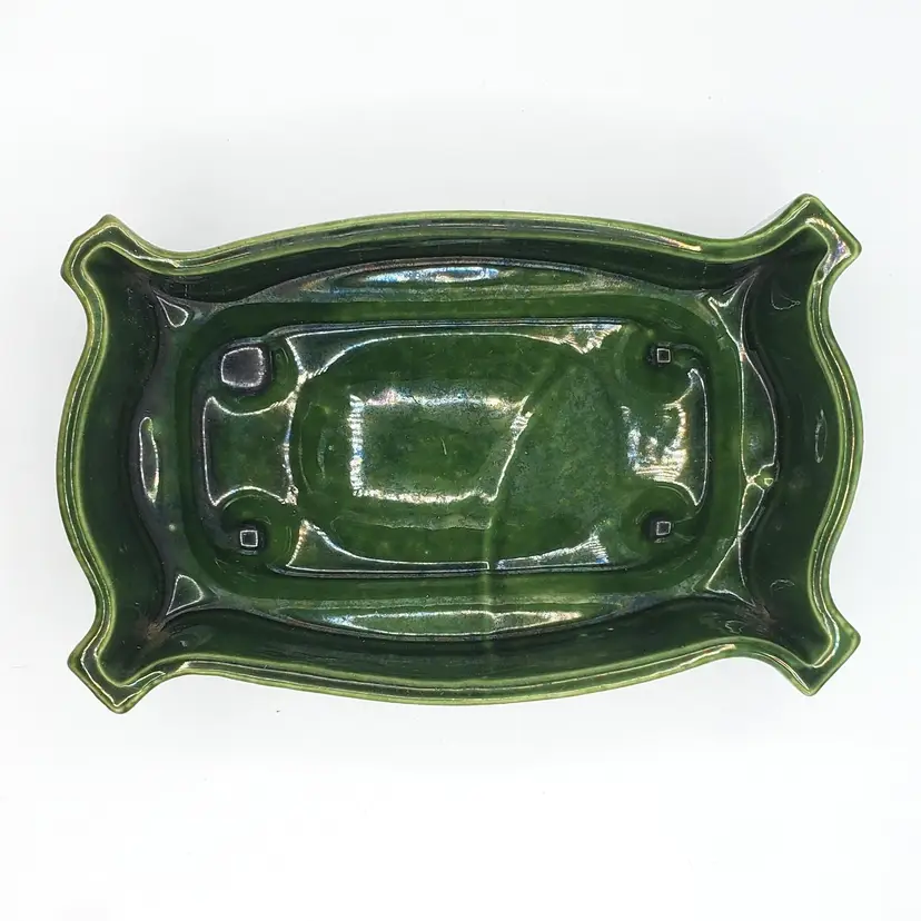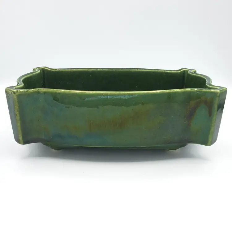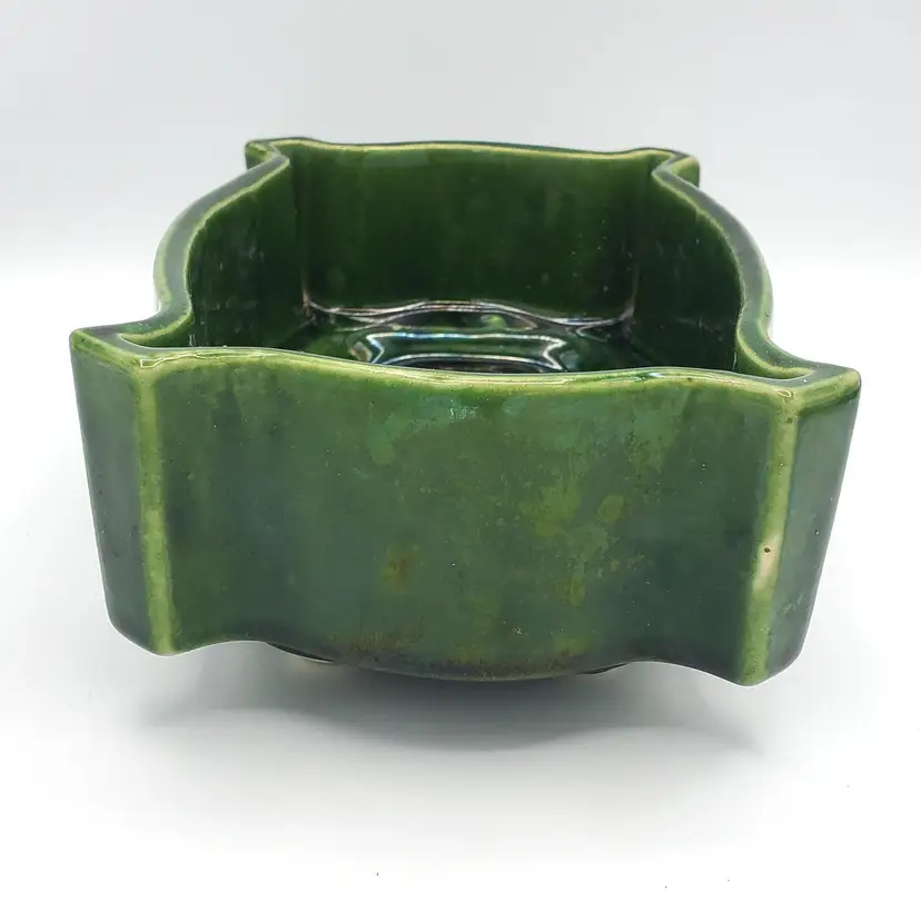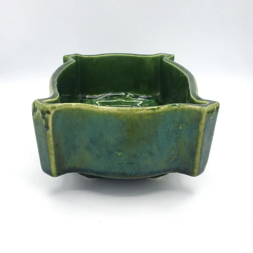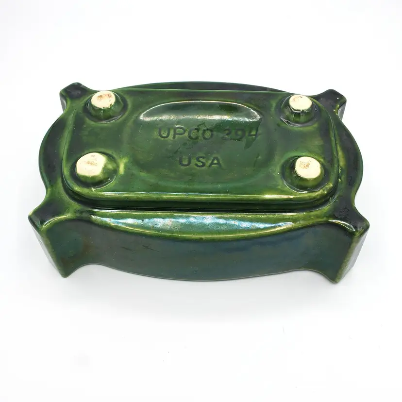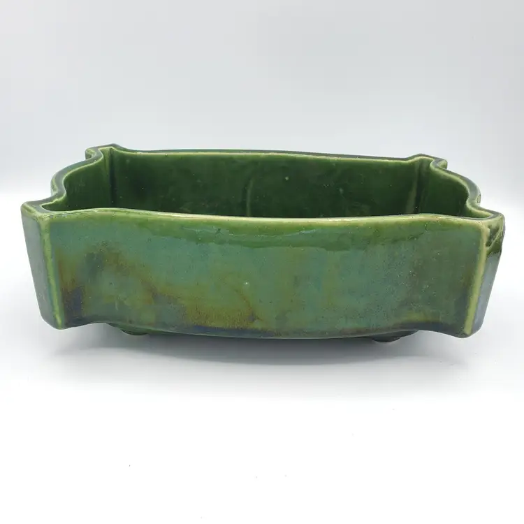 Here is a vintage ceramic planter from Upco. It has a low, rectangular shape which makes it good for a bonsai, although you still need to create proper drainage. The form is attractive with a footed base and pinched corners. There is a slight iridescence to this planter as well. It measures 8" x 5" and is about 3" high. Thanks for looking!