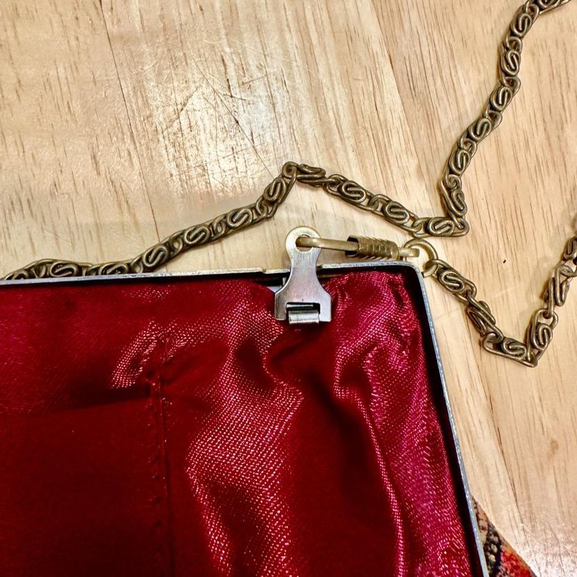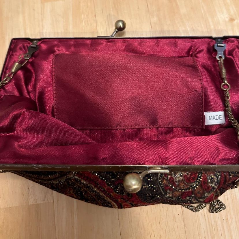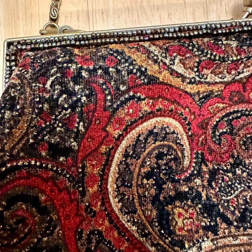 Introducing a unique vintage purse that will add a touch of glamour to any outfit. This stunning piece features a beautiful paisley design made of velvet material and adorned with gold beading trim for an elegant finish. The purse is equipped with a chain strap and inside pocket. Its style is perfect for those who want to make a statement and stand out from the crowd. A perfect dress-up and holiday accessory.