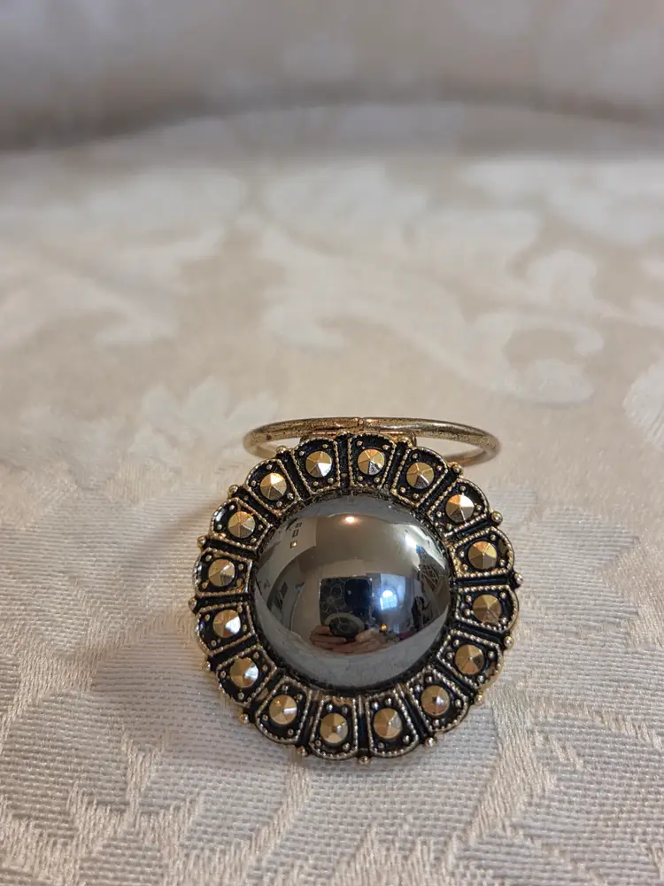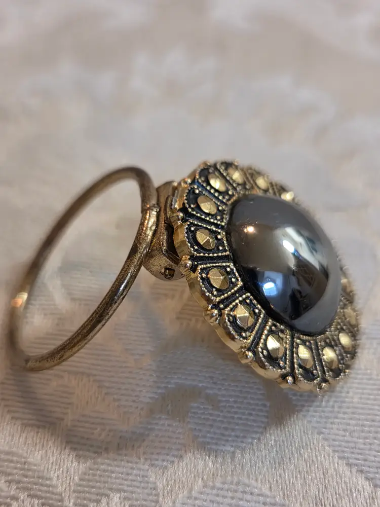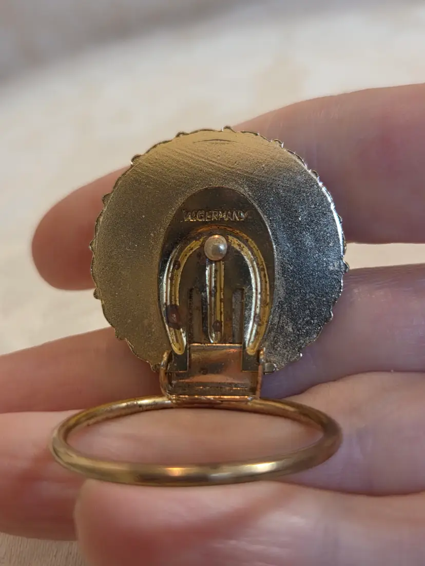 Vintage marked W. Germany hematite and marquisate gold tone scarf clip. Back has some wear, hematite has slight wear in one spot. All marquisate is there. Would consider it good used condition. Scarf clip measures approx. 1" high and 1" wide.