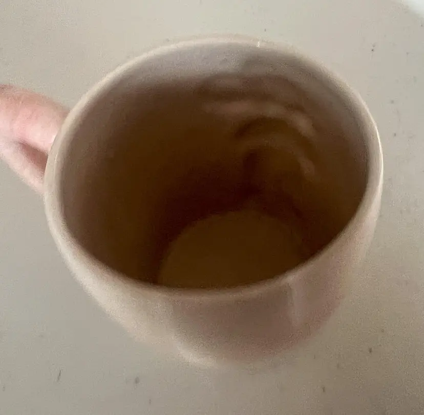 Off- white ceramic with pink handle. Appx. 3.5" tall, 2 7/8" across top