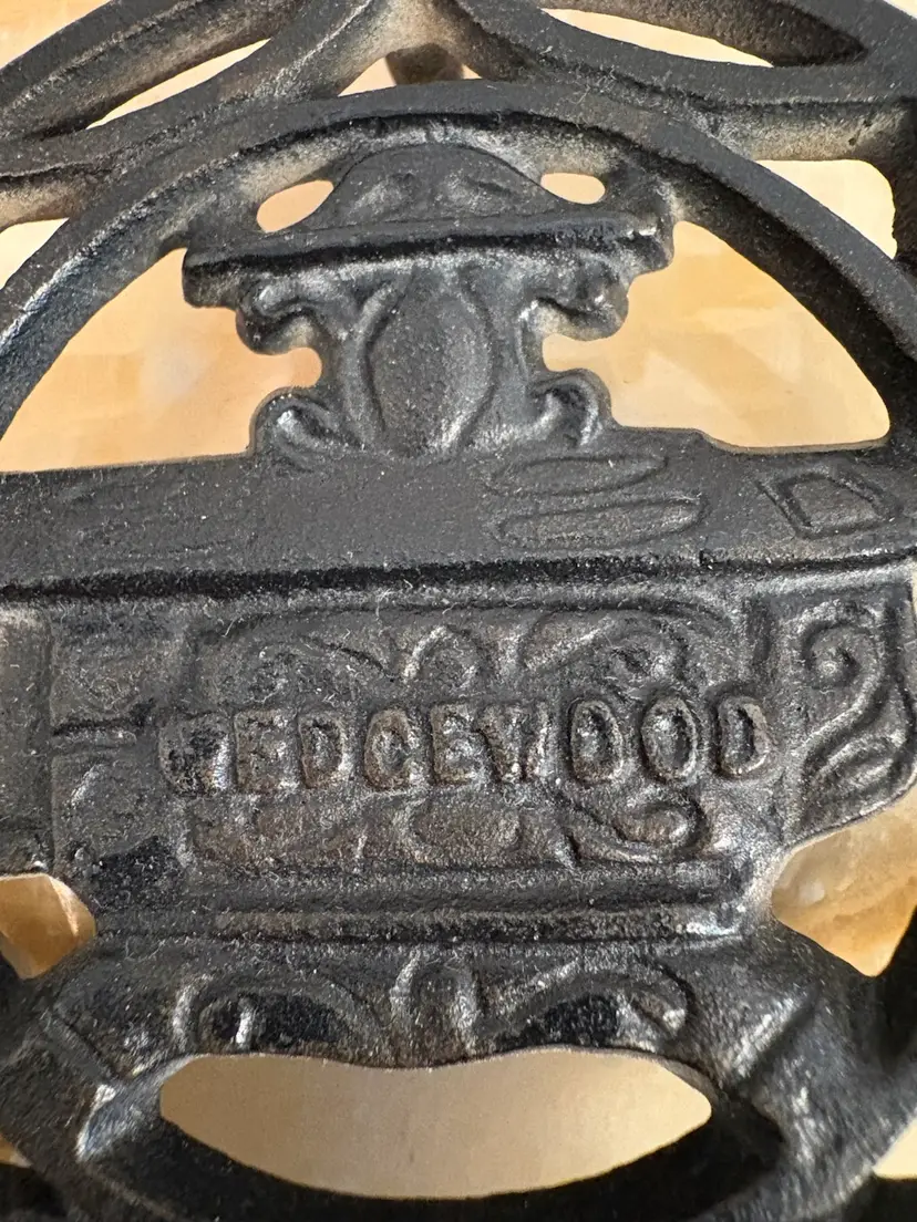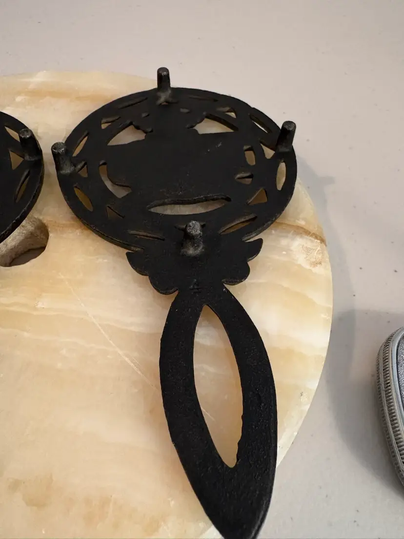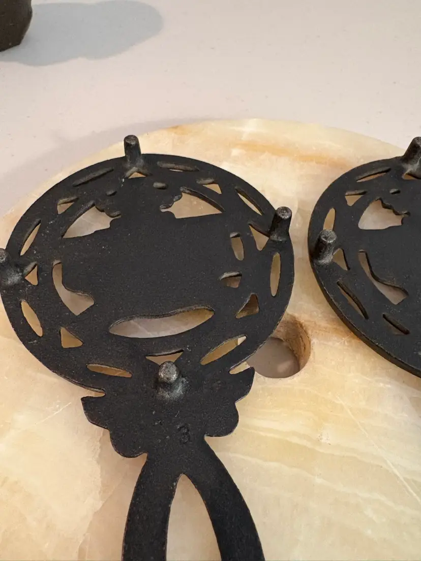 A pair of Miniature cast iron trivets. Measures about 5.5" long, with a 3" diameter.