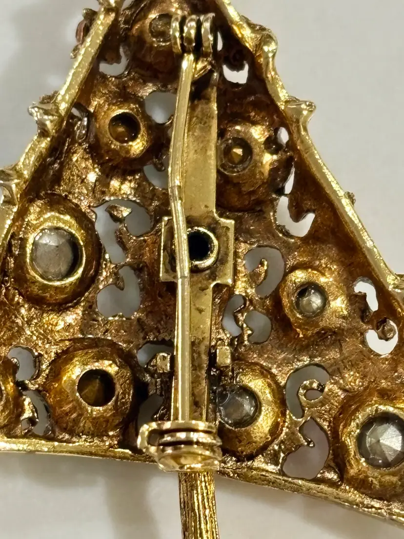 Details: • Brand: Weiss • Design: Christmas Tree • Material: Gold-tone metal with multicolor rhinestones • Size: Approx. 2.25” tall x 1.75” wide • Condition: Excellent vintage; slight bend to pin, fully functional • Era: Likely 1950s–1960s