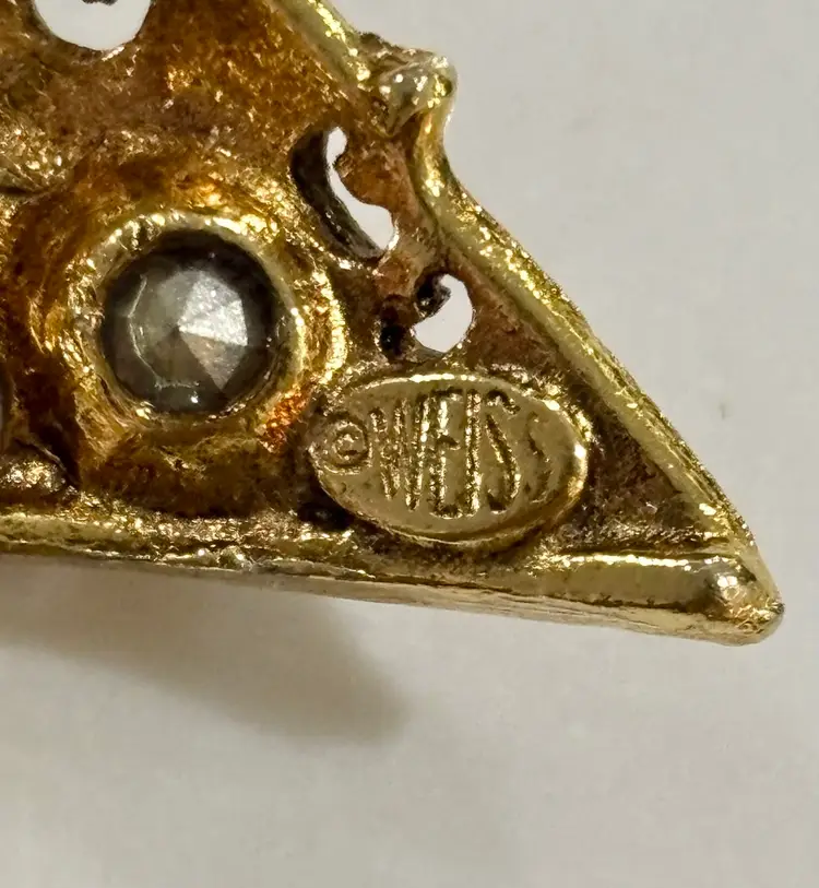 The brooch is in excellent vintage condition, with all stones intact and bright. The pin is slightly bent but functions perfectly and holds securely. Marked © WEISS on the back, this piece is an authentic example of Weiss’s mid-century craftsmanship and holiday charm.