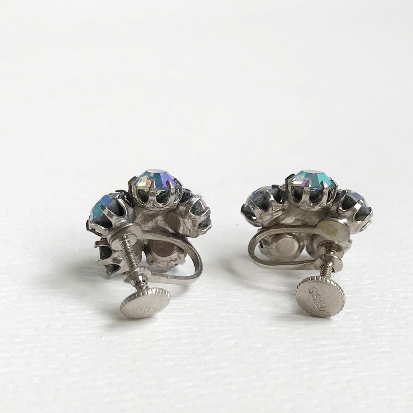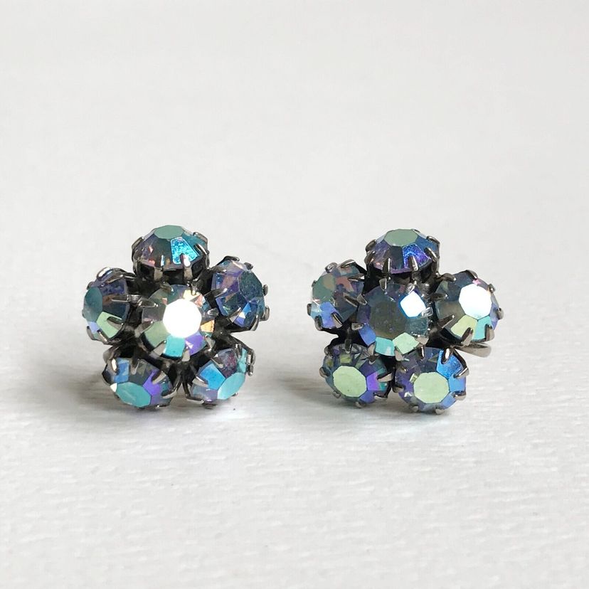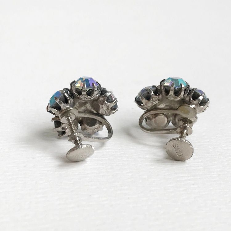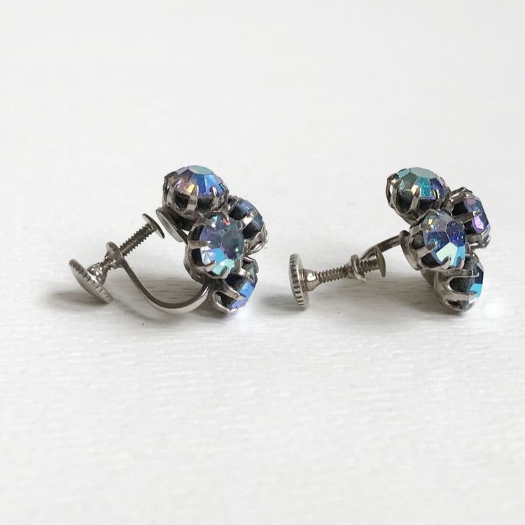 Weiss silver tone screw back earrings with prong set aurora borealis blue glass stone.