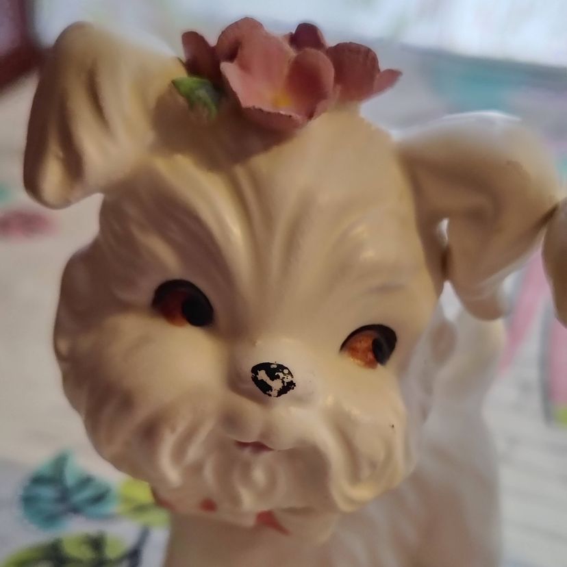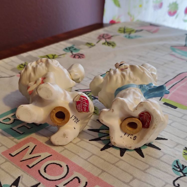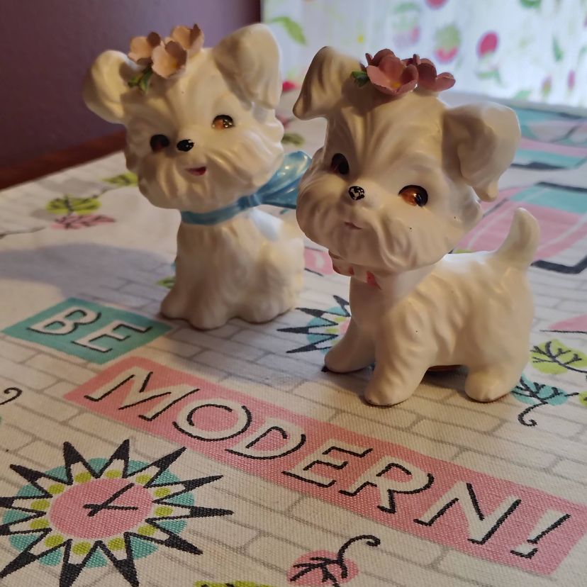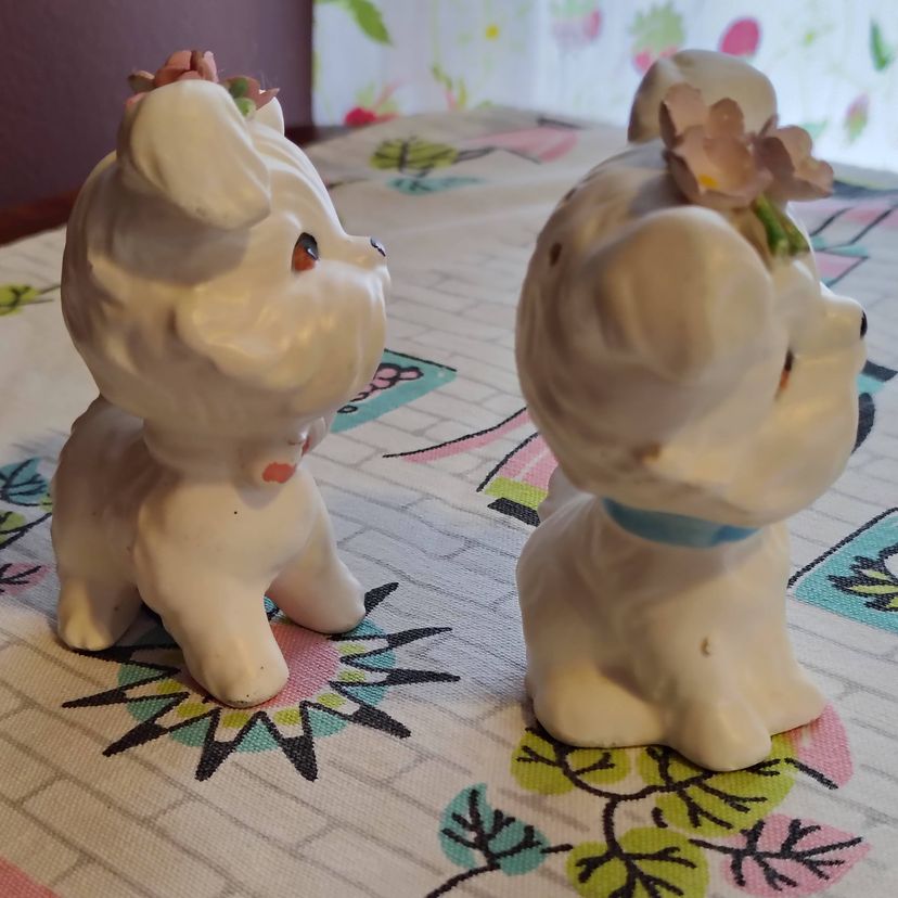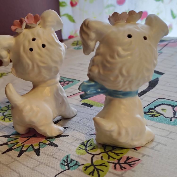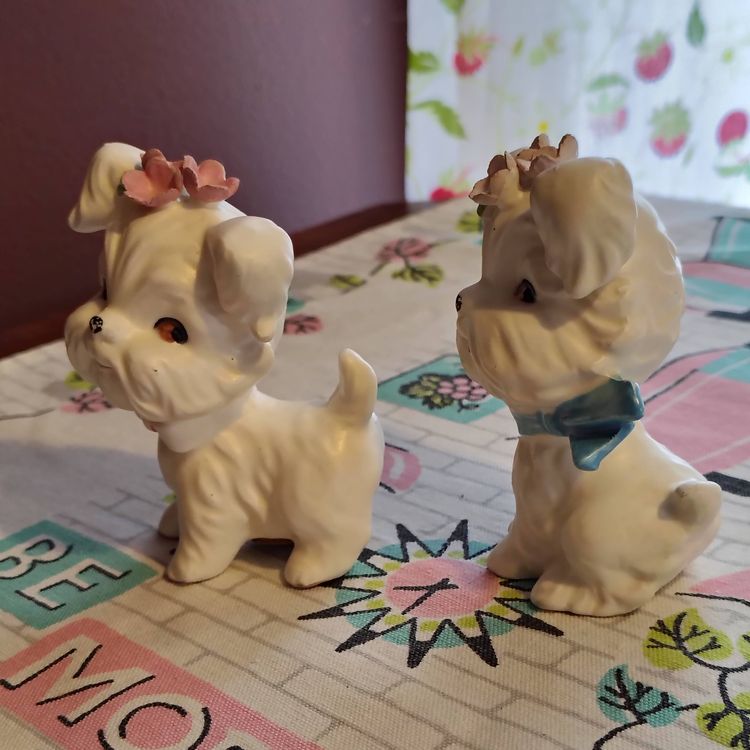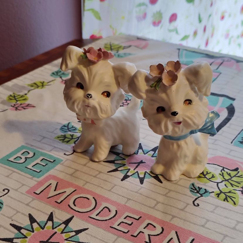 This is a vintage salt and pepper set, shaped like the cutest little doggies! Made in Japan during the 1960s, for Lefton, these little fluffy white pups appear to be West Highland Terriers. Well groomed and absolutely charming, these little ones each have scarves and a small bouquet of pink flowers on their heads. So sweet! Condition: This pair is in Excellent shape! There are no chips, cracks, or any other damage that I could find. Those fluffy ears and delicate flower petals seem to be completely intact. The only thing that I could spot at all is that a little of the cold paint has worn off their noses and scarves. Size: Both are posed a little different. The little boy dog measures 2¼" across, is 2¼" wide, and 3½" tall, while the little girl dog measures 2½" across, 2" wide and stands 3½" tall.