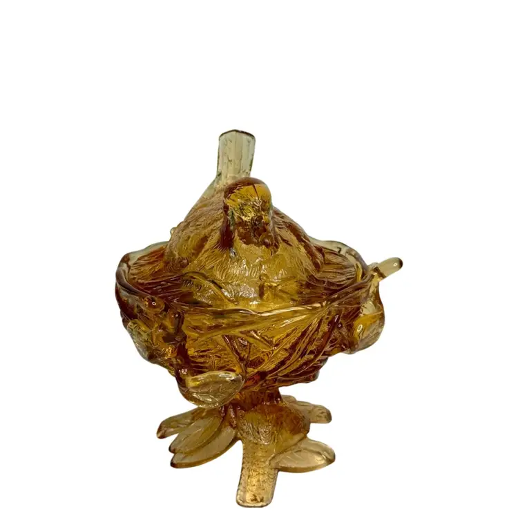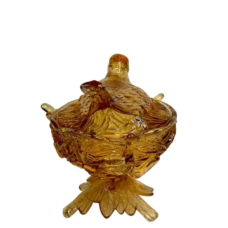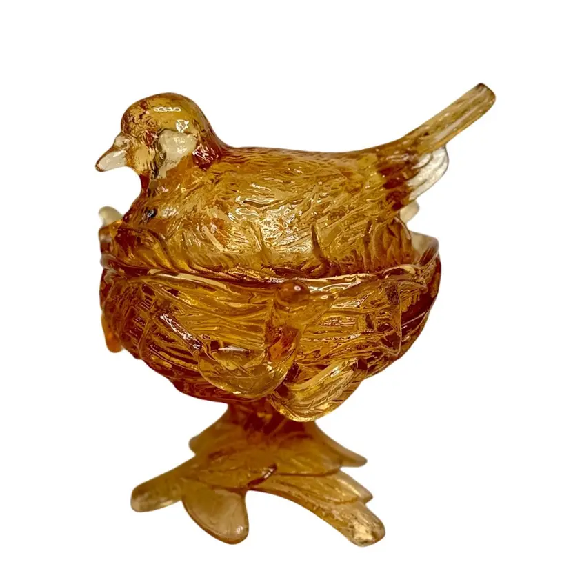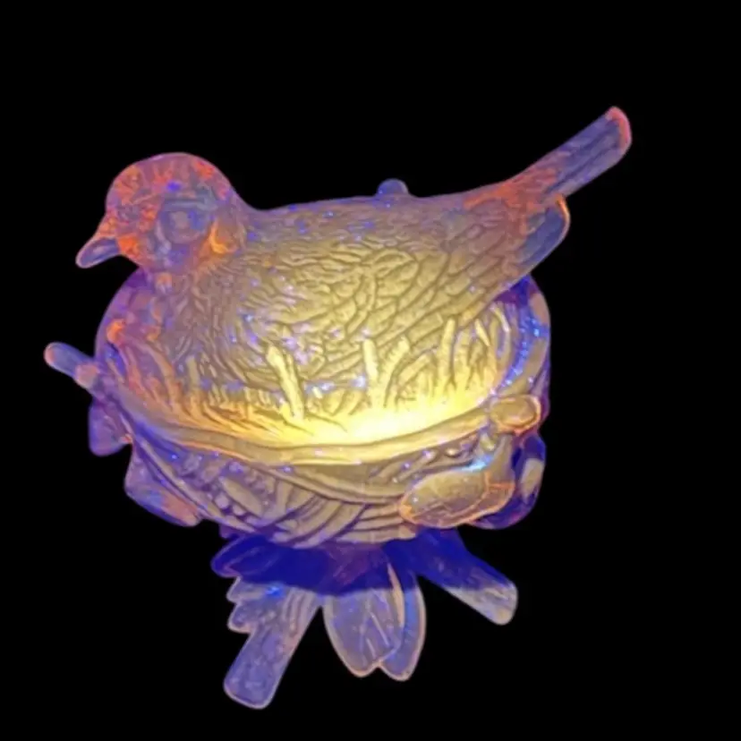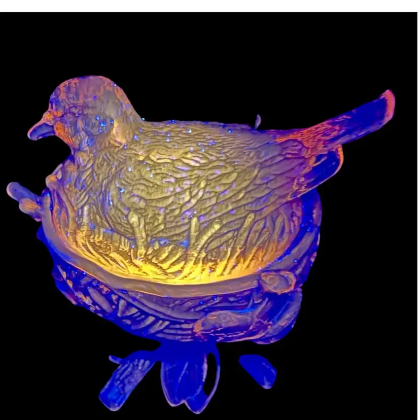 This Vintage Westmoreland Bird On Nest Glass Covered Candy Dish is a charming piece of Mid-Century Modern decor. Perfect for storing candies or treats while adding a touch of vintage flair to your home. Some UV Glow with 365 black light.