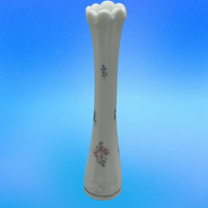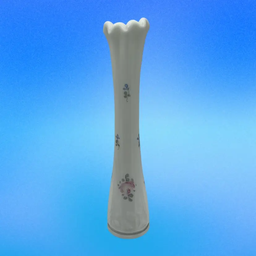 Featuring a milk glass paneled design with hand painted floral accents of pink roses and forget me nots. Excellent condition!