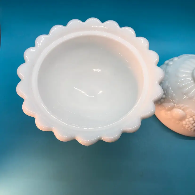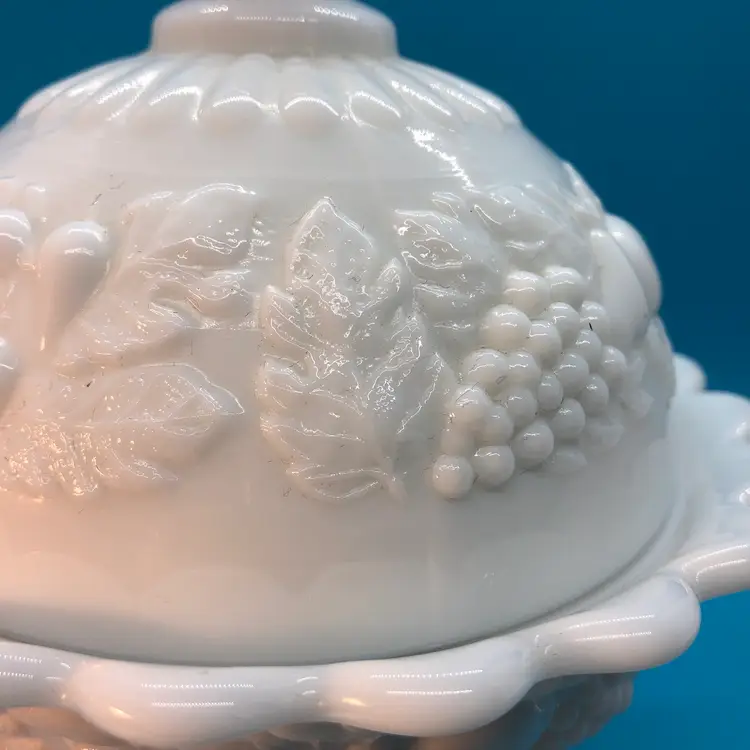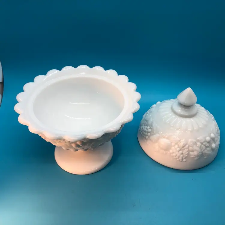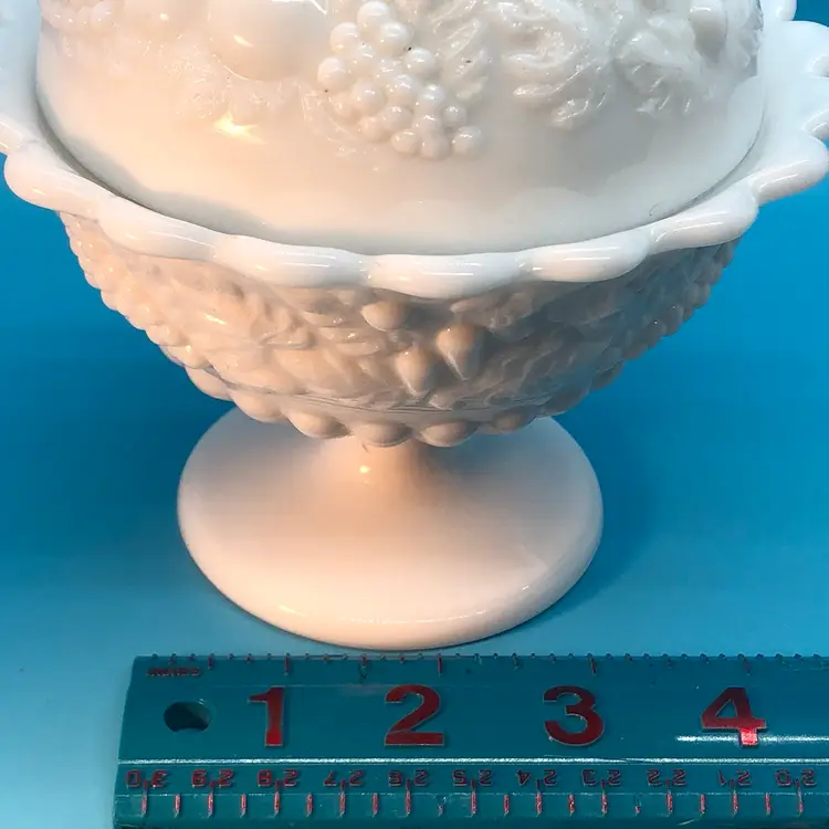 This vintage Westmoreland candy dish is a beautiful addition to any collection. The milk glass pedestal dish features a raised fruit pattern and comes with a lid. It is a round, white dish with one compartment and is an original piece from the 1960-1969 time period. The production style is milk glass and it is a great example of vintage décor. This dish is perfect for displaying candy or other small treats and would make a great gift for any collector. This piece is in great condition and has no chips or cracks. Please check photos. Thank you 😊