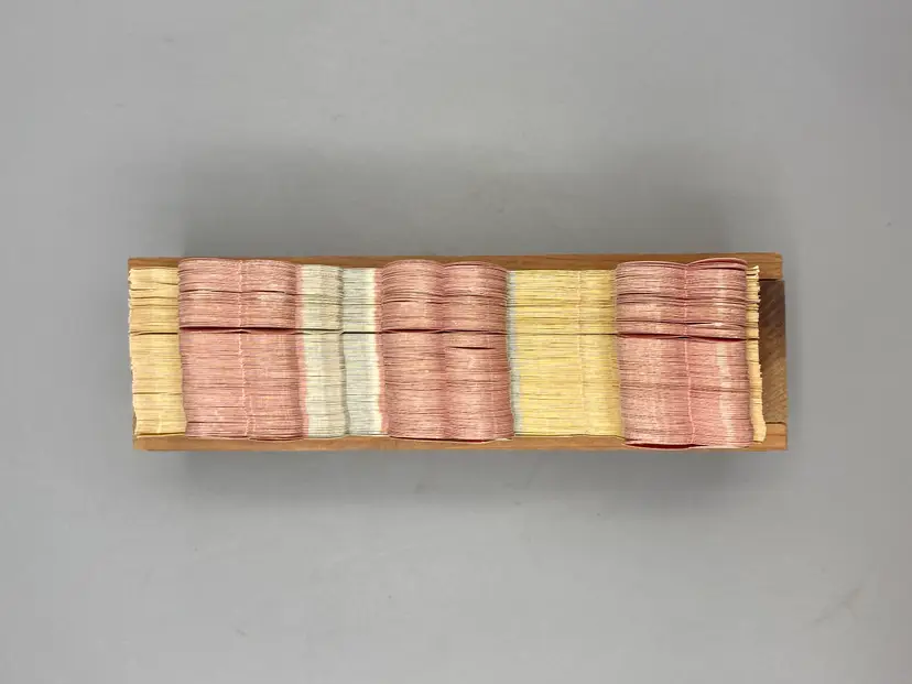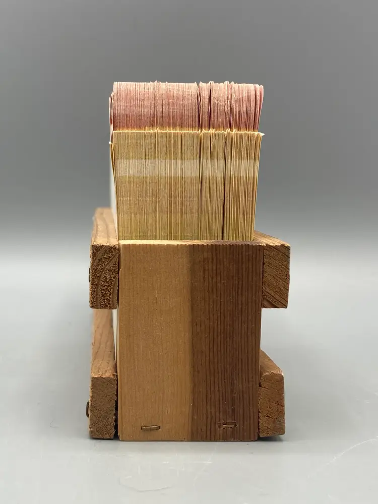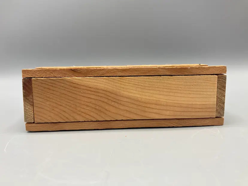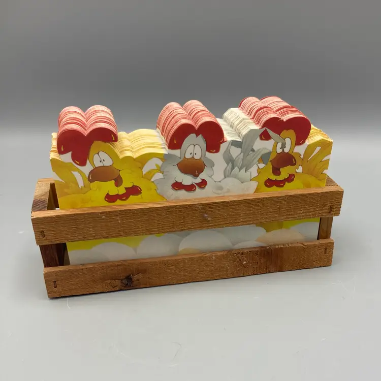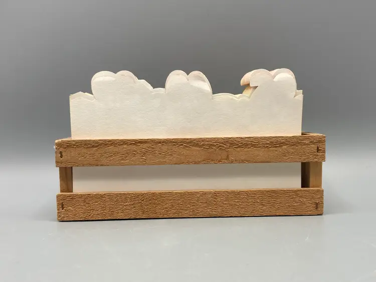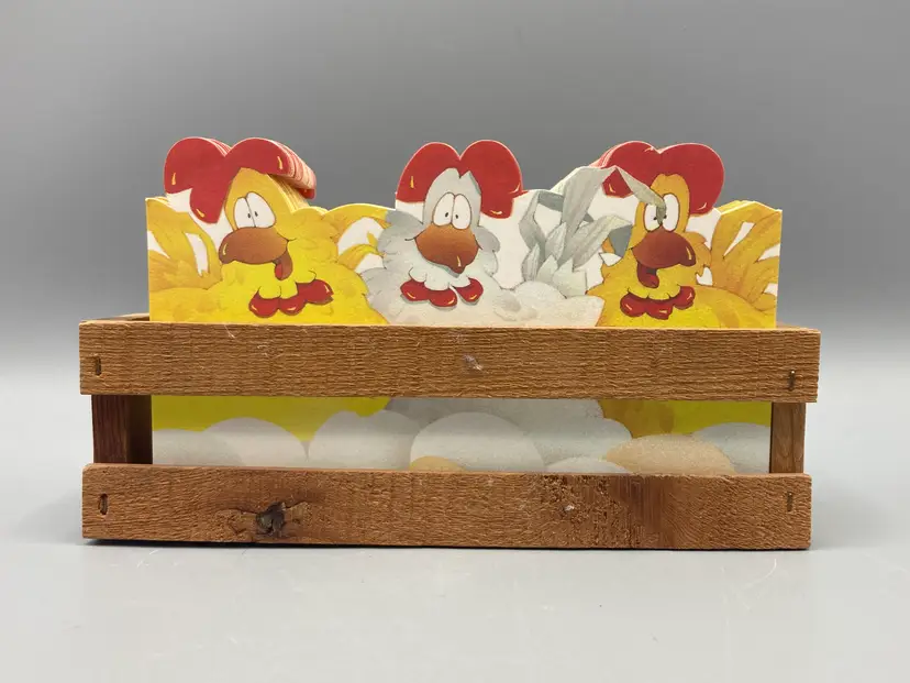 This set of note papers is in good condition. The wooden "crate" is loose on one side but could be easily fixed with a little glue or a new mini nail. The overall measurements are approximately 6" long x 1 3/4" deep x 3 1/4" tall. The paper itself is approximately 5" x 3".