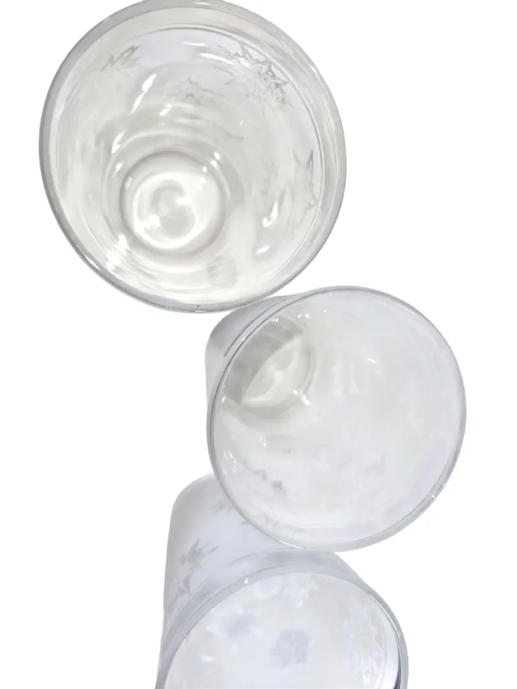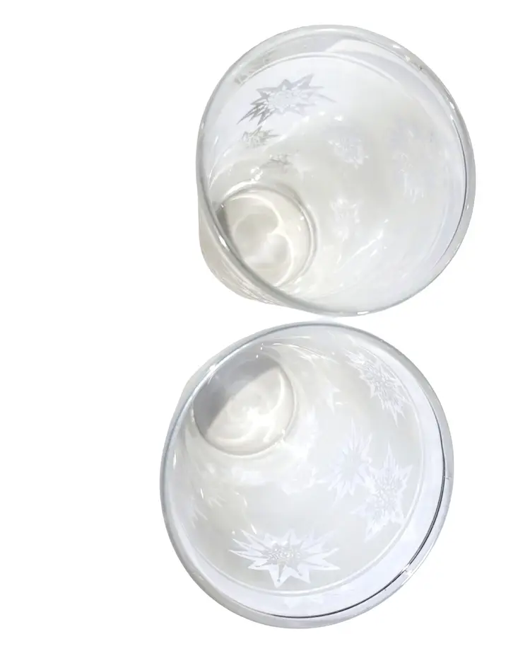 A charming set of frosted tumblers featuring the iconic atomic snowflake design, these mid-century glasses add a nostalgic touch to any vintage collection.