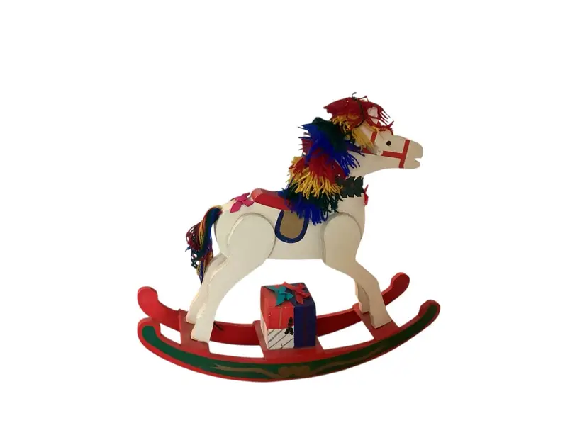 This Vintage White Wooden Rocking Horse with a Rainbow Mane and Tail is a charming addition to your Christmas decor. Made with mixed materials including wood, this rocking horse features a classic white color and intricate details. Perfect for collectors or holiday enthusiasts who appreciate unique and nostalgic pieces, this vintage ornament adds a touch of whimsy to your seasonal display. Measuring 9x10 inches, this rocking horse is sure to bring joy and nostalgia to your holiday celebrations.
